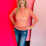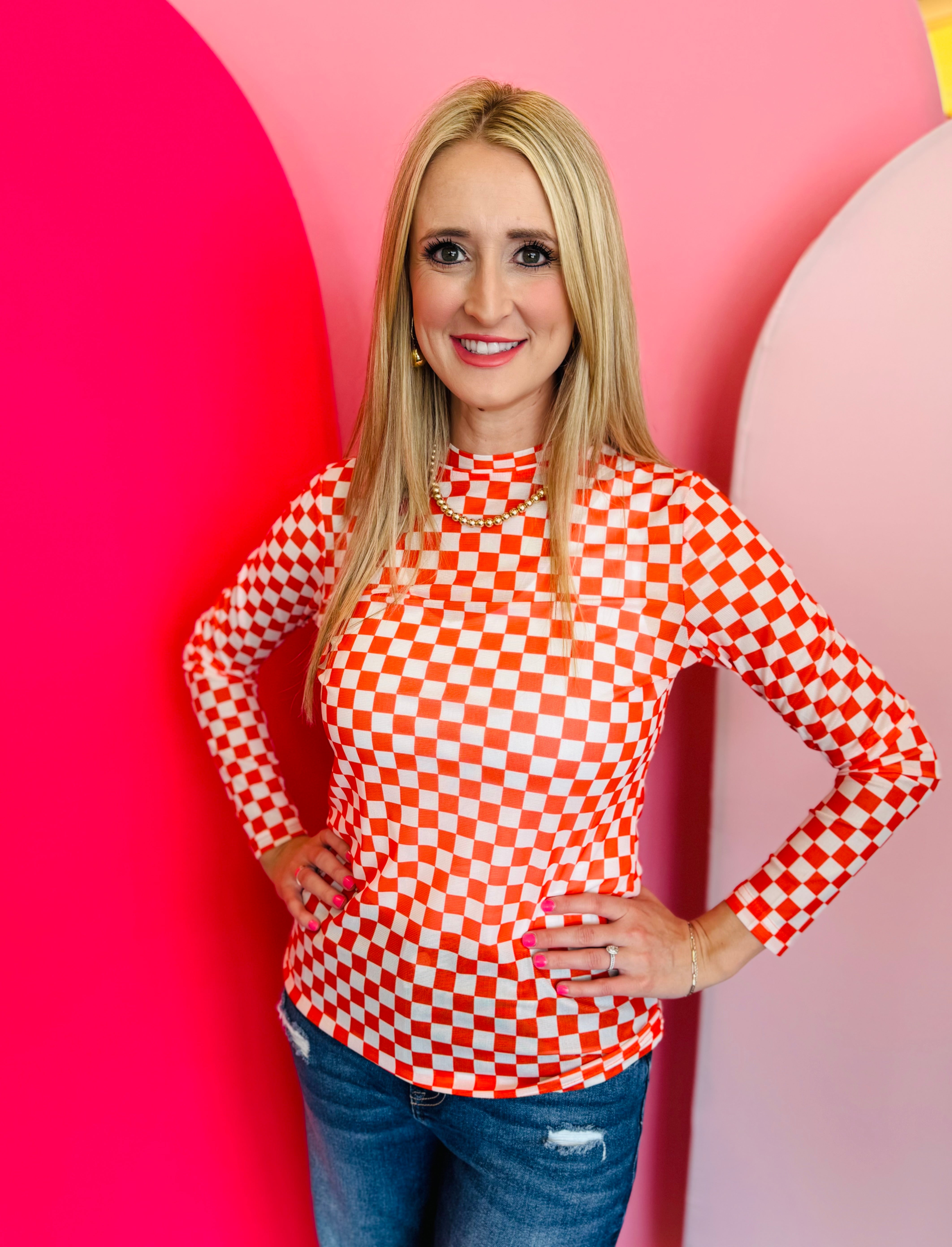 Get ready to 'cheer' on the style game with our Pep Rally Mesh Top! This orange and white checked top will surely add some 'zest' to your wardrobe. Made with breathable mesh, it's perfect for those hot summer days. So why 'check' out the competition when you can stand out with our top!