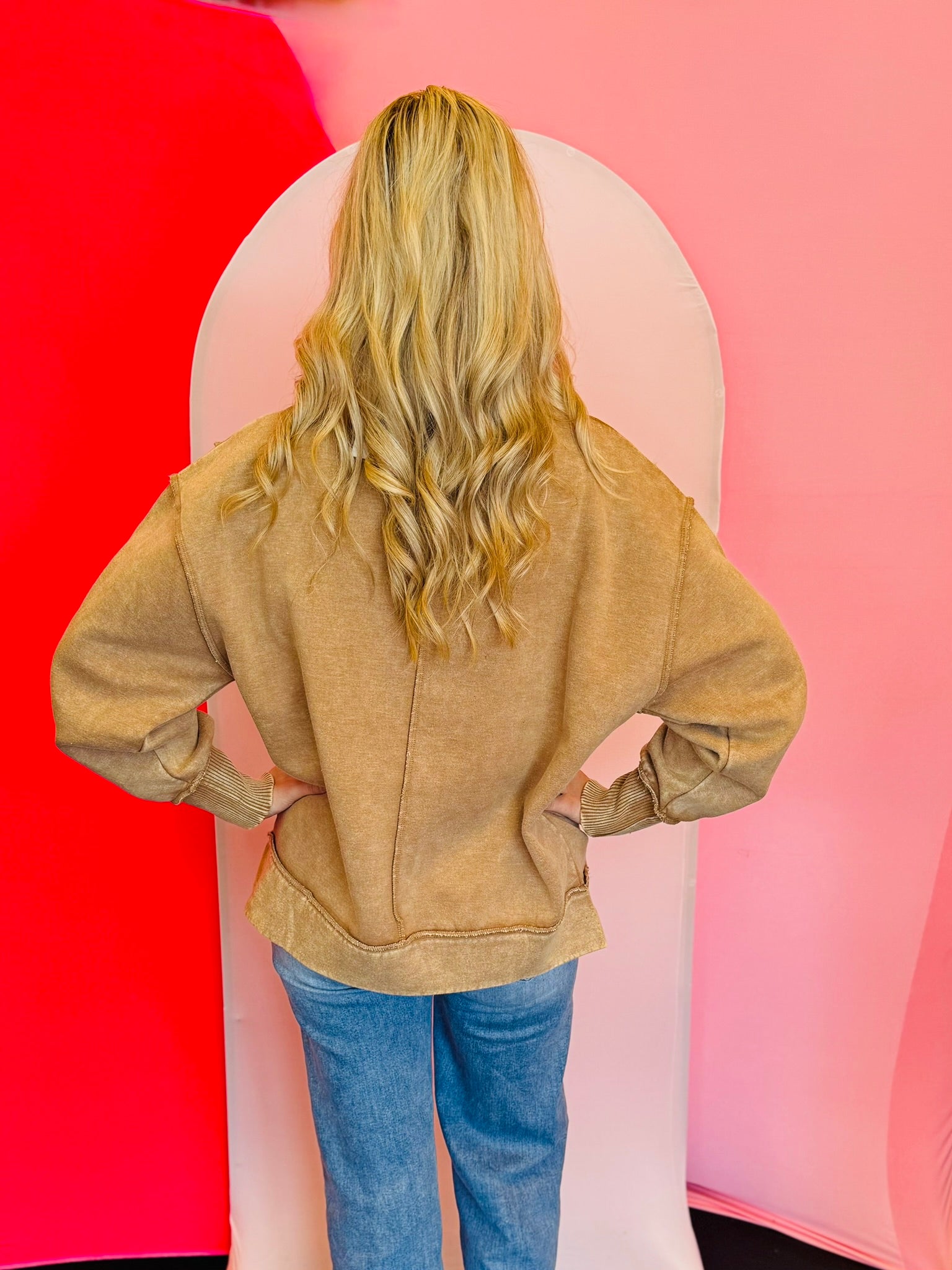 Looking for a cozy yet stylish sweatshirt? Our Camel Acid Wash Fleece Sweatshirt is a comfortable and trendy essential. This standout piece features eye-catching exposed seams and a laid-back, relaxed fit perfect for everyday wear. The warm camel hue offers a chic, neutral pop of color, while the unique washed finish ensures each sweatshirt is a one-of-a-kind piece. Made from a soft, breathable fabric blend, this versatile layer is easy to style for any season, making it a wardrobe staple.