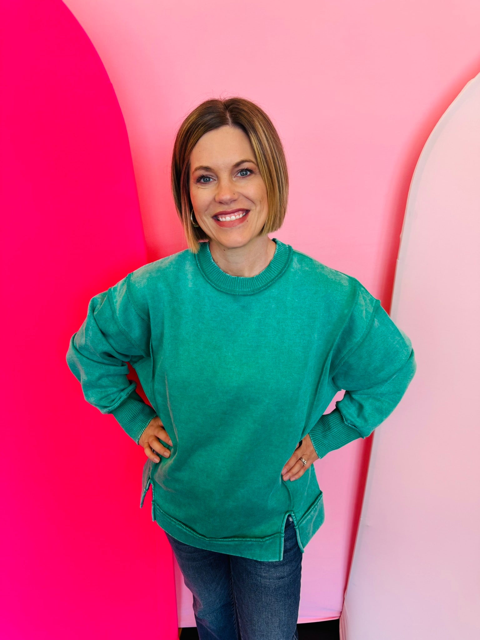 Trendy acid wash finish in a versatile kelly green color.