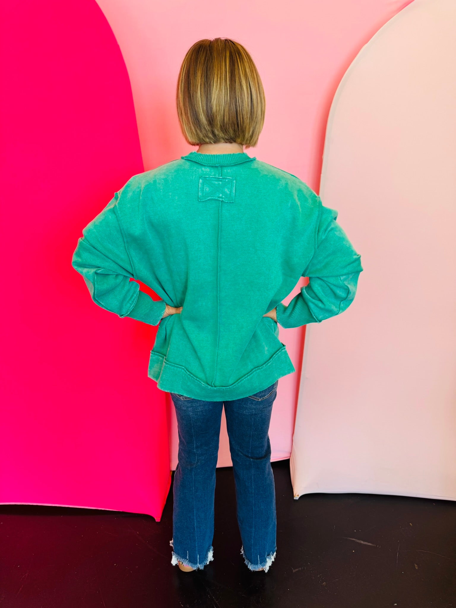 Our Kelly Green Acid Wash Fleece Sweatshirt is a comfortable and trendy essential. This standout piece features eye-catching exposed seams and a laid-back, relaxed fit perfect for everyday wear. The bold kelly green hue offers a vibrant pop of color, while the unique washed finish ensures each sweatshirt is a one-of-a-kind piece. Made from a soft, breathable fabric blend, this versatile layer is easy to style for any season, making it a wardrobe staple.