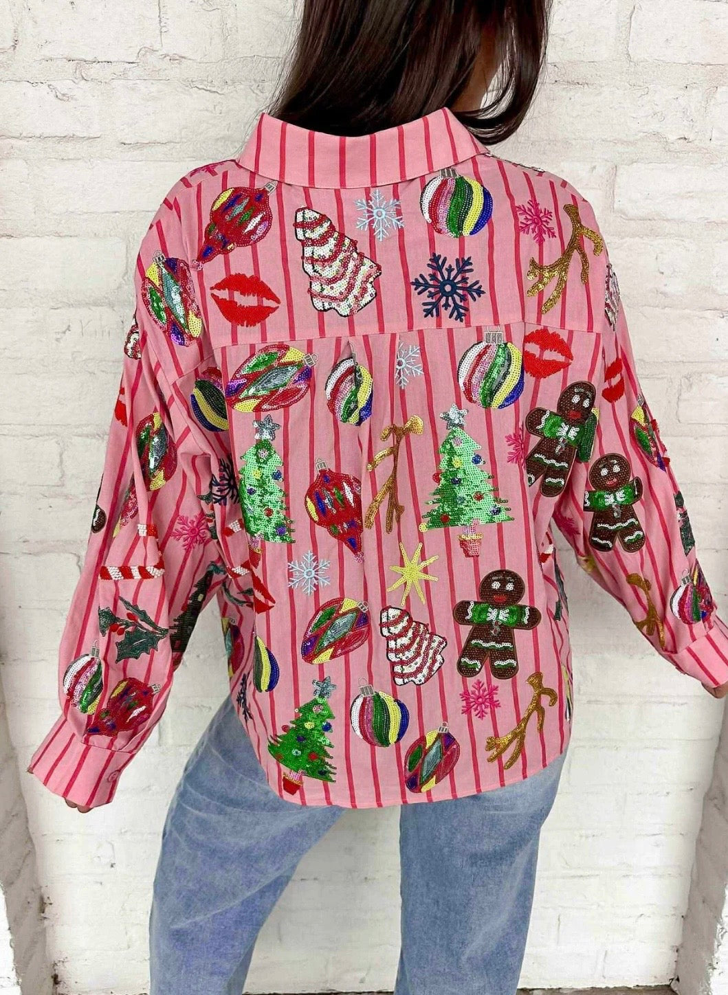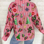 Shine bright this holiday season with the Queen Of Sparkles Light Pink & Red Stripe Christmas Icons Button Up Top. Crafted from 100% cotton for a soft, breathable feel, this festive blouse features cheerful pink and red stripes adorned with sparkling sequin holiday icons—including Christmas trees, ornaments, gingerbread men, candy canes, snowflakes, and mistletoe. Each sequin detail catches the light beautifully, adding a touch of glam to your seasonal style. The button-up front and collared neckline give it a polished finish, making it perfect for pairing with jeans, skirts, or tailored pants for any holiday event. Celebrate the season in style with this iconic, joy-filled piece from Queen of Sparkles.