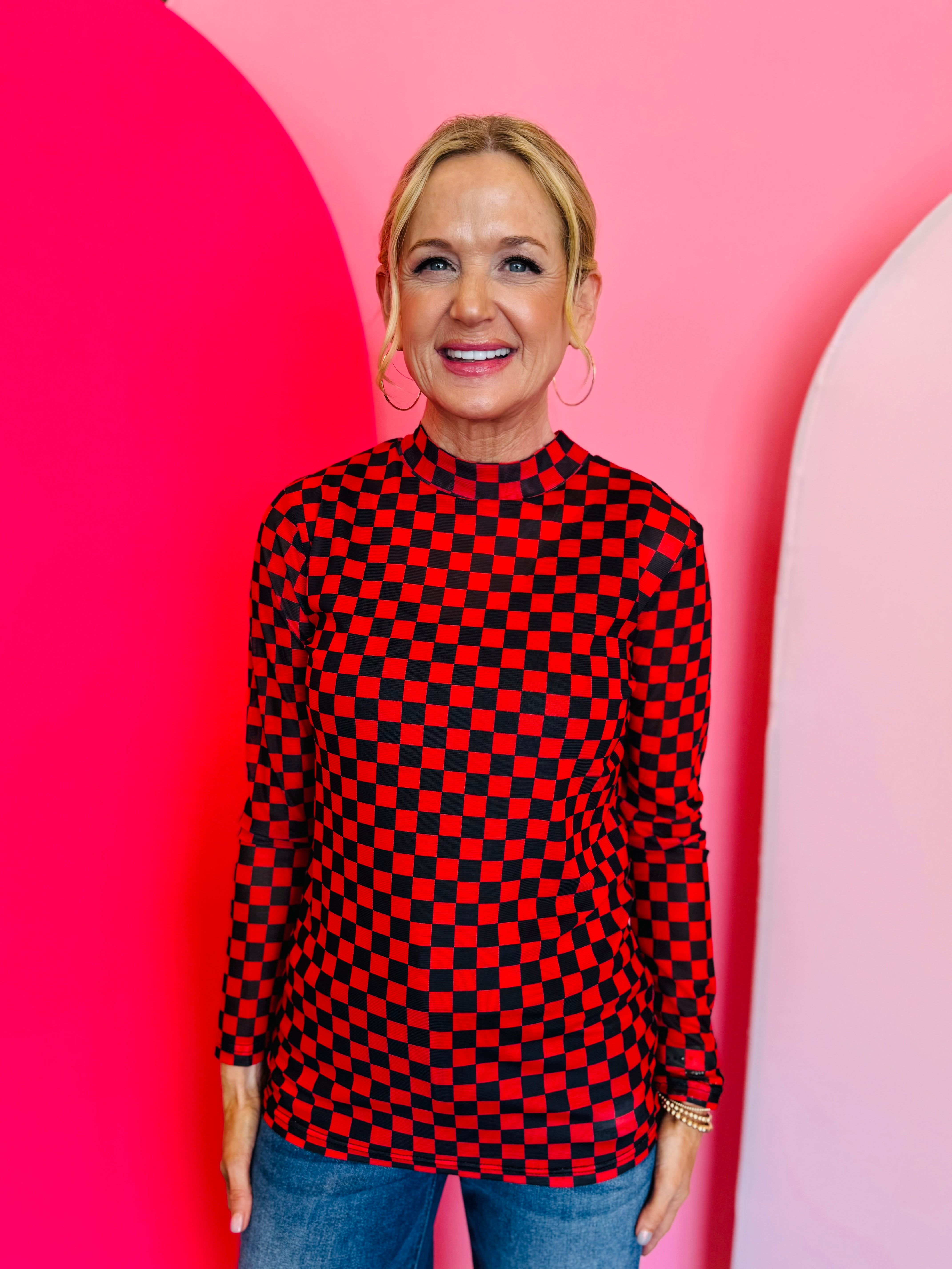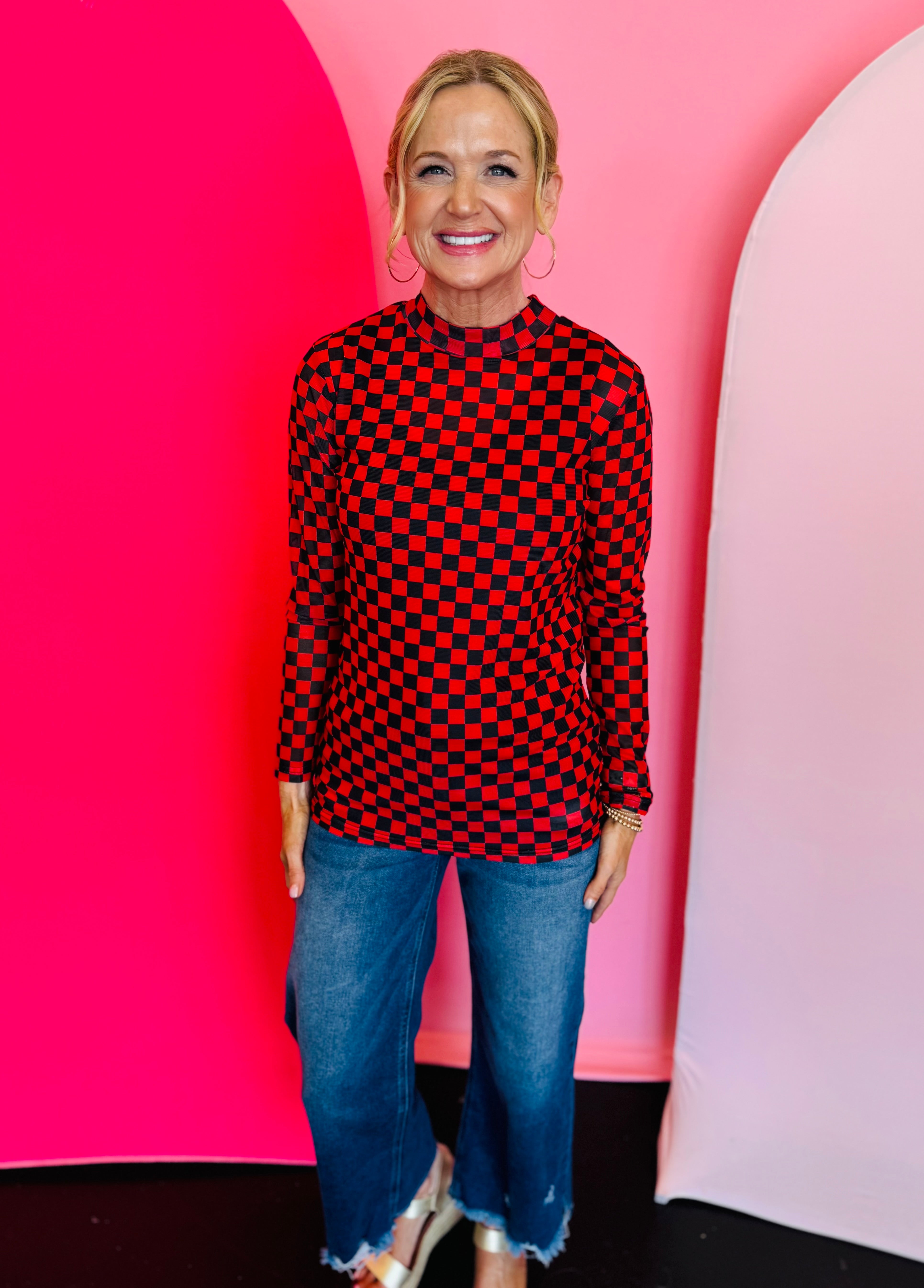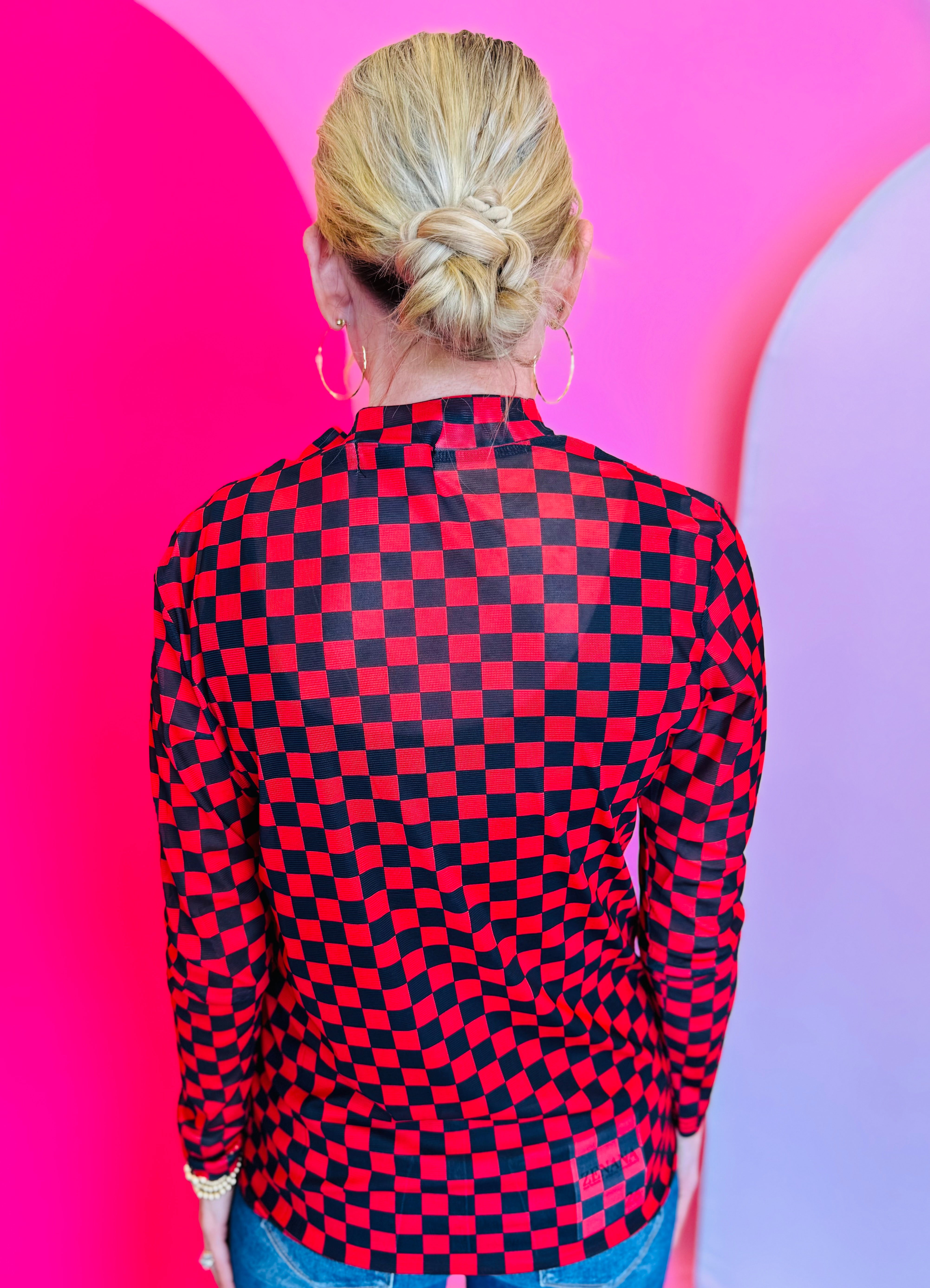 oin the winning team with our Pep Rally Mesh Top in red and black! This top features a fun and stylish checkered mesh design that will have you standing out in the crowd. Show off your playful side and cheer on your favorite team in style!