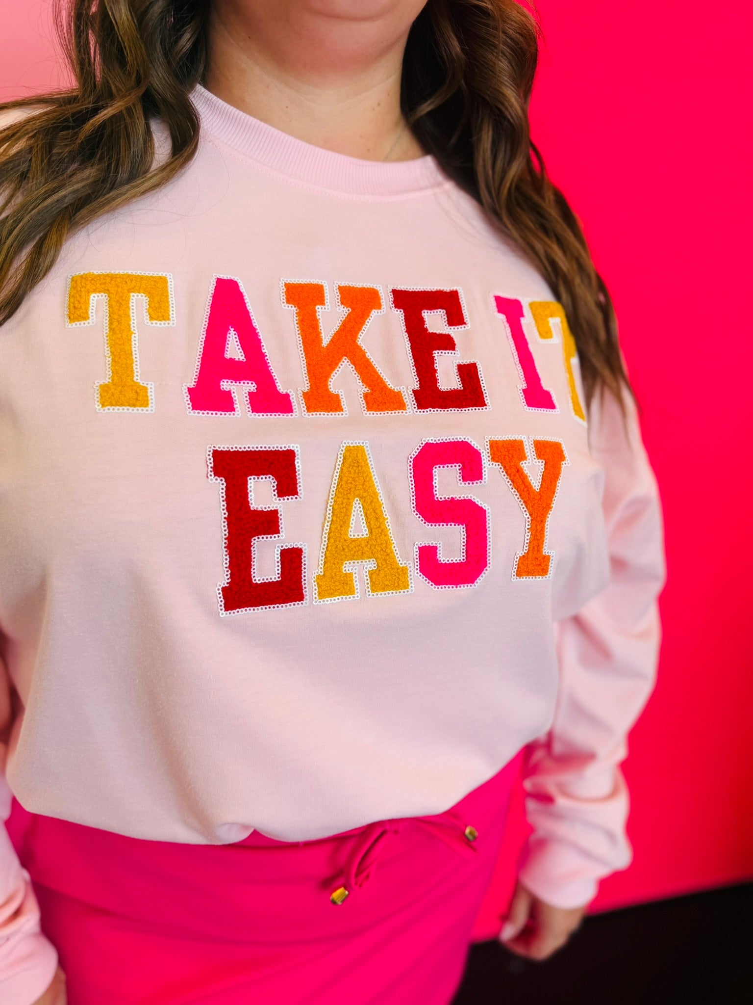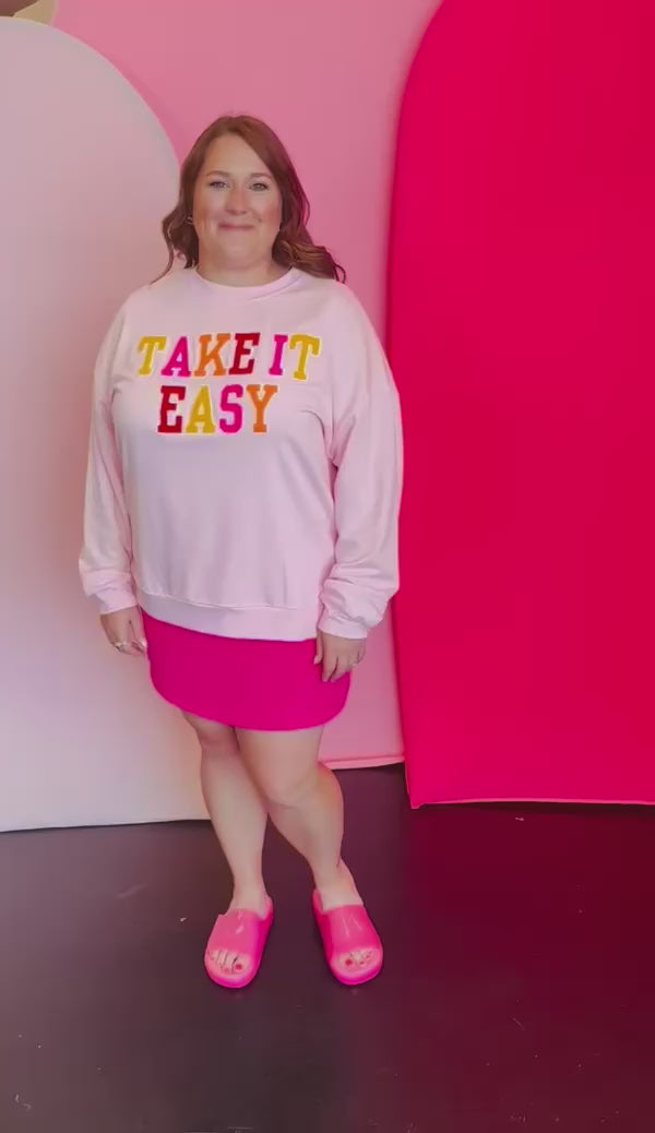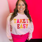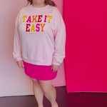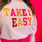 Say goodbye to basic and hello to bold with the Take It Easy Chenille & Sequin Pullover. This playful statement piece is perfect for those who love to express their unique style. Featuring soft chenille lettering outlined in eye-catching sequins, this pullover brings just the right amount of sparkle to your everyday wardrobe.