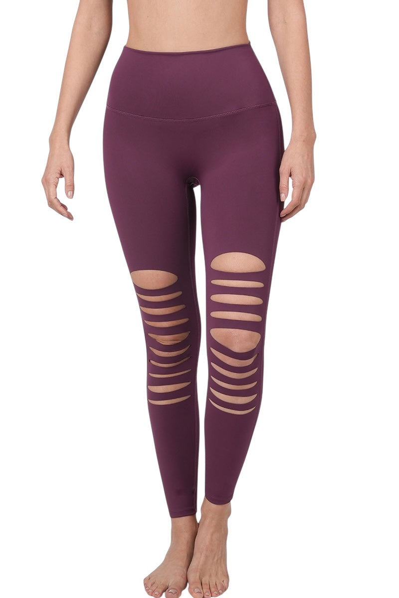 Eggplant colored stretchy leggings with destroyed front cutouts.