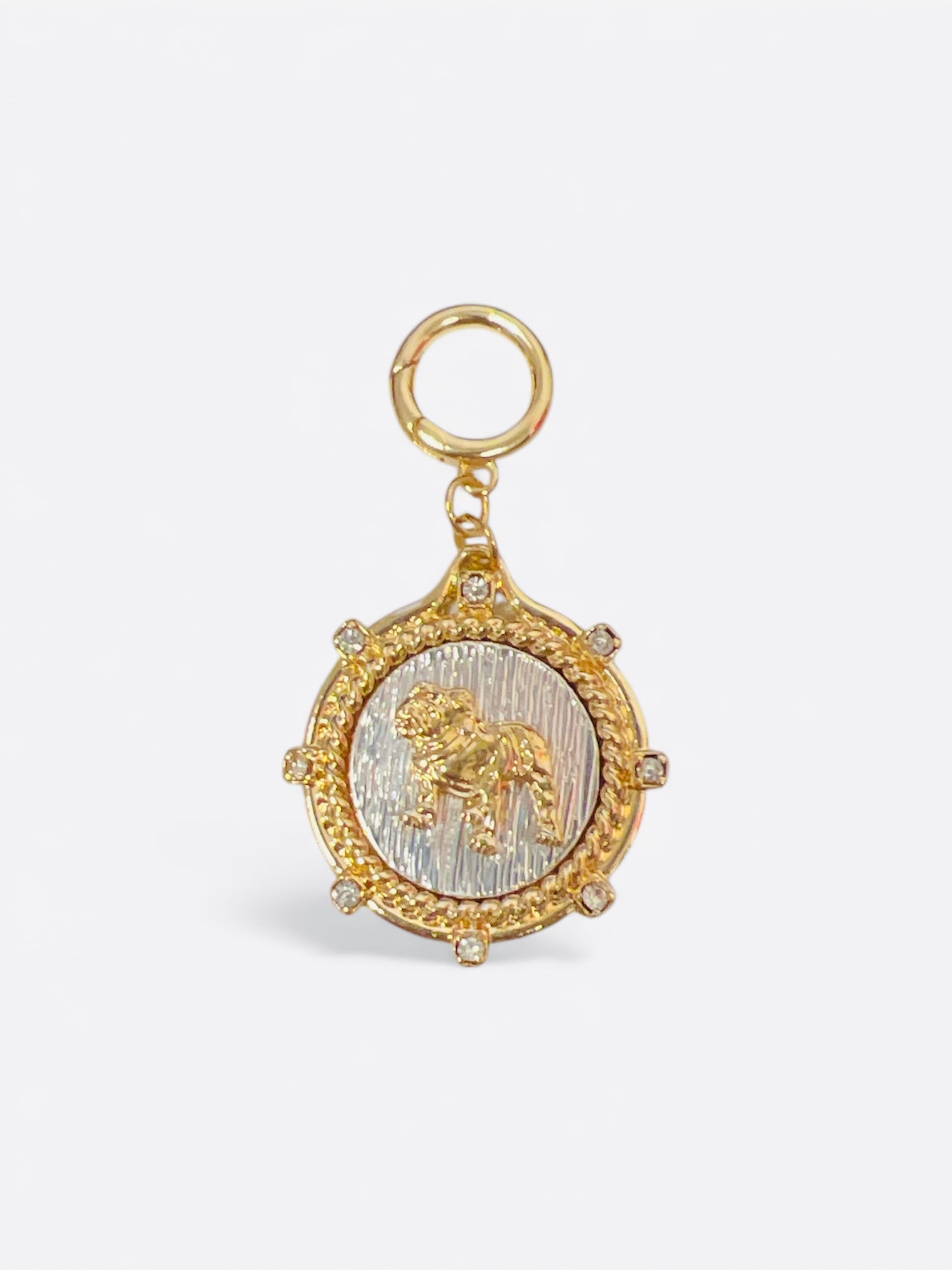 Add timeless charm and elevated detail to your accessories with our Bulldog Medallion Scarf Charm. Designed with a classic, heirloom-inspired look, this elegant scarf charm features a striking gold medallion showcasing a raised bulldog emblem at the center. The bulldog is set against a textured silver-tone background, creating beautiful contrast and depth. Surrounding the medallion is a braided gold border, accented with delicate clear crystals that add just the right touch of sparkle without overpowering the vintage feel.