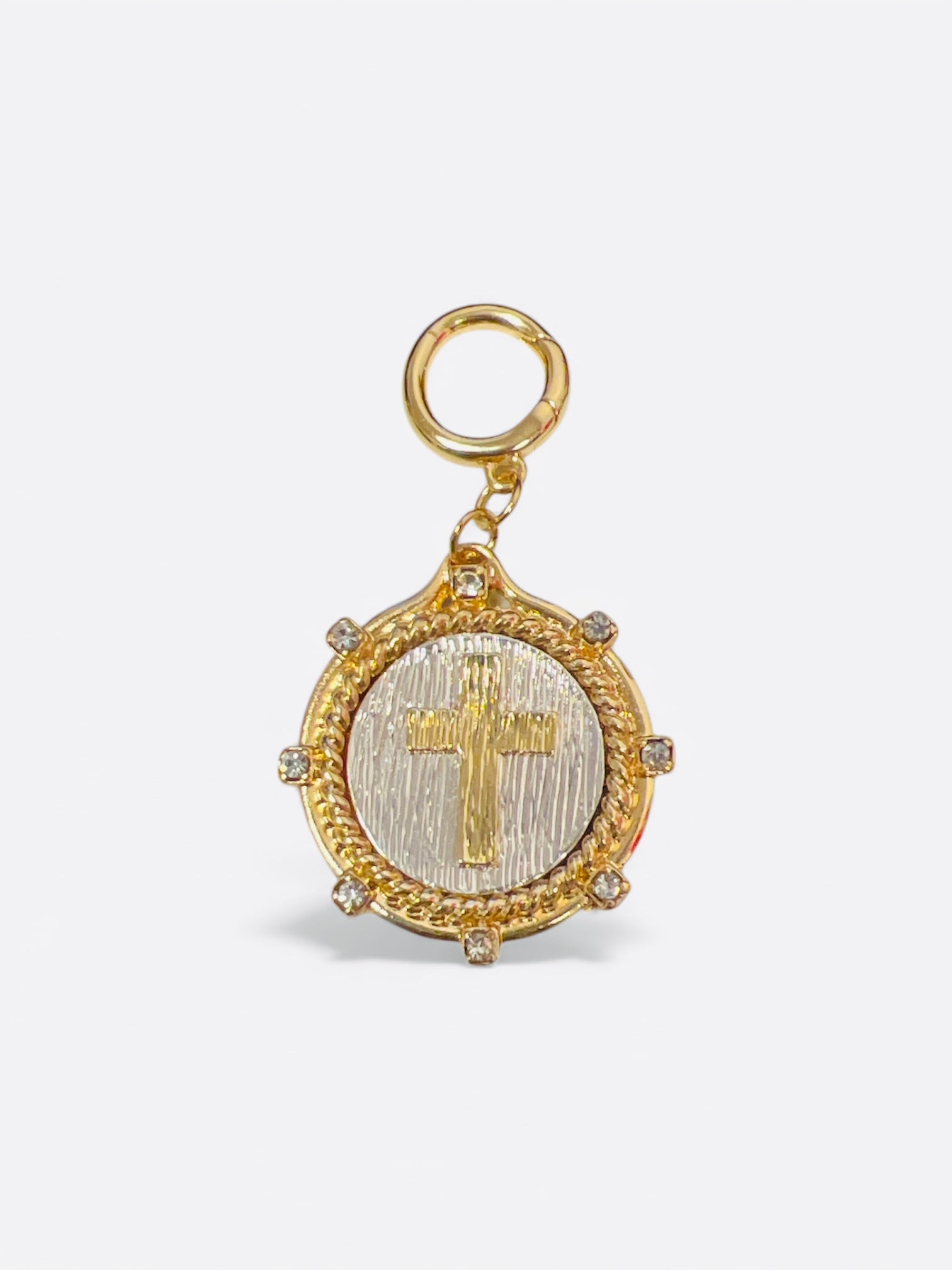 Add timeless charm and meaningful symbolism to your accessories with our Cross Medallion Scarf Charm. Designed with a classic, heirloom-inspired aesthetic, this elegant scarf charm features a beautifully detailed raised cross emblem at the center. The cross is set against a textured silver-tone background, creating striking contrast and depth. Framing the medallion is a braided gold border, delicately accented with small clear crystals that add a subtle touch of sparkle while preserving its vintage appeal.
