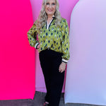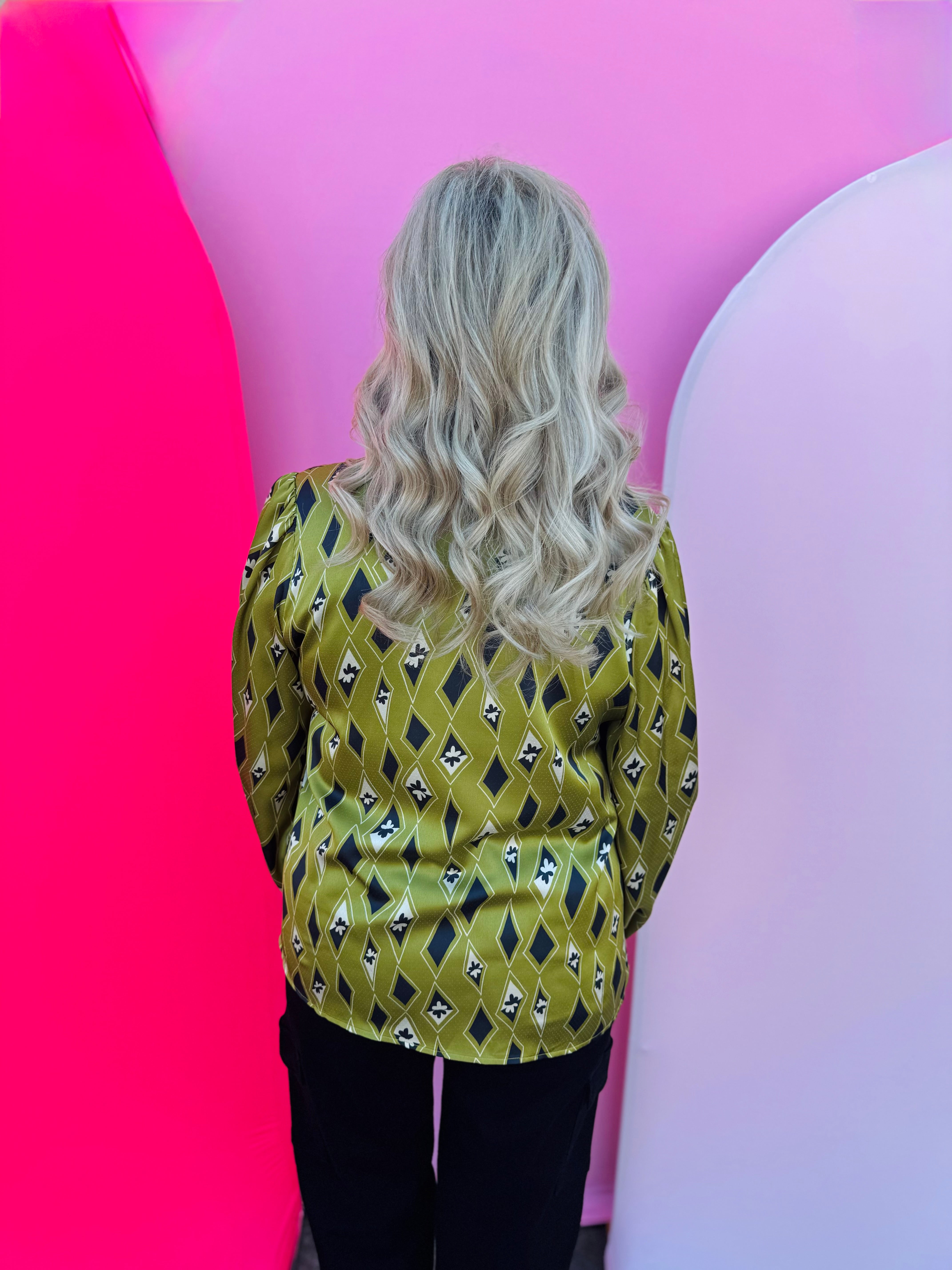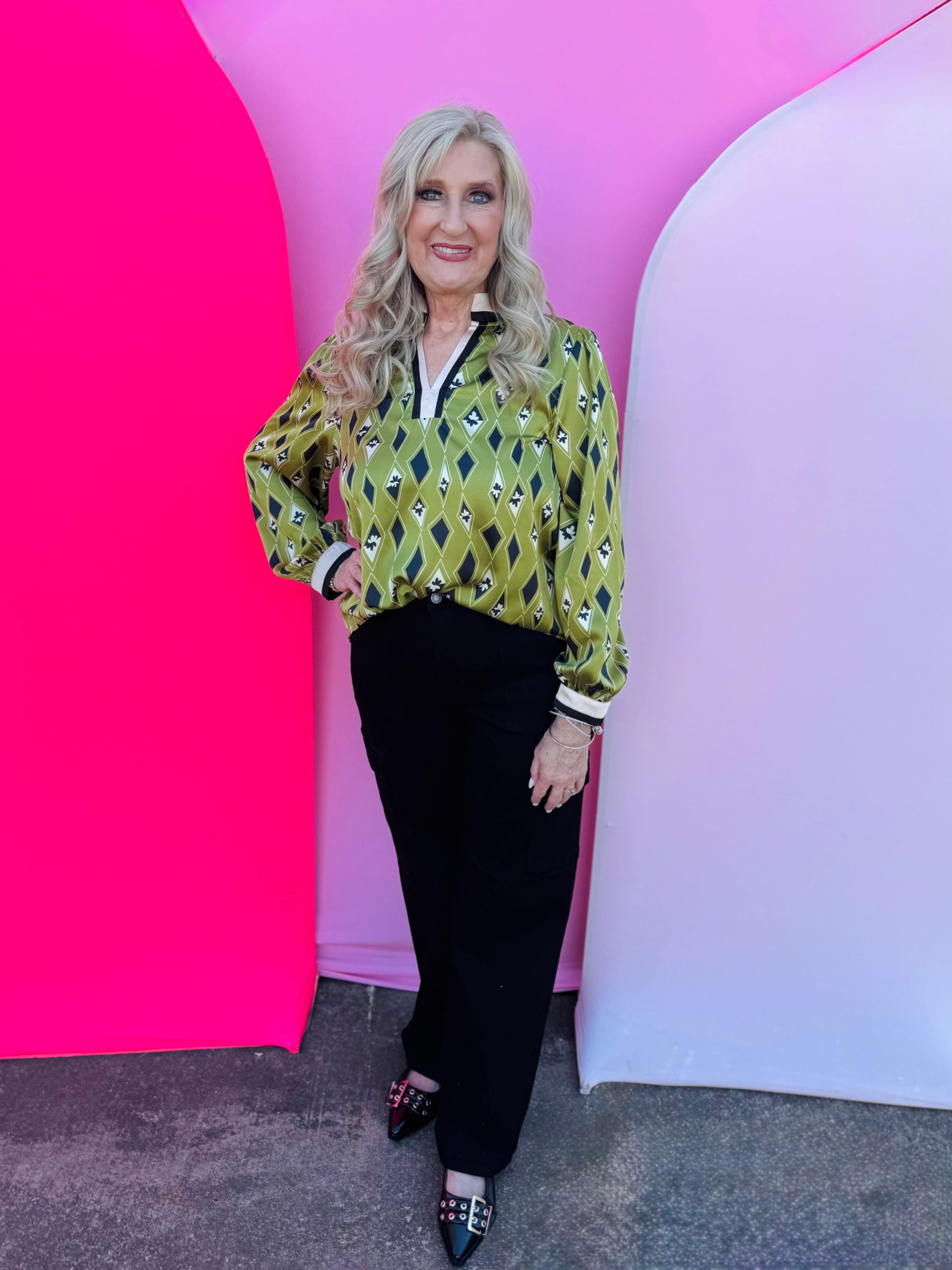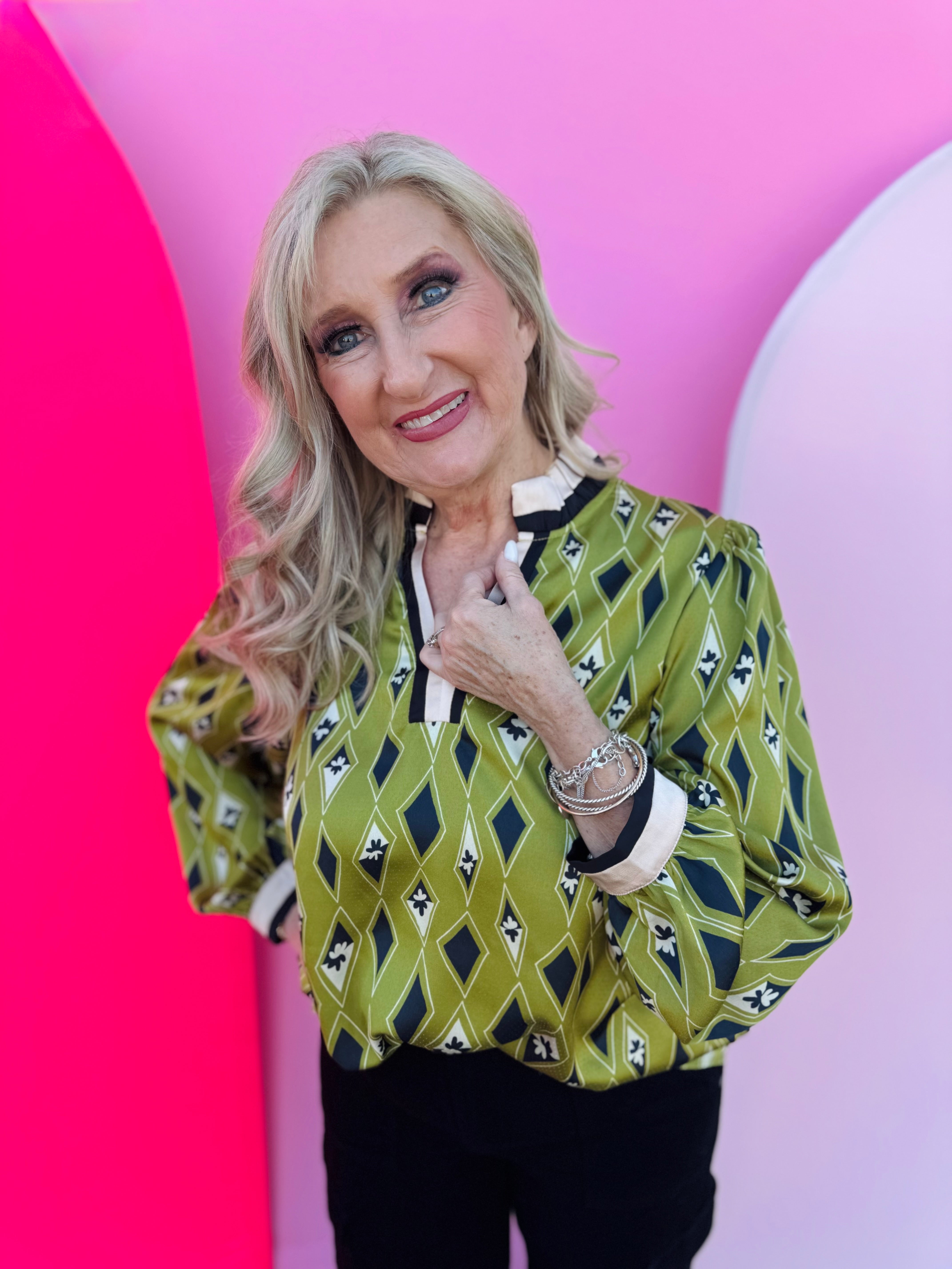 Add a touch of modern elegance to your fall wardrobe with the Olive Diamond Pattern Top. This eye-catching blouse features a bold diamond and tiny floral print in rich shades of navy, cream, and olive. The ruffled mock neckline and contrast-trimmed V-neck bring a feminine flair, while the long sleeves with elastic cuffs create a soft, polished silhouette. Crafted from lightweight, non-sheer 100% polyester, this top offers effortless comfort and style that transitions seamlessly from workdays to weekends. Pair it with denim, trousers, or a skirt for a chic and sophisticated look.