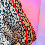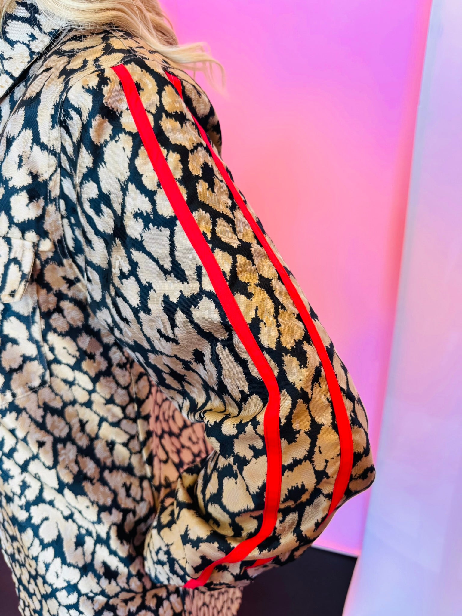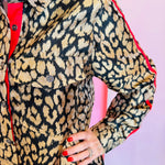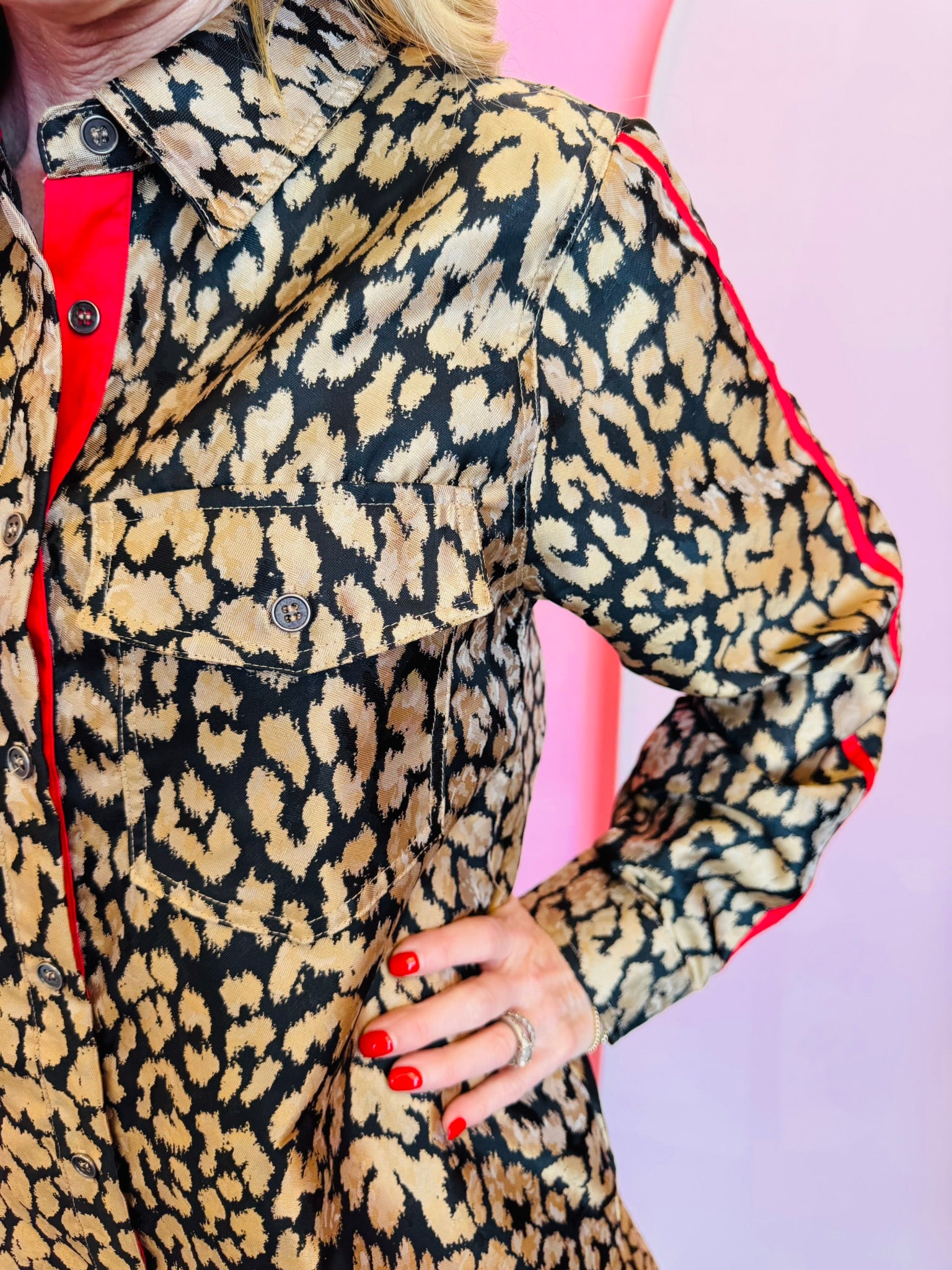 Unleash your bold side with the Leopard Shirt Dress, a stunning mix of classic sophistication and fierce style. This long-sleeve button-down dress features an allover leopard print with striking red contrast trim along the collar, placket, and cuffs for an eye-catching pop of color. The collared neckline, chest pocket, and pleated back detail add a touch of tailored polish, while the metallic sheen gives it a subtle, elevated finish. Perfect for day-to-night wear, this dress can be styled with boots for an edgy look or heels for a chic statement. Crafted from 100% polyester, it’s lightweight, comfortable, and designed to turn heads wherever you go.