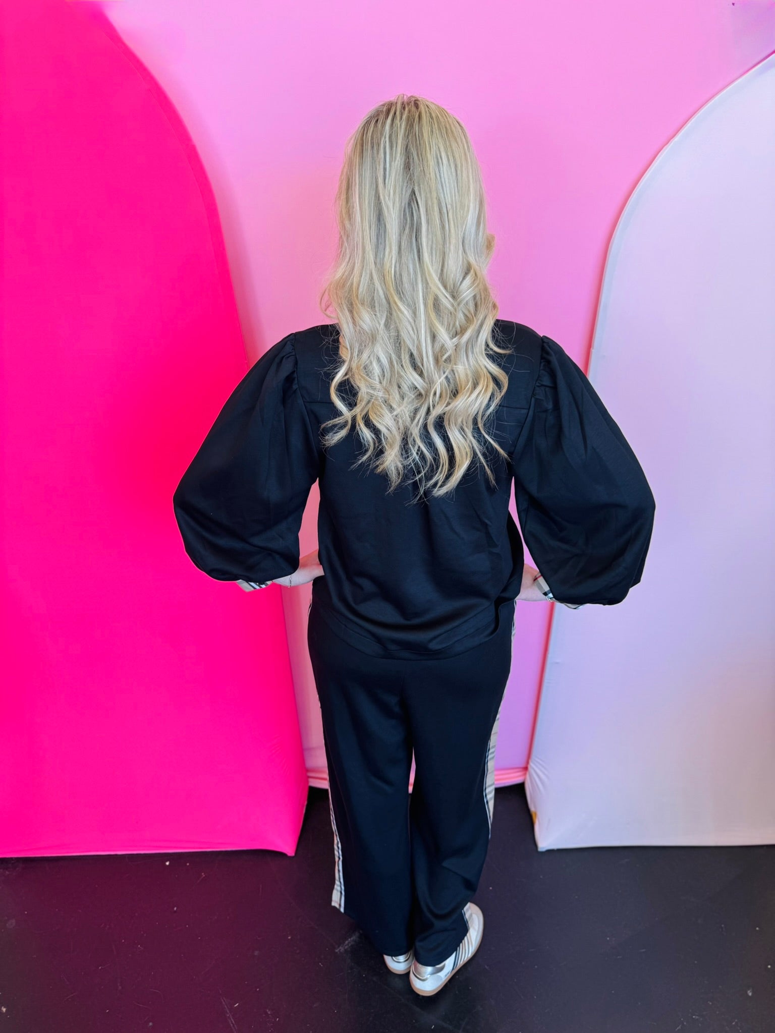 Add a touch of timeless charm to your wardrobe with our Plaid Trim Puff Sleeve Top, a perfect balance of sophistication and cozy fall style. This black mock neck top features elegant long puff sleeves and plaid contrast accents along the neckline, v-cut collar, and button cuff closures for a polished yet playful look. Made from a soft, stretchy blend of 55% rayon, 40% polyester, and 5% spandex, it offers a comfortable fit that flatters every shape. The plaid trim detail adds a pop of pattern, making it ideal for pairing with jeans, trousers, or skirts for a chic seasonal outfit. Whether for work, a holiday gathering, or weekend wear, this mock neck plaid top brings effortless elegance and style to any occasion.
