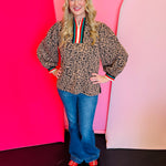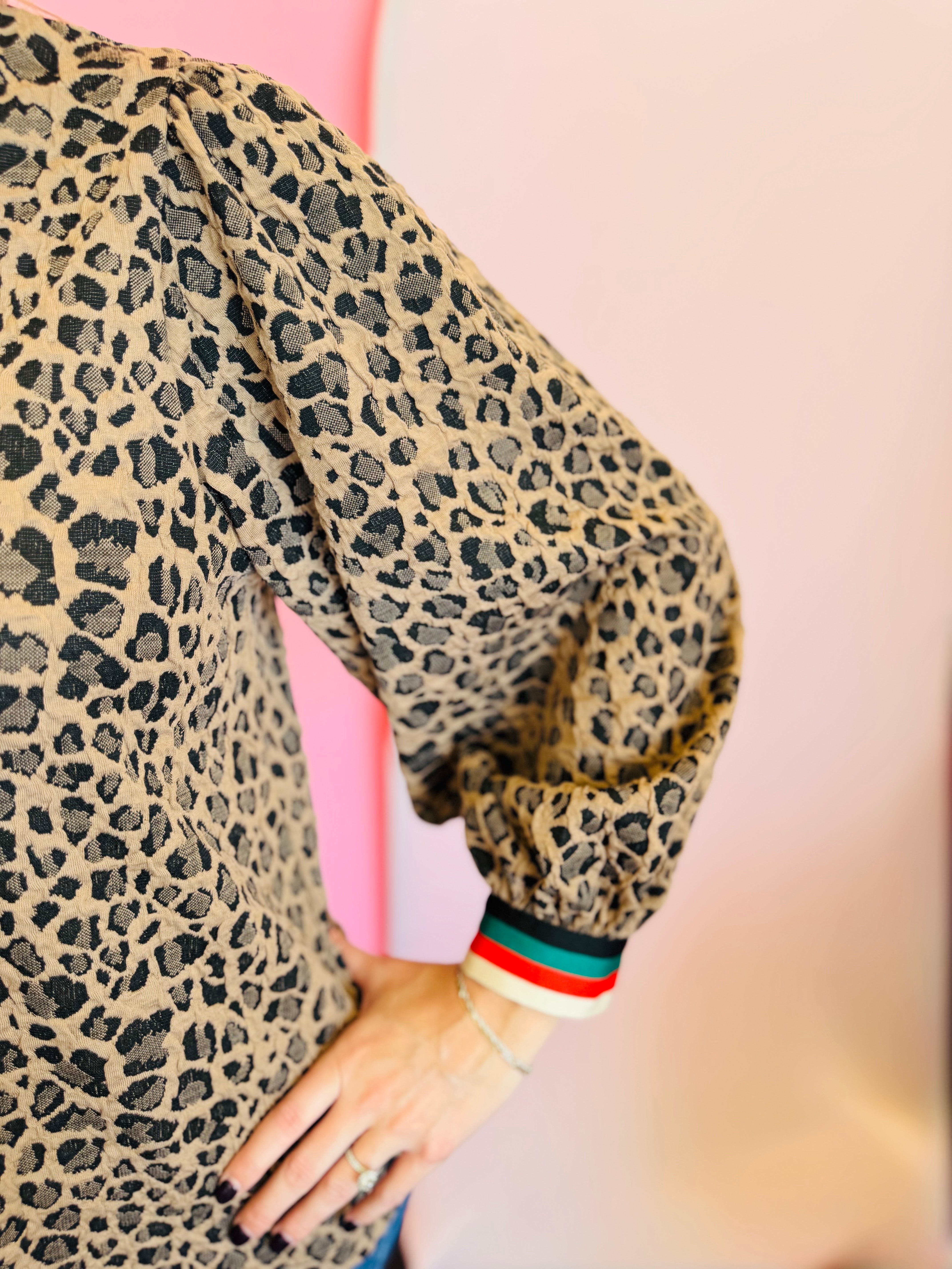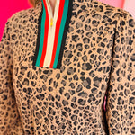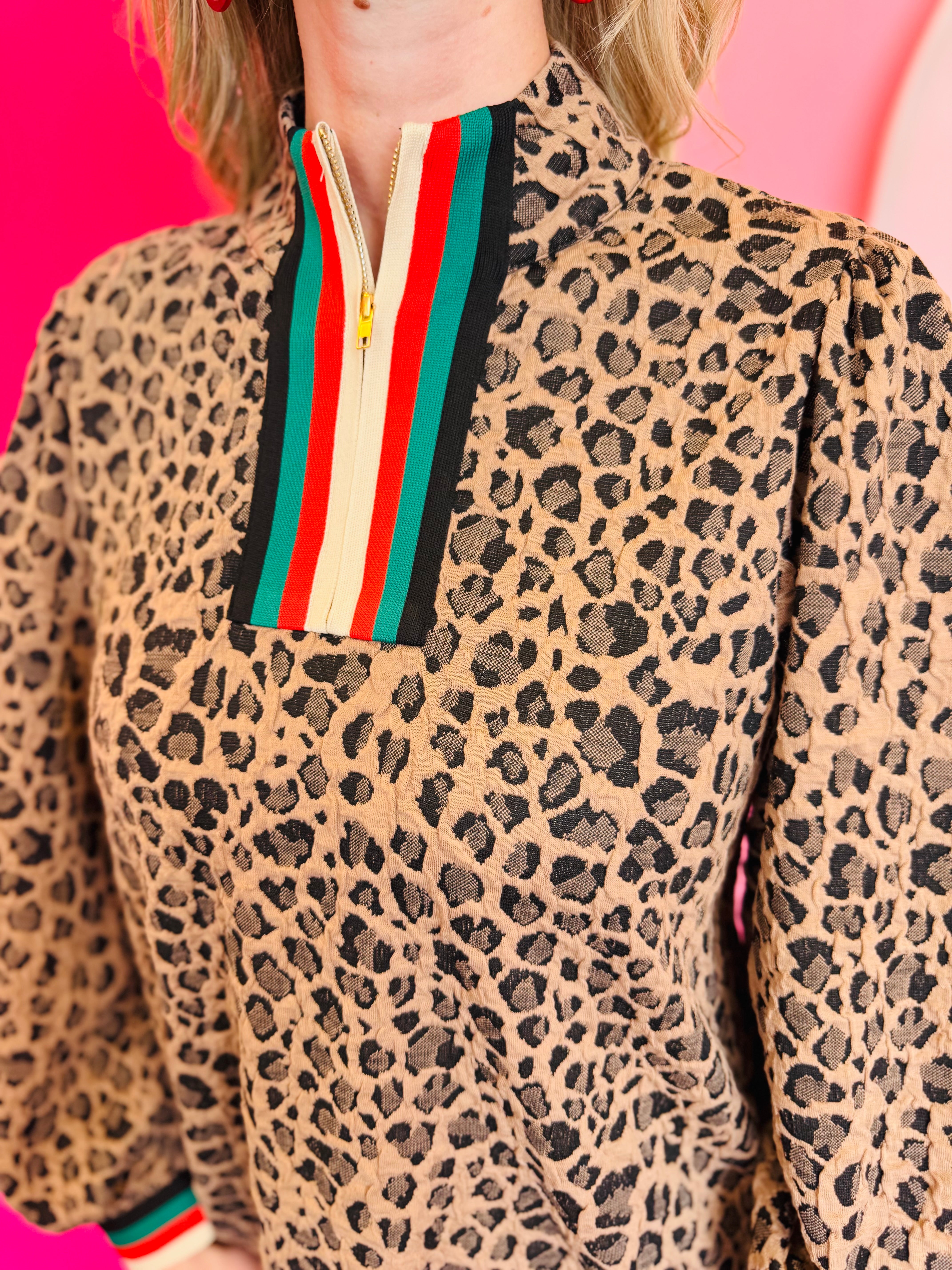 Add a touch of bold sophistication to your wardrobe with our Chic Safari Stripe Top, a statement piece that blends wild print with refined detail. Crafted from a soft and textured blend of 85% polyester, 10% cotton, and 5% spandex, this leopard print zip-up top offers both comfort and stretch for a flattering fit. The design features bracelet-length sleeves with cuffed hems and striking red and green stripe accents along the neckline and cuffs for a pop of color and contrast. Perfect for both casual and dressy looks, this animal print top adds a fierce yet polished vibe to any outfit. Pair it with jeans, trousers, or a skirt for a confident, fashion-forward finish.