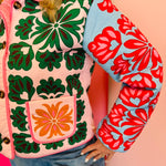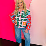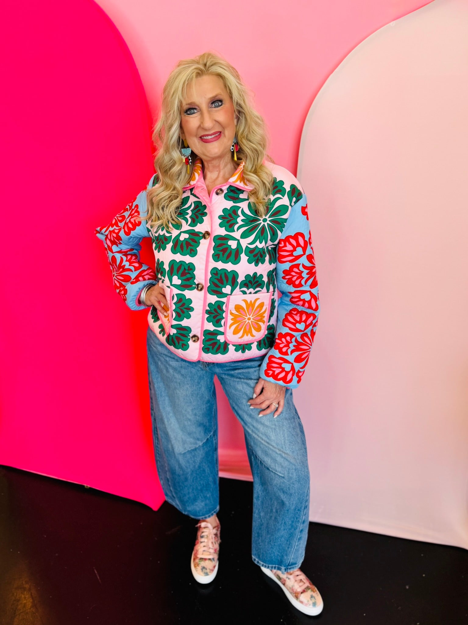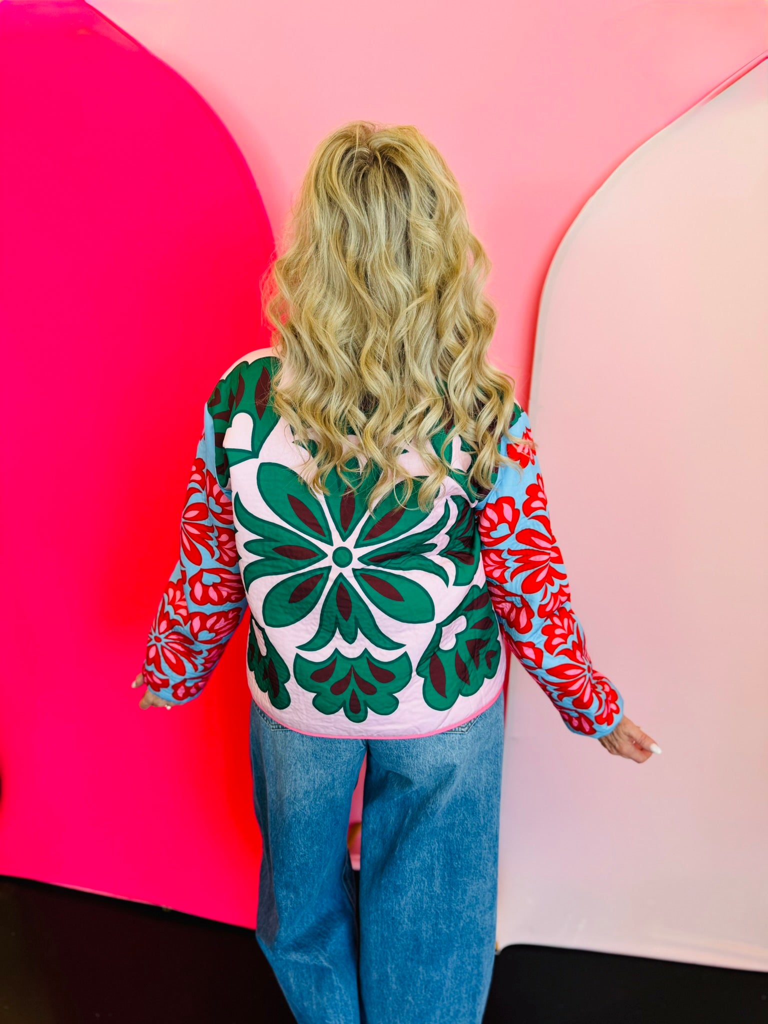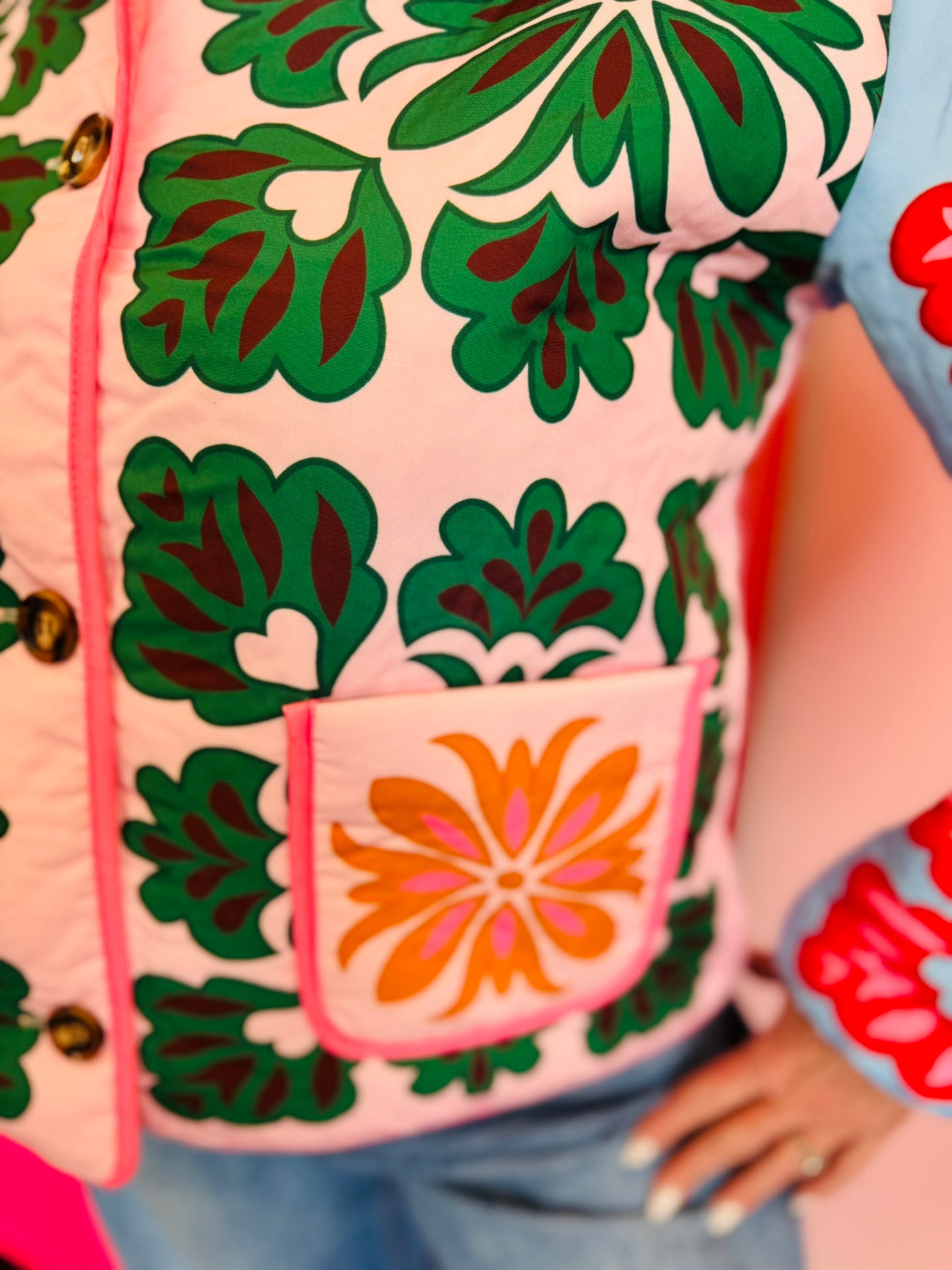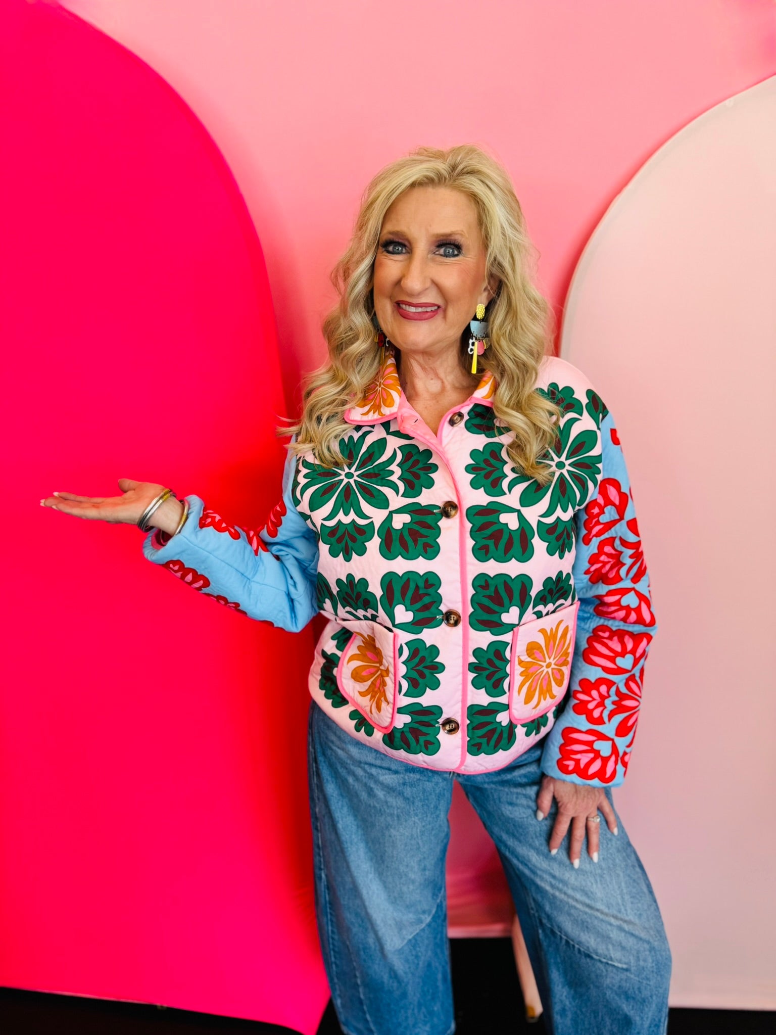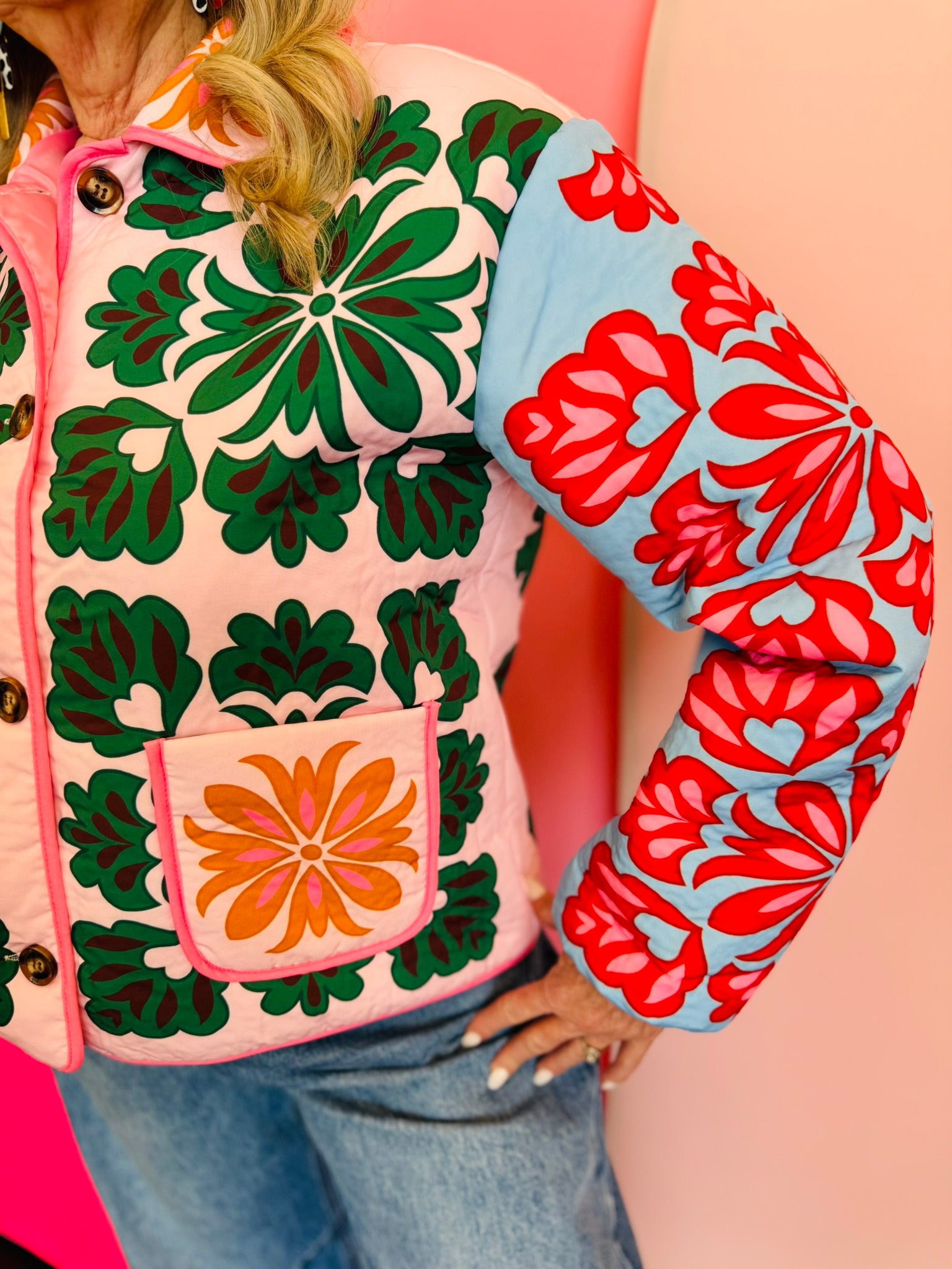 Wrap yourself in vibrant style with our Bloom Quilted Jacket, a stunning blend of color, comfort, and charm. This cropped quilted jacket features a vibrant mix of floral patterns in shades of pink, green, red, and blue, bringing a bold, cheerful pop to any outfit. Designed with a classic collared neckline, button-front closure, and two front patch pockets, it combines timeless details with modern flair. Crafted from soft, durable polyester, this lightweight floral jacket is perfect for layering over tees, sweaters, or dresses through every season. Whether you’re heading out for brunch, running errands, or styling a weekend look, this printed quilted jacket adds effortless personality and cozy sophistication to your wardrobe.