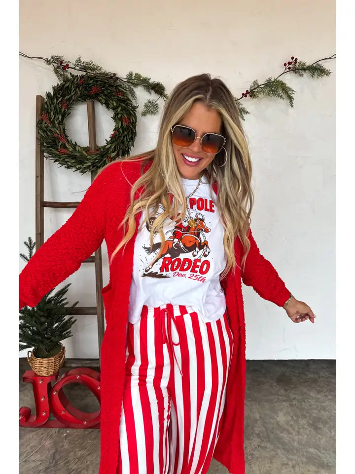 Add a bold pop of style to your holiday wardrobe with the Red Vertical Stripe Pants, designed for ultimate comfort and effortless flair. Made from a cloud-soft, ultra-stretchy fabric blend, these pants deliver the perfect balance of cozy and chic. The vertical red and white stripe pattern elongates your silhouette, while the elastic waistband with a faux drawstring ensures an easy, flattering fit. Side pockets add practical charm, and the wide-leg cut creates a relaxed yet polished look. Ideal for festive lounging, pajama parties, or pairing with your favorite holiday graphic tee, these pants bring both comfort and character to any outfit. Dress them up or down for a fun, festive vibe all season long.