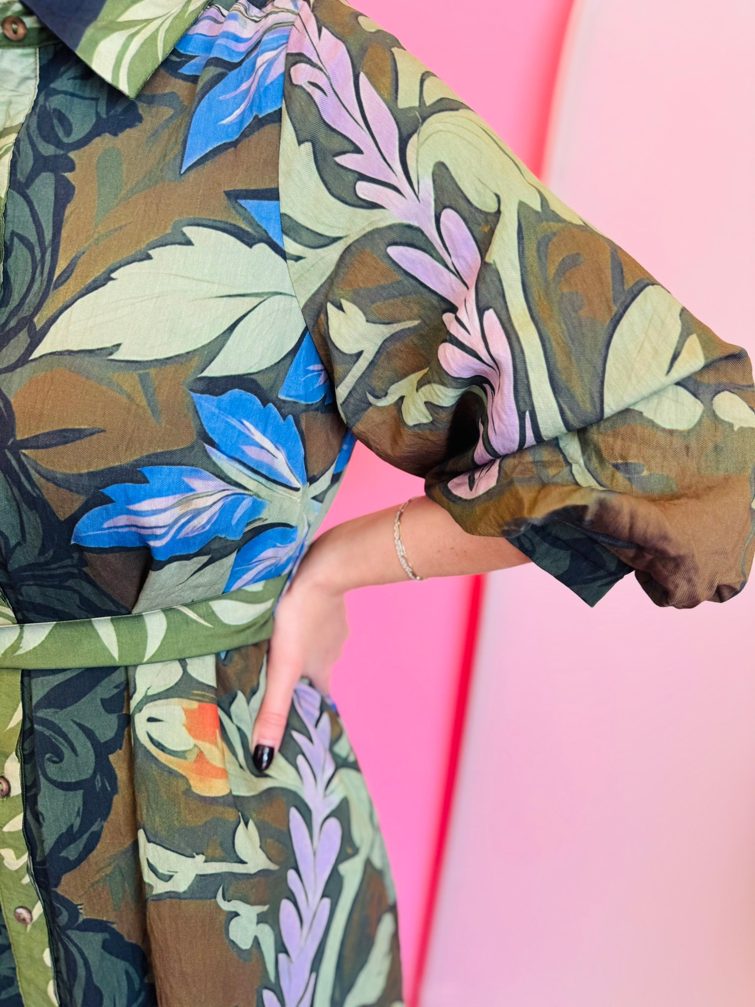 Elevate your wardrobe with the Botanical Long Sleeve Mini Dress, a beautifully detailed piece that blends effortless comfort with nature-inspired elegance. This lightweight woven dress features a stunning botanical print in deep greens, earthy browns, and soft pops of lilac and blue, creating a rich, eye-catching palette perfect for year-round wear. The button-front closure and removable matching waist tie belt allow you to customize your fit—from relaxed and flowy to cinched and defined. Designed with long balloon sleeves, side pockets, and a fully lined, non-sheer construction, this dress offers both style and practicality. Pair it with boots, heels, or flats for everything from brunch and shopping days to work events or seasonal gatherings.