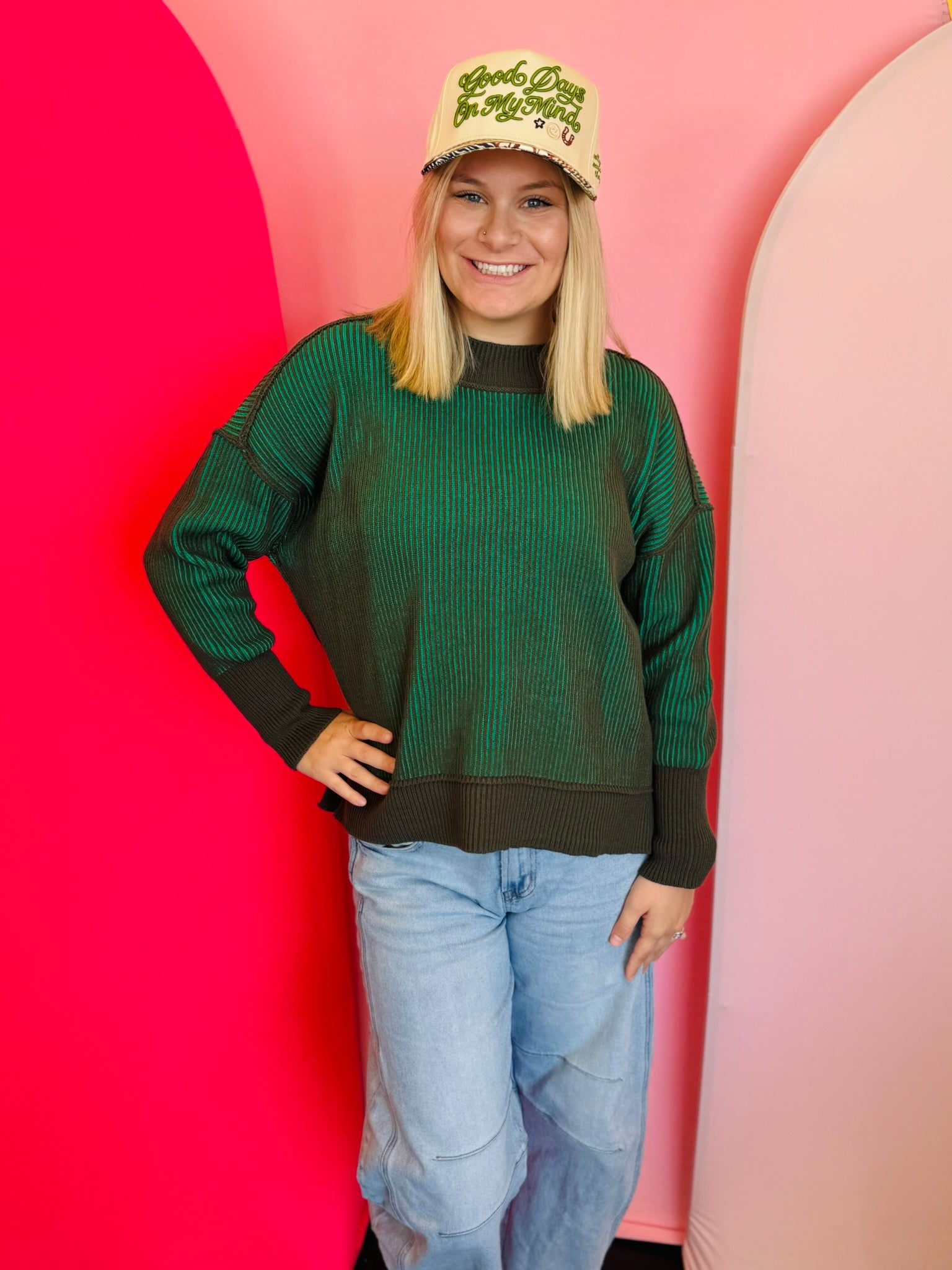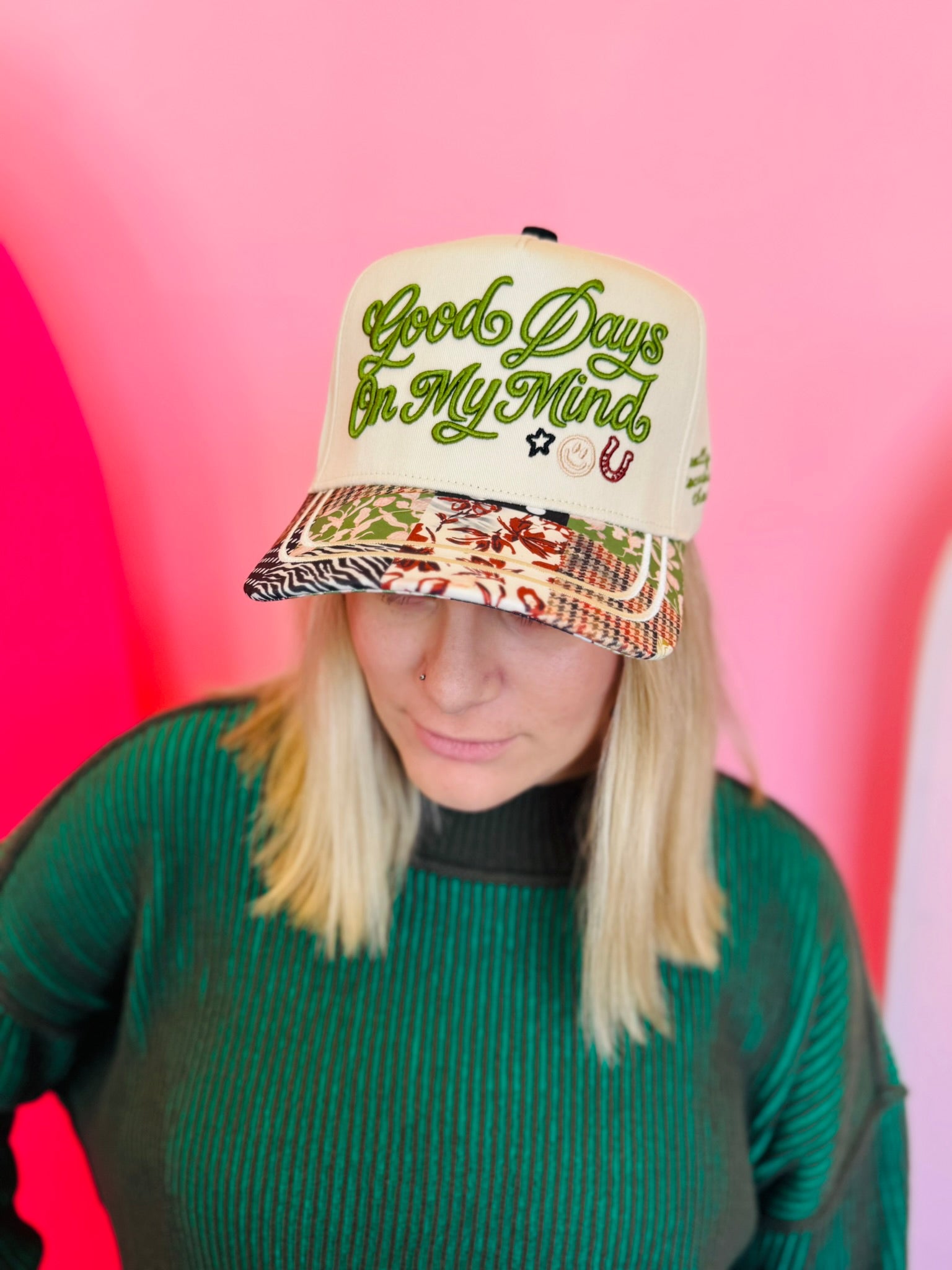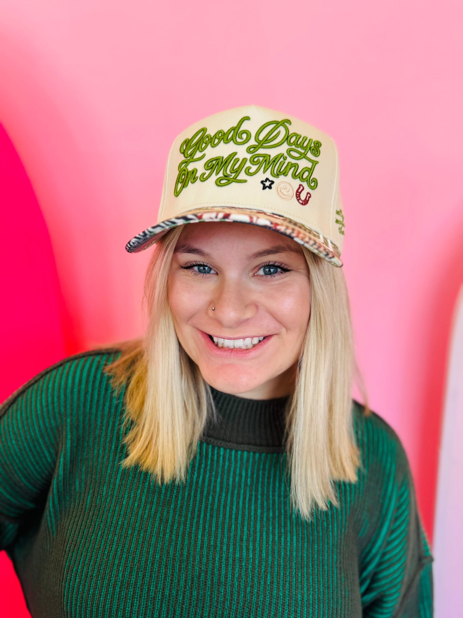 Bold, raised green embroidered text on the front: “Good Days On Mind”