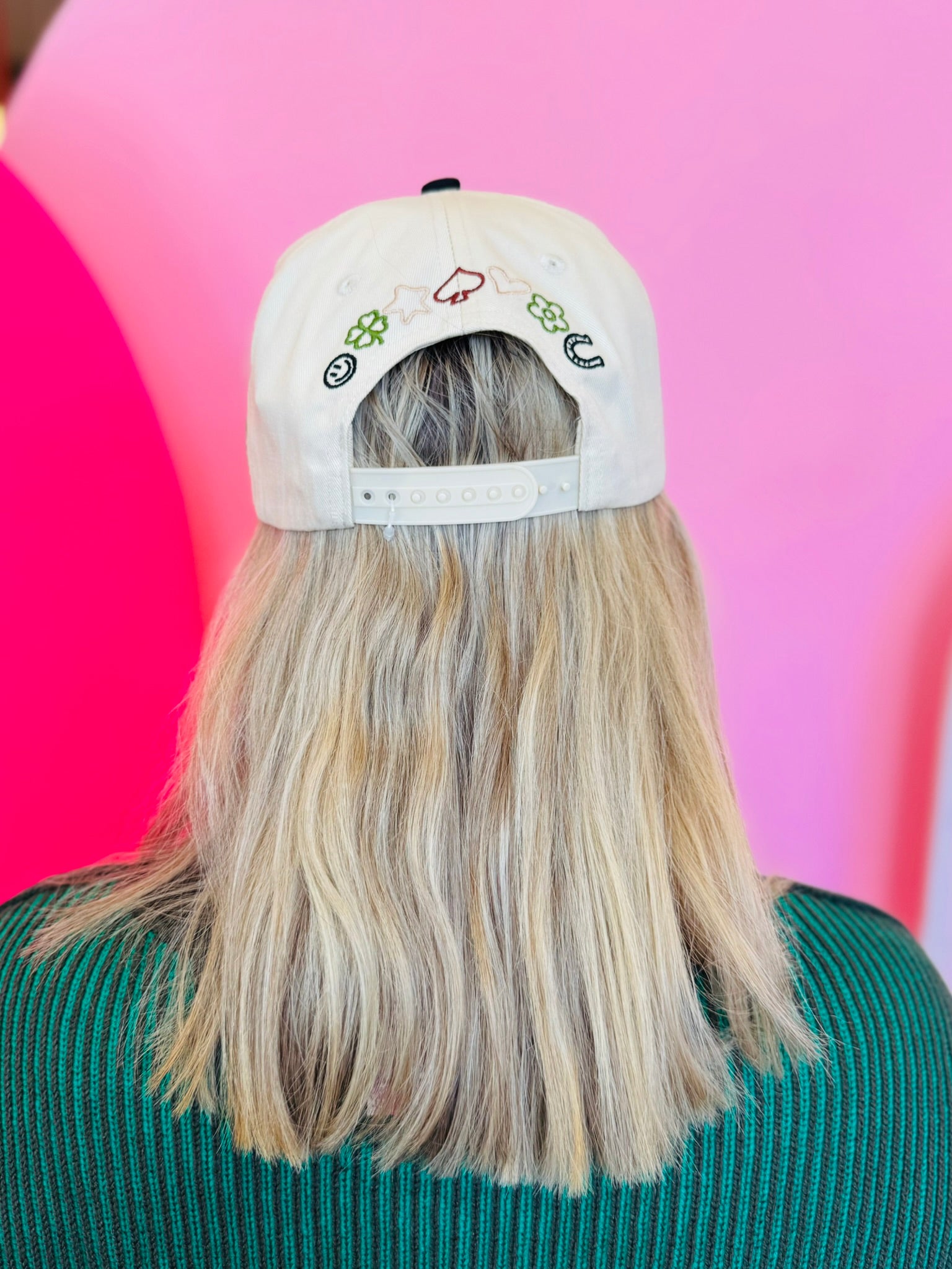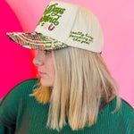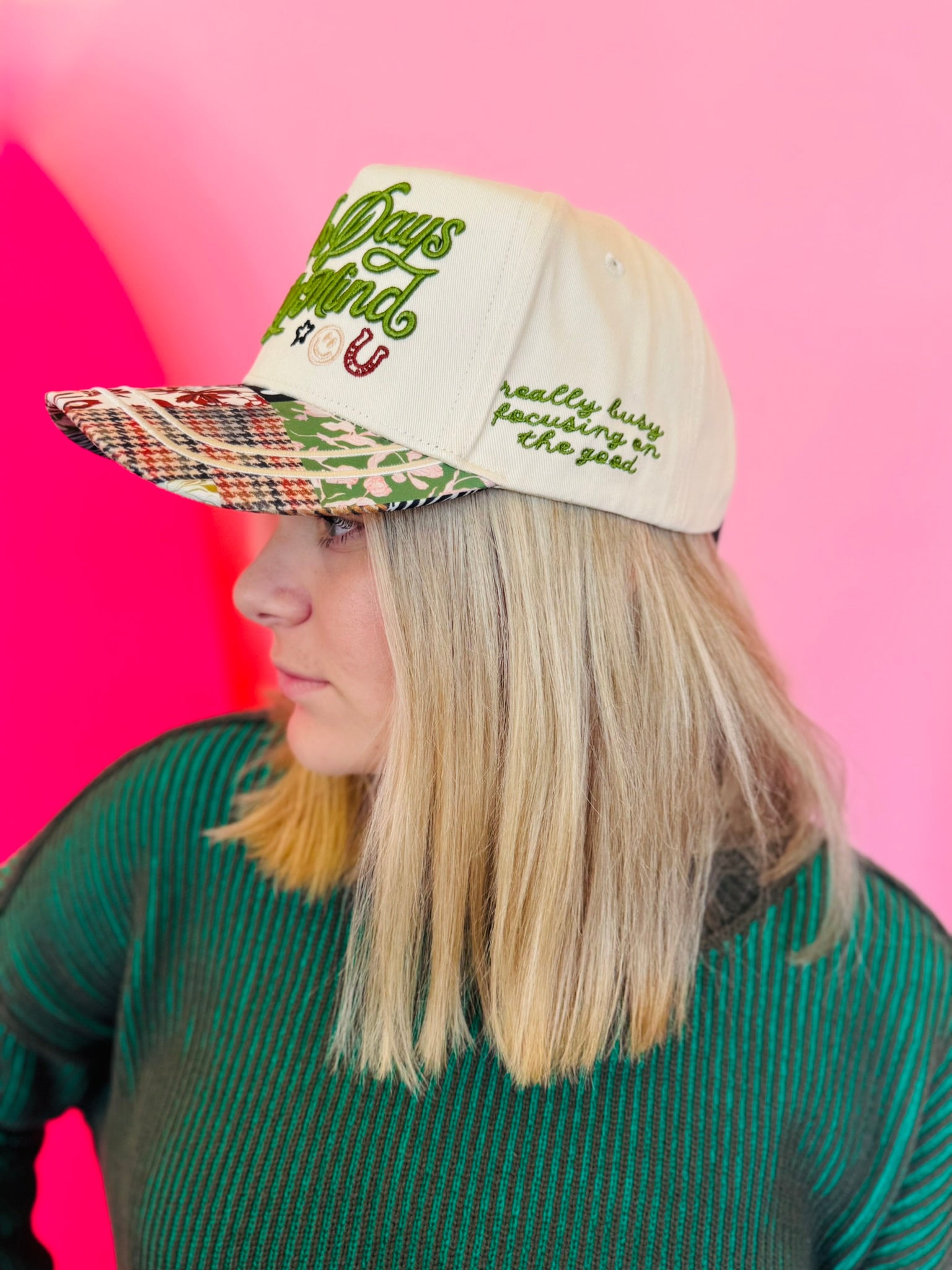 Elevate your accessory game with this Good Days On Mind Hat! Featuring a bold embroidered message in textured raised green lettering, "Good Days On Mind" takes center stage on the front, setting a positive tone for your day. The soft cream color of the cap makes it a versatile addition to any casual outfit, while the fun patchwork-style bill steals the show with its unique print. The side of the hat adds a motivational touch with the message, “Really Busy Focusing on the Good.” To keep the playful vibe going, the back of the cap features a row of colorful embroidered icons, making this hat a fun and expressive choice. With its adjustable snapback closure, it offers a customizable fit, ensuring both style and comfort.
