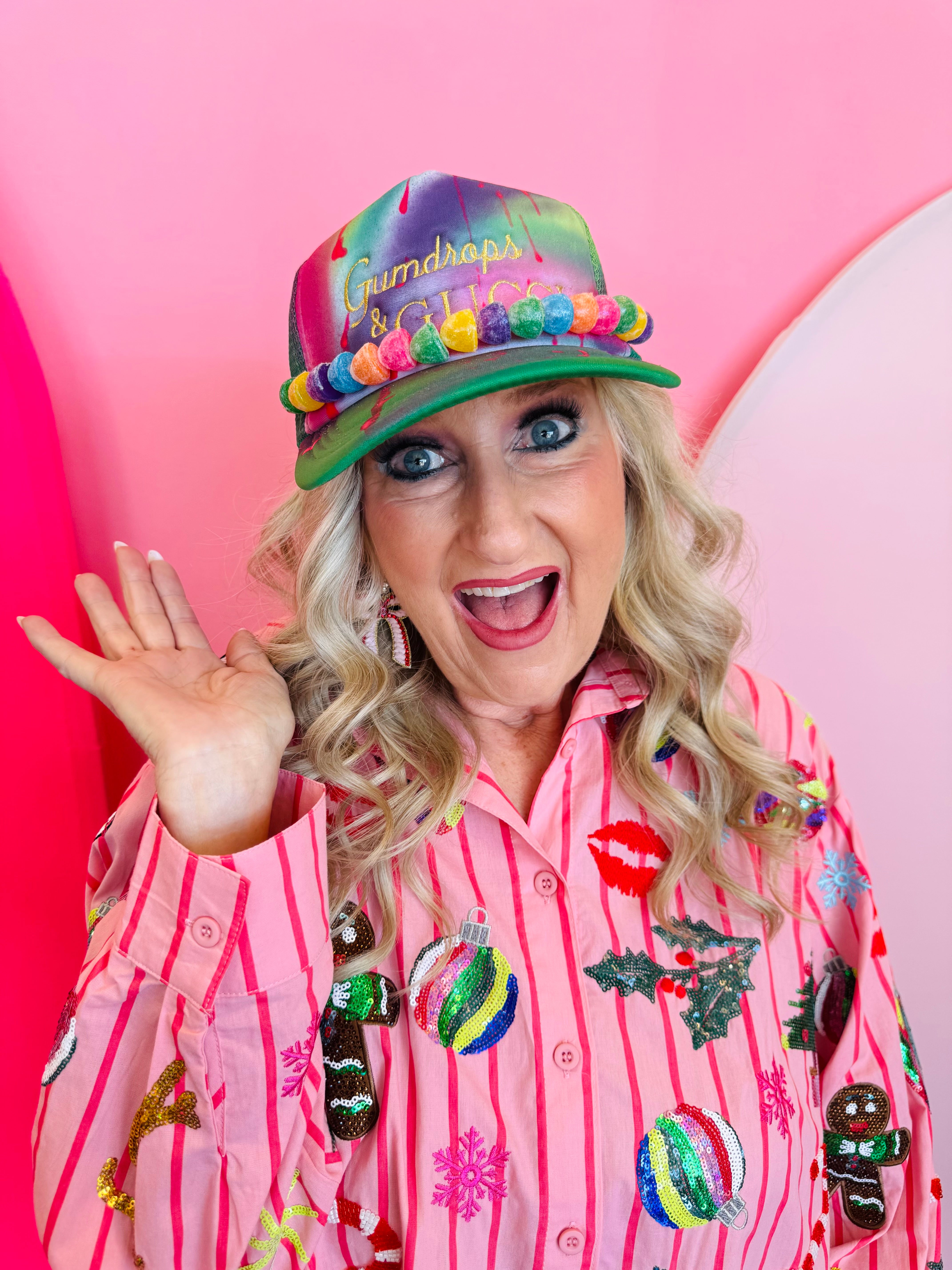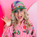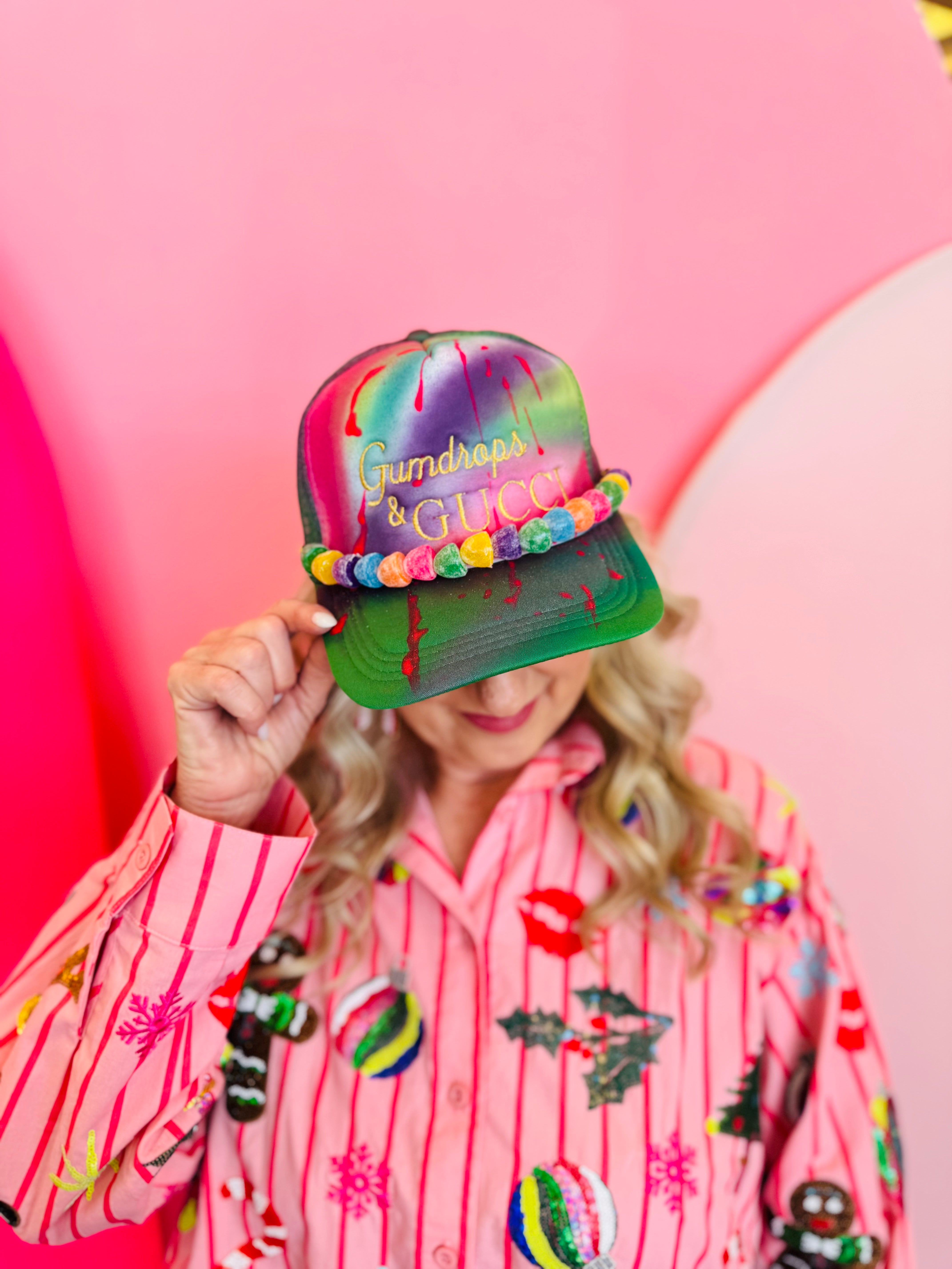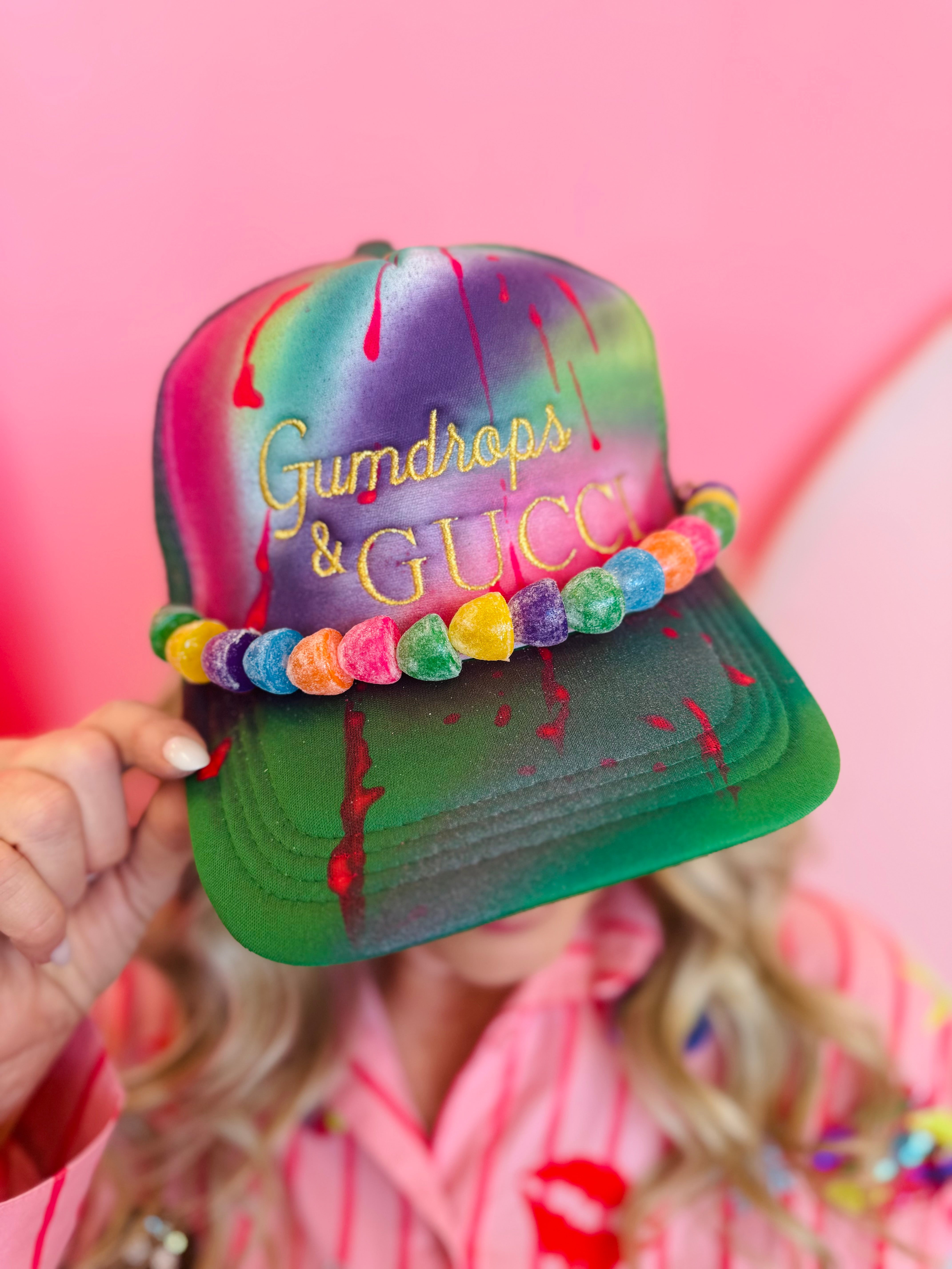 Turn heads in this statement-making Gumdrops & Gucci Trucker Hat, where vibrant color meets playful style. Featuring a bold tie-dye blend of green, pink, and purple with pink paint-splatter accents, this hat is a true showstopper. Across the front, gold embroidered “Gumdrops & Gucci” lettering adds a fun pop, while a string of bright rainbow gumdrop beads decorates the brim for a whimsical finish. The breathable mesh back keeps you cool and comfortable, making it perfect for sunny days, festivals, or casual everyday wear. Style meets personality in this one-of-a-kind accessory that adds instant flair to any outfit.