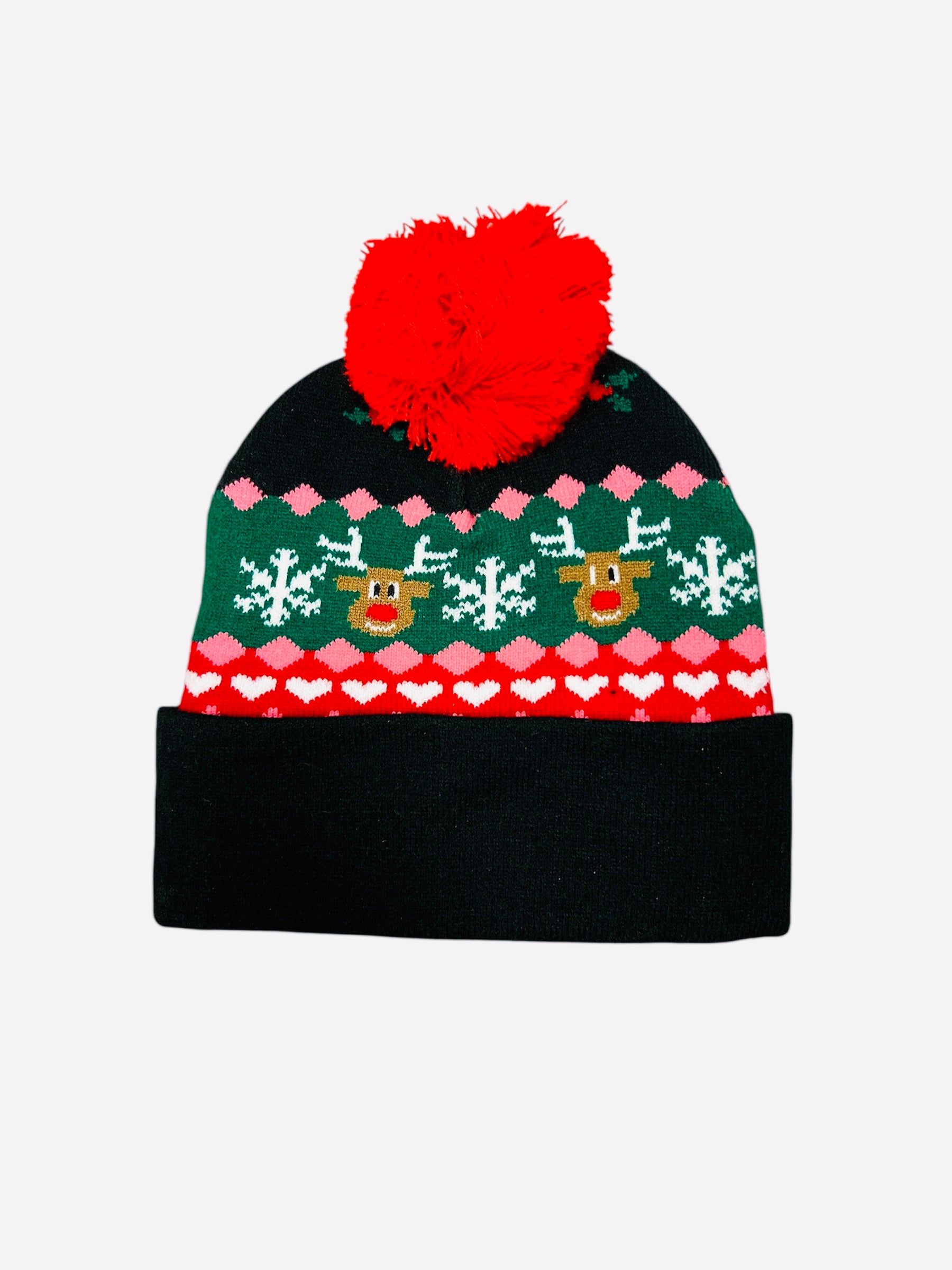 Black knit beanie with reindeer, snowflakes, hearts, and diamonds