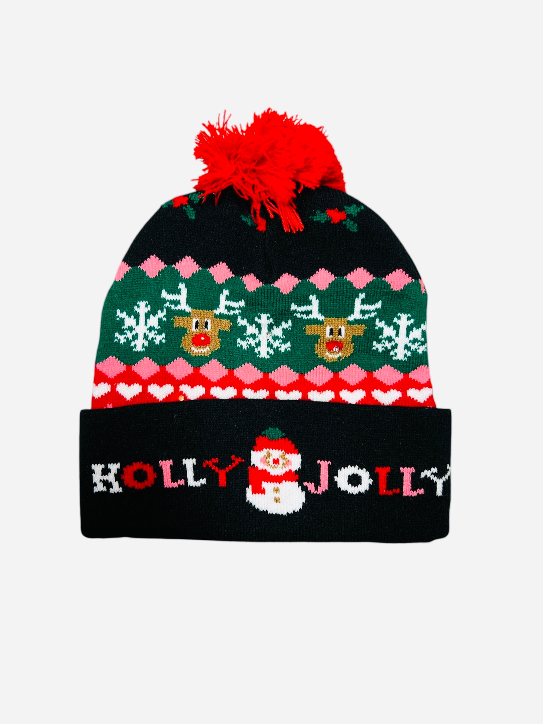 Get into the spirit of the season with our Holly Jolly Reindeer Pom Beanie, a playful and cozy winter accessory designed to keep you warm while spreading festive cheer. This soft black knit beanie features an adorable mix of cute reindeer faces, snowflakes, pink diamond designs, and white heart accents, creating a fun and colorful cold-weather look. Topped with a bright red pom pom, it adds the perfect pop of holiday charm. The folded cuff proudly displays the phrase “Holly Jolly” along with a sweet little snowman, enhancing the merry, whimsical vibe. Warm, stretchy, and comfortable, this beanie is perfect for holiday parades, tree farm visits, family photos, or gifting to your favorite festive friend.