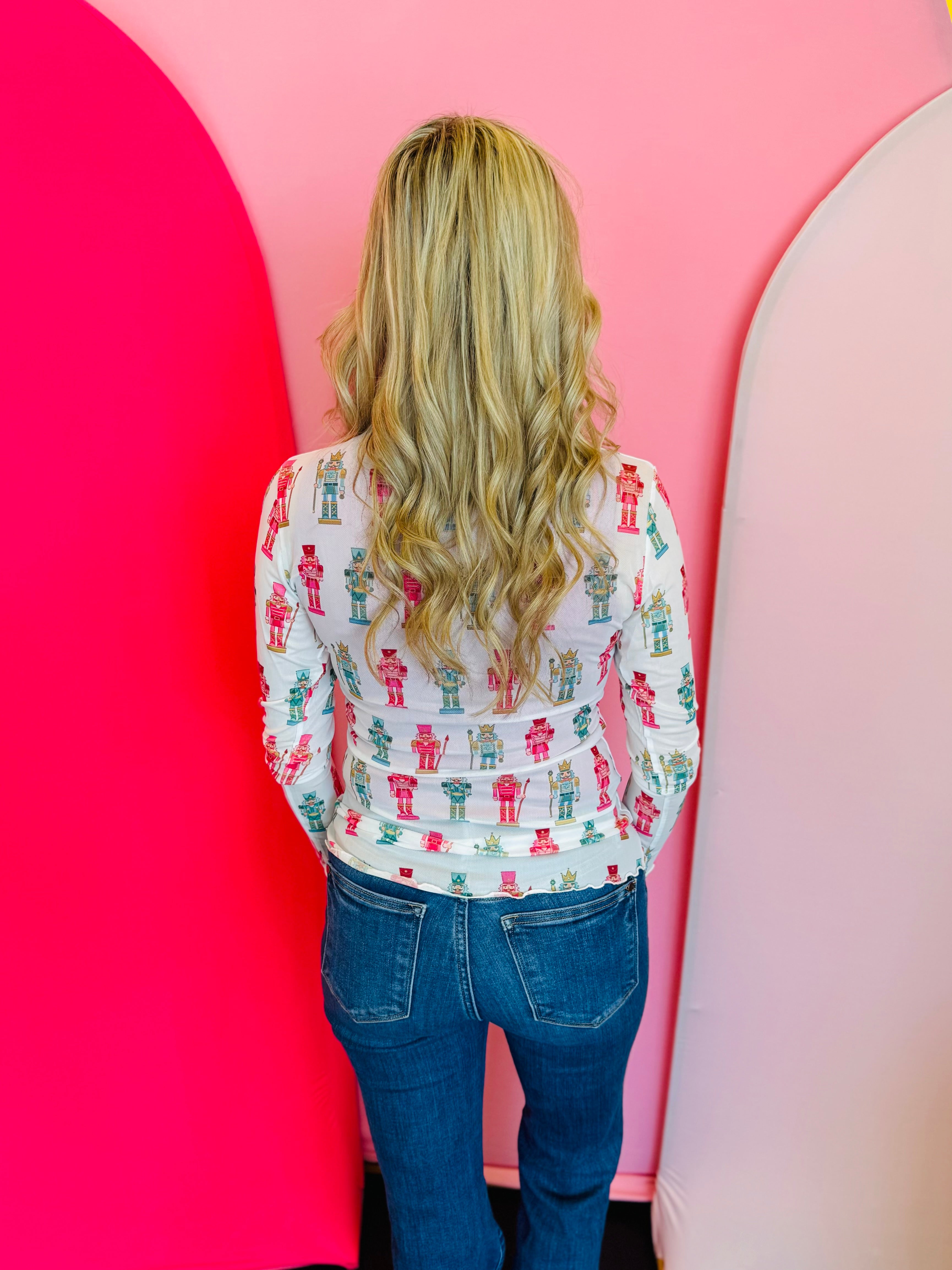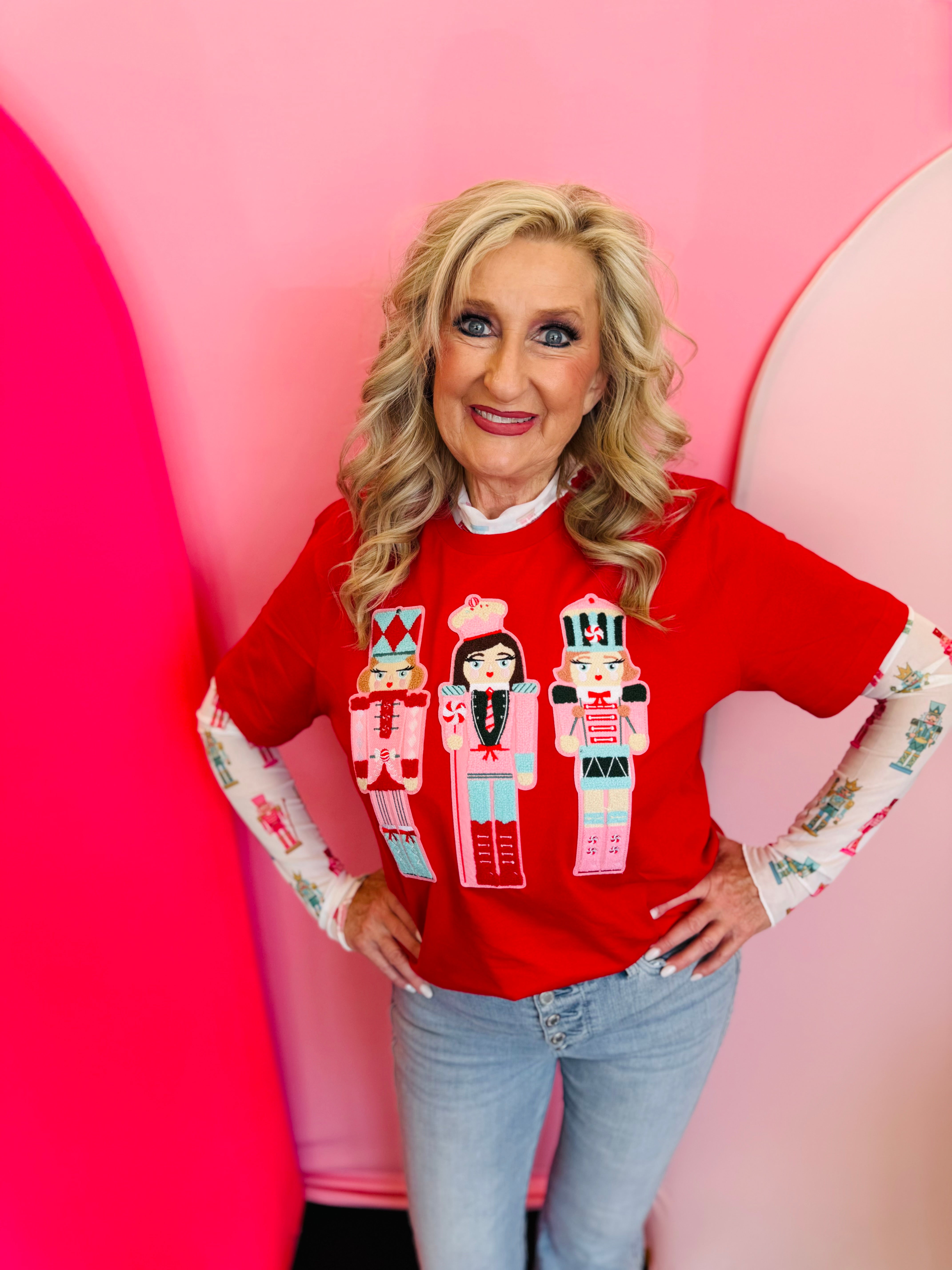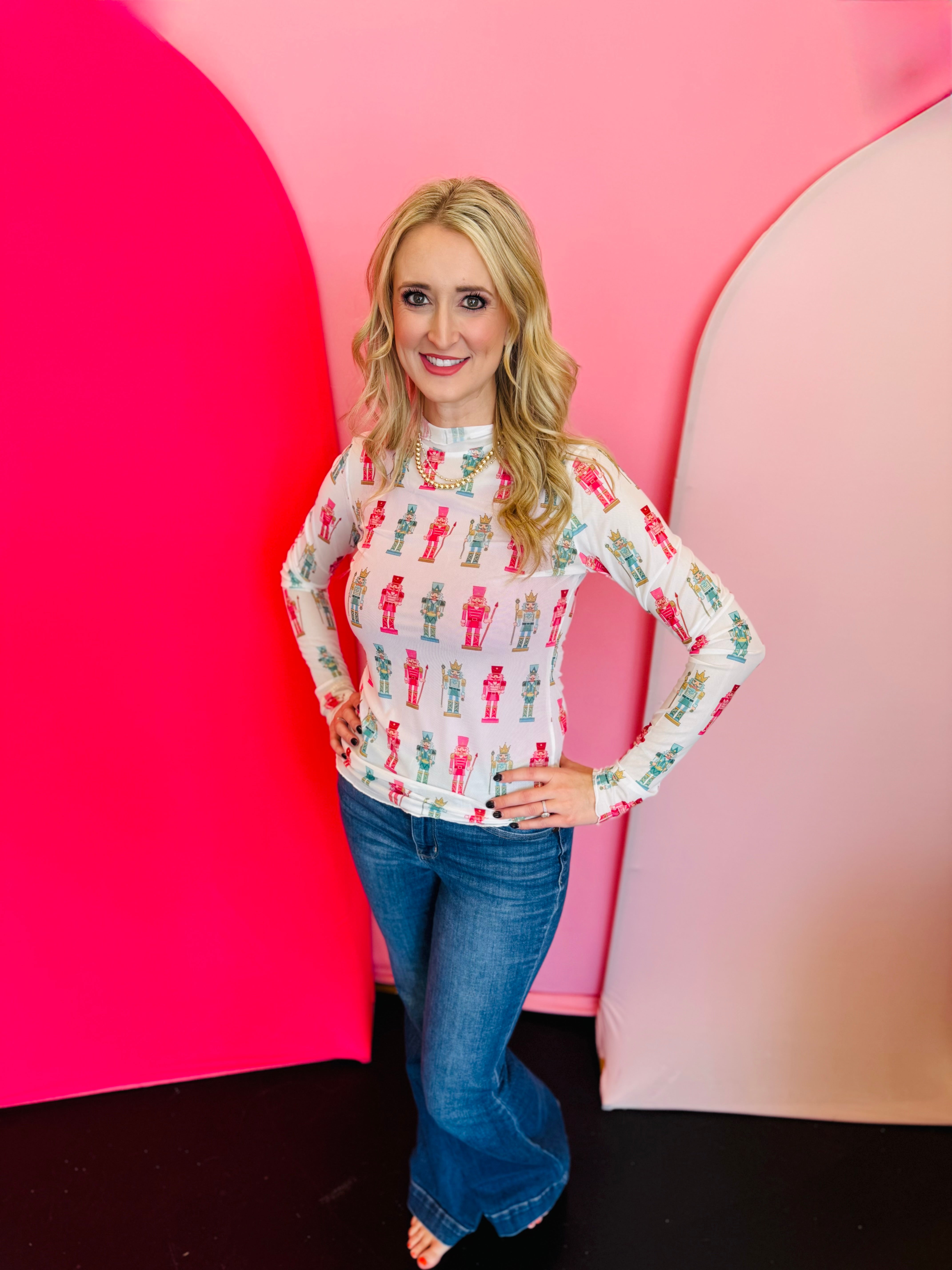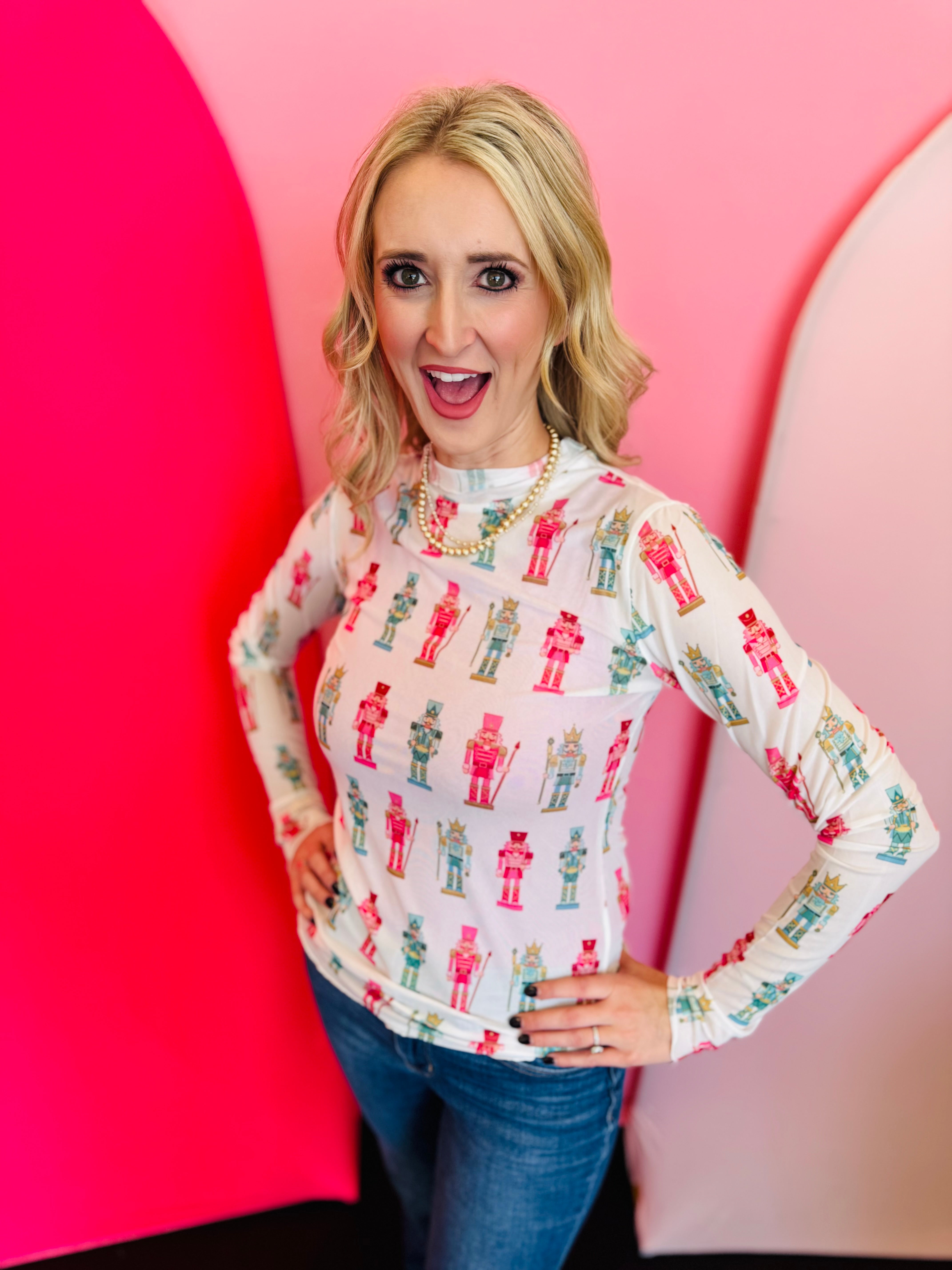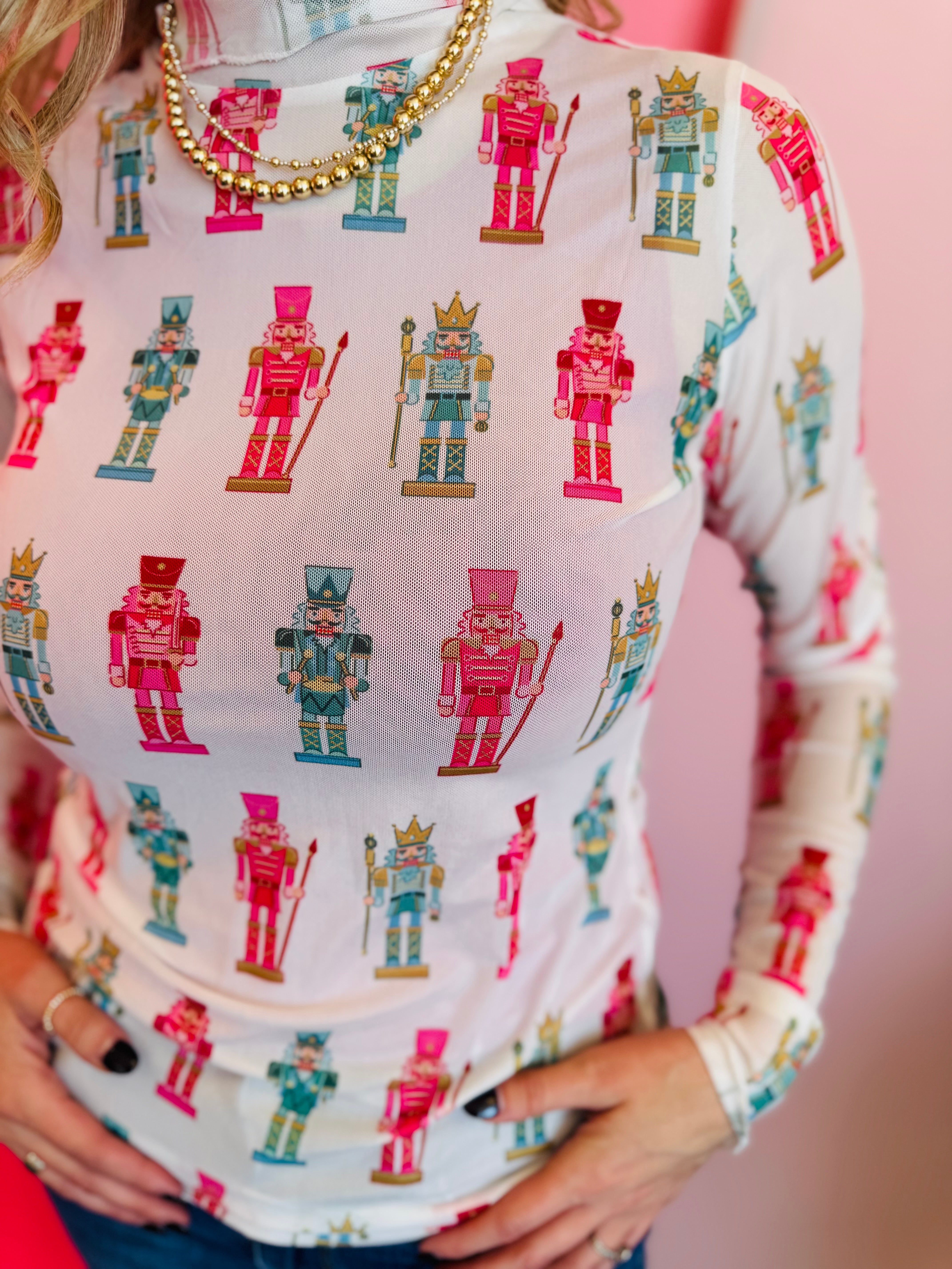 Add a festive twist to your fashion lineup with the Keigan Holiday Nutcrackers Mesh Top, a playful and on-trend piece that brings holiday cheer to your wardrobe. Made from a soft, stretchy blend of 95% polyester and 5% spandex, this sheer mesh top features whimsical Nutcracker graphics throughout, paired with lettuce hems and a chic mock neckline for a flattering, feminine touch. The lightweight, breathable fabric makes it perfect for layering under sweaters, graphic tees, or blazers, or wearing on its own for a bold, festive statement. Whether you’re dressing up for a party or adding personality to your everyday style, this Nutcracker mesh top delivers comfort, sparkle, and seasonal charm in one stylish piece.