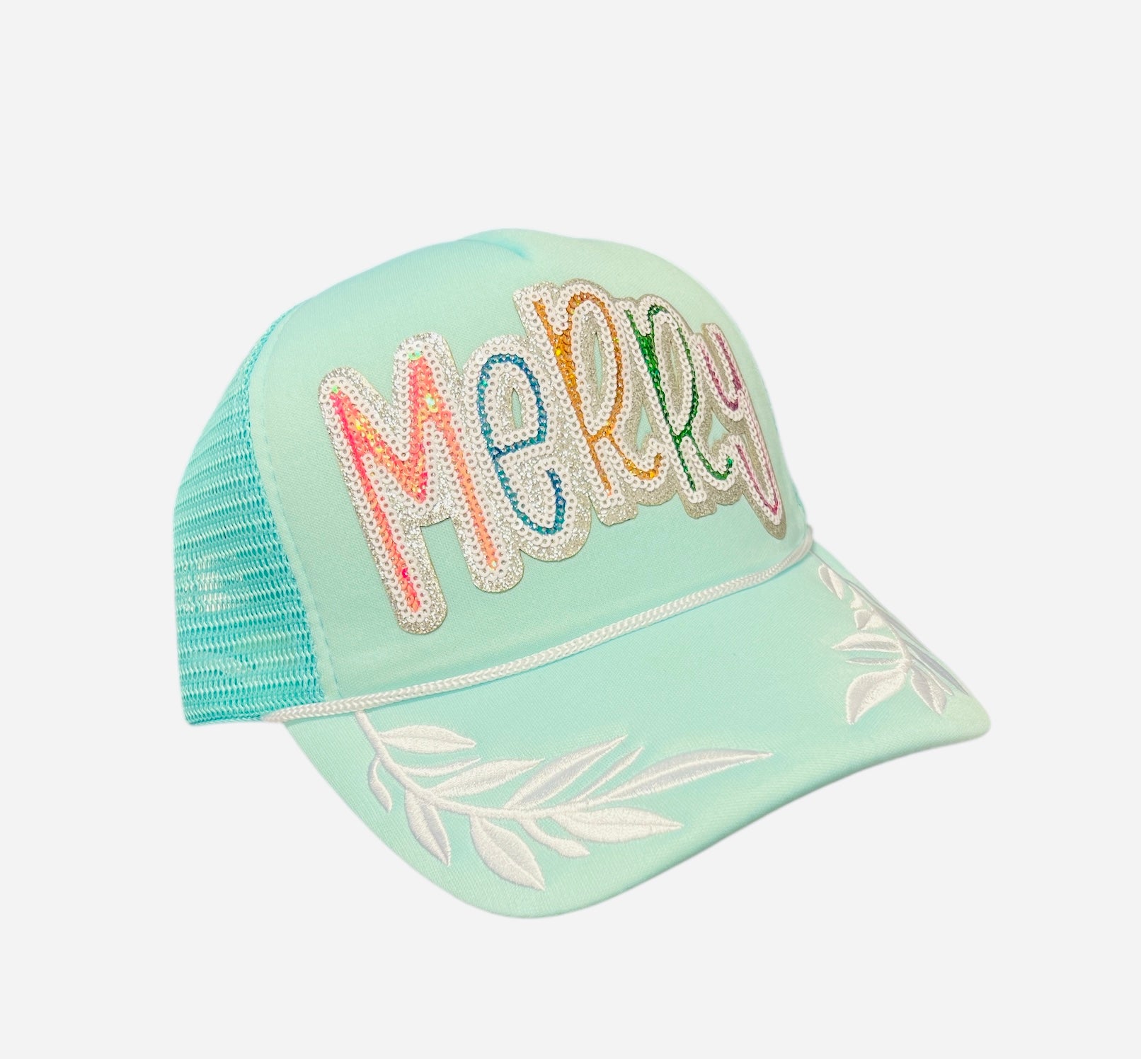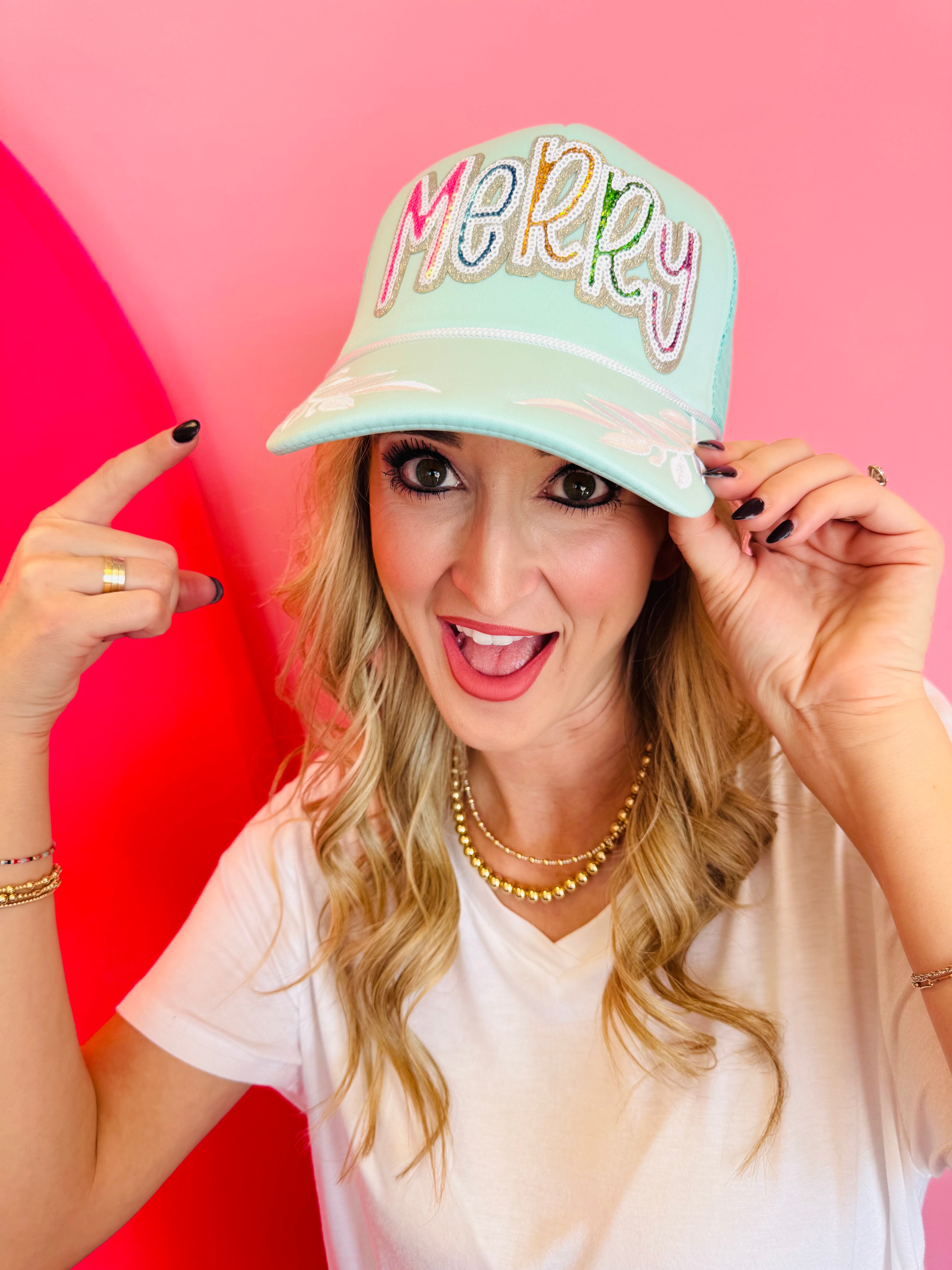 Add sparkle and cheer to your holiday look with our Mint Sequin Merry Trucker Hat, a festive accessory that shines as bright as your Christmas spirit! This mint-colored trucker hat features a colorful sequin “Merry” patch across the front, bursting with vibrant, multicolor sequins that catch the light beautifully. The design is perfectly accented with embroidered white leaf details along the brim for a touch of holiday charm and texture. With its classic mesh back and adjustable snap closure, this hat offers both comfort and breathability for everyday wear. Whether you’re wrapping gifts, running errands, or heading to a holiday party, this sequin Merry hat adds a playful, festive flair to any outfit.