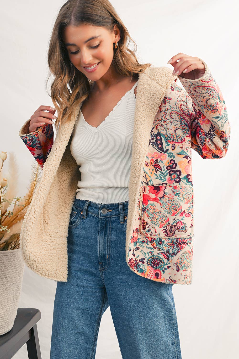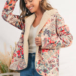 Cozy up in effortless style with our Paisley Sherpa Hooded Jacket, a warm and whimsical layer designed for everyday comfort. This soft cream jacket showcases a beautiful mix of floral and paisley prints in warm pinks, corals, and subtle blues, creating a charming boho-inspired look that instantly elevates your outfit. The interior is fully lined with plush Sherpa—extending through the collar for extra warmth—making it the perfect throw-on piece for chilly mornings, errands, or relaxed weekend outings. The open-front fit adds ease and versatility, allowing you to layer over tees, sweaters, or lounge sets with effortless comfort. Crafted from 100% polyester, this jacket offers a cozy feel without bulk, delivering both warmth and style for the season ahead.