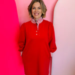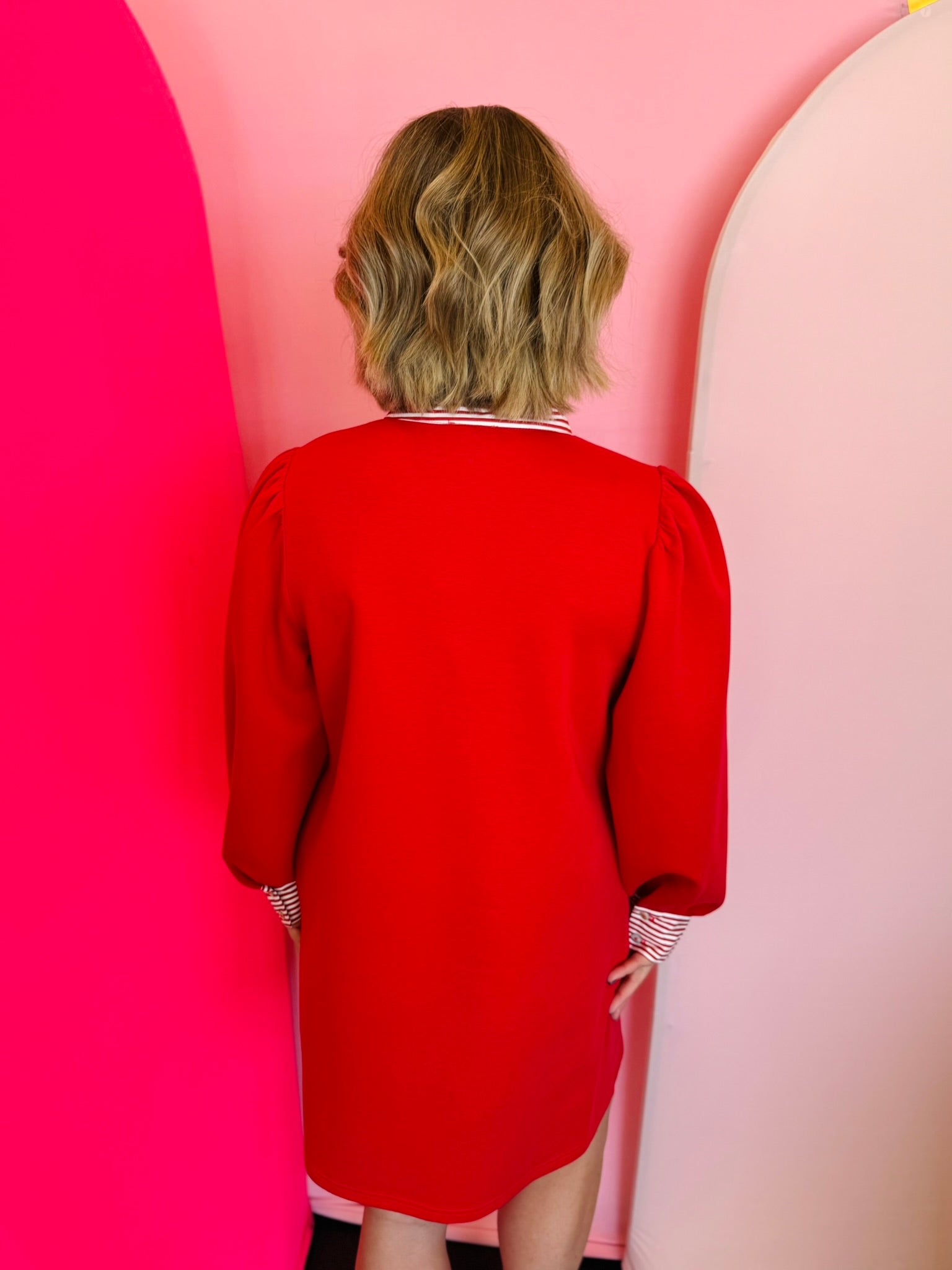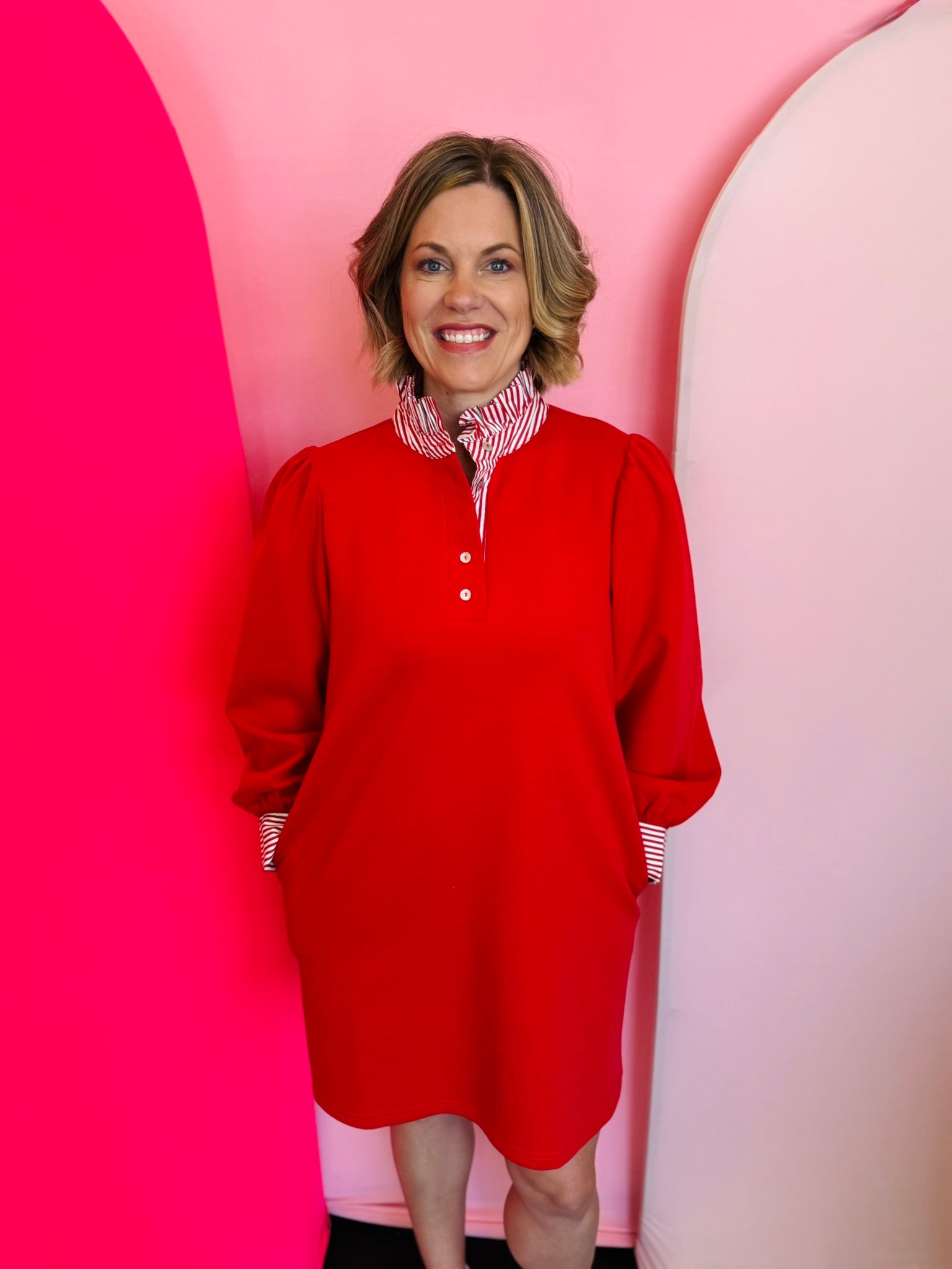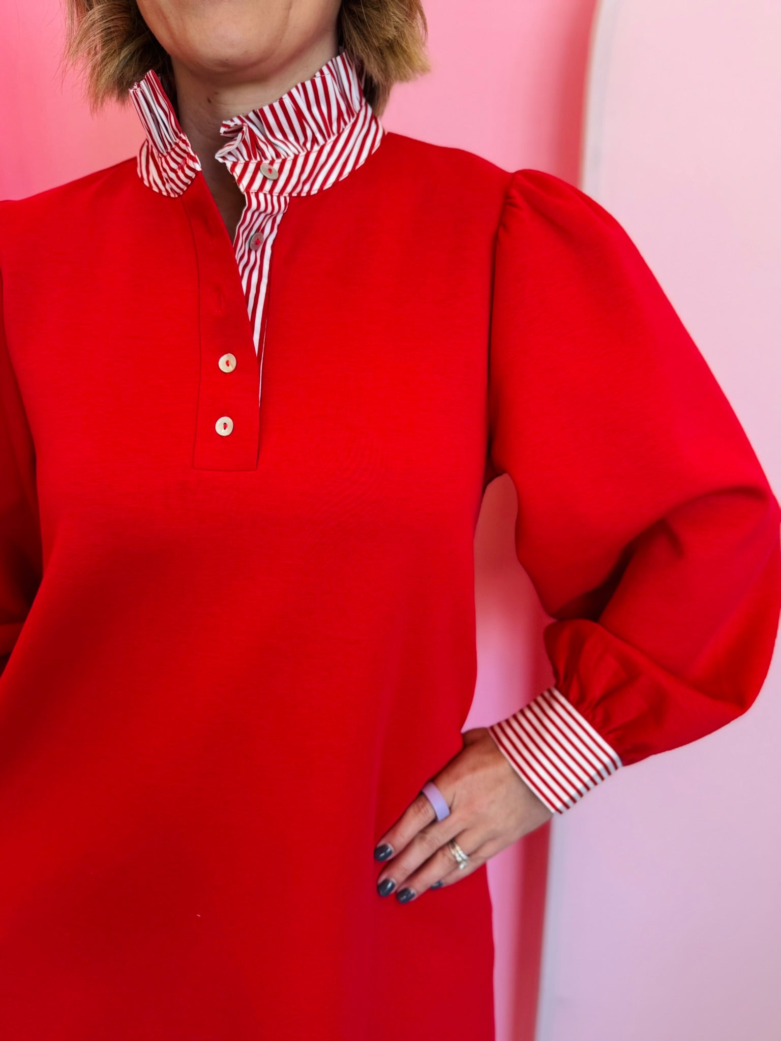 Turn heads with timeless charm in the Red Ruffle Collar Dress, a classic and feminine piece designed to elevate any occasion. This stunning red mini dress features a flattering A-line silhouette that moves beautifully with every step, making it perfect for holiday events, date nights, church, brunch, or festive gatherings. The standout detail is the elegant red and white ruffled mock neck, complete with matching cuff accents for a polished, coordinated look.
