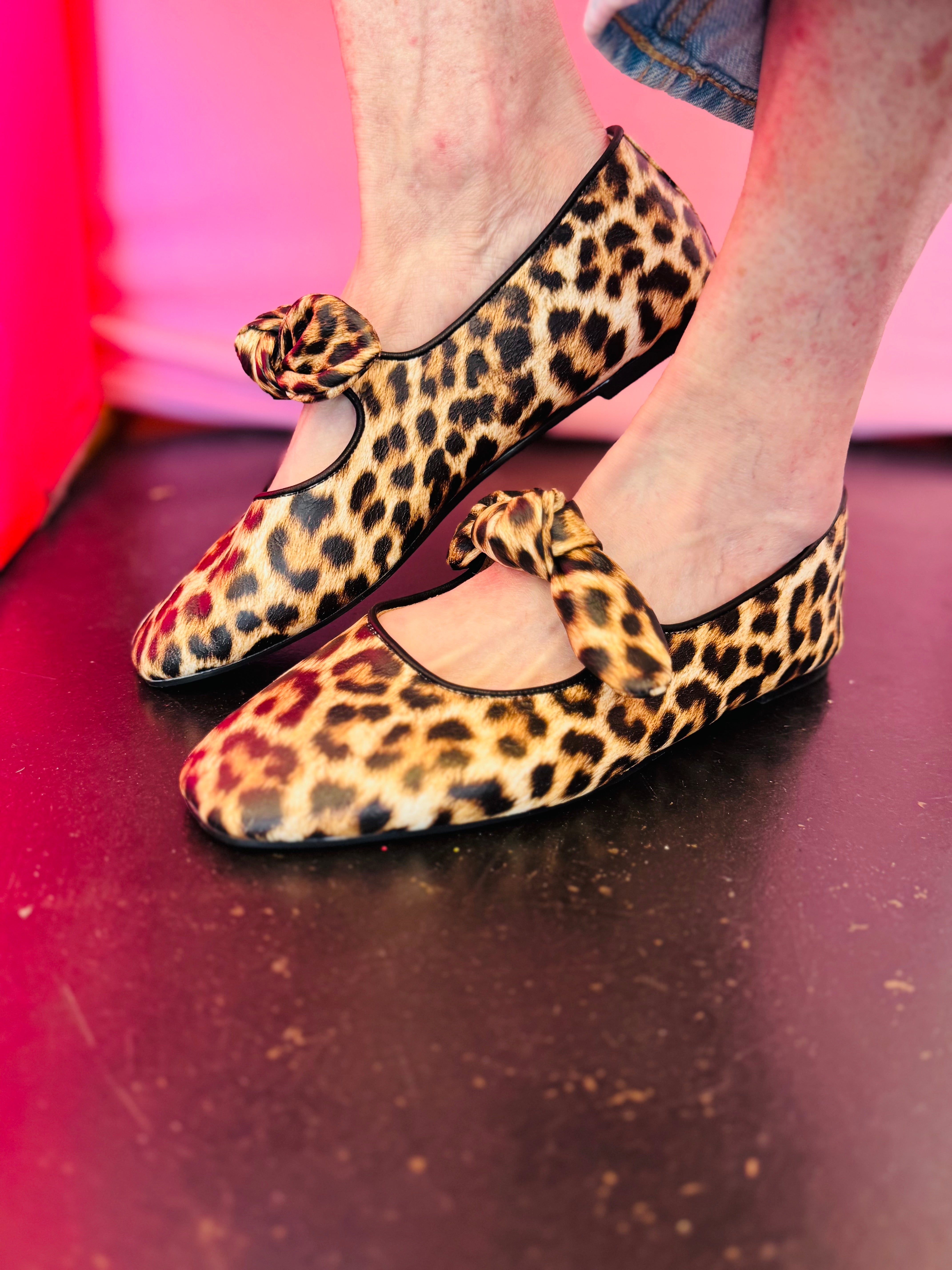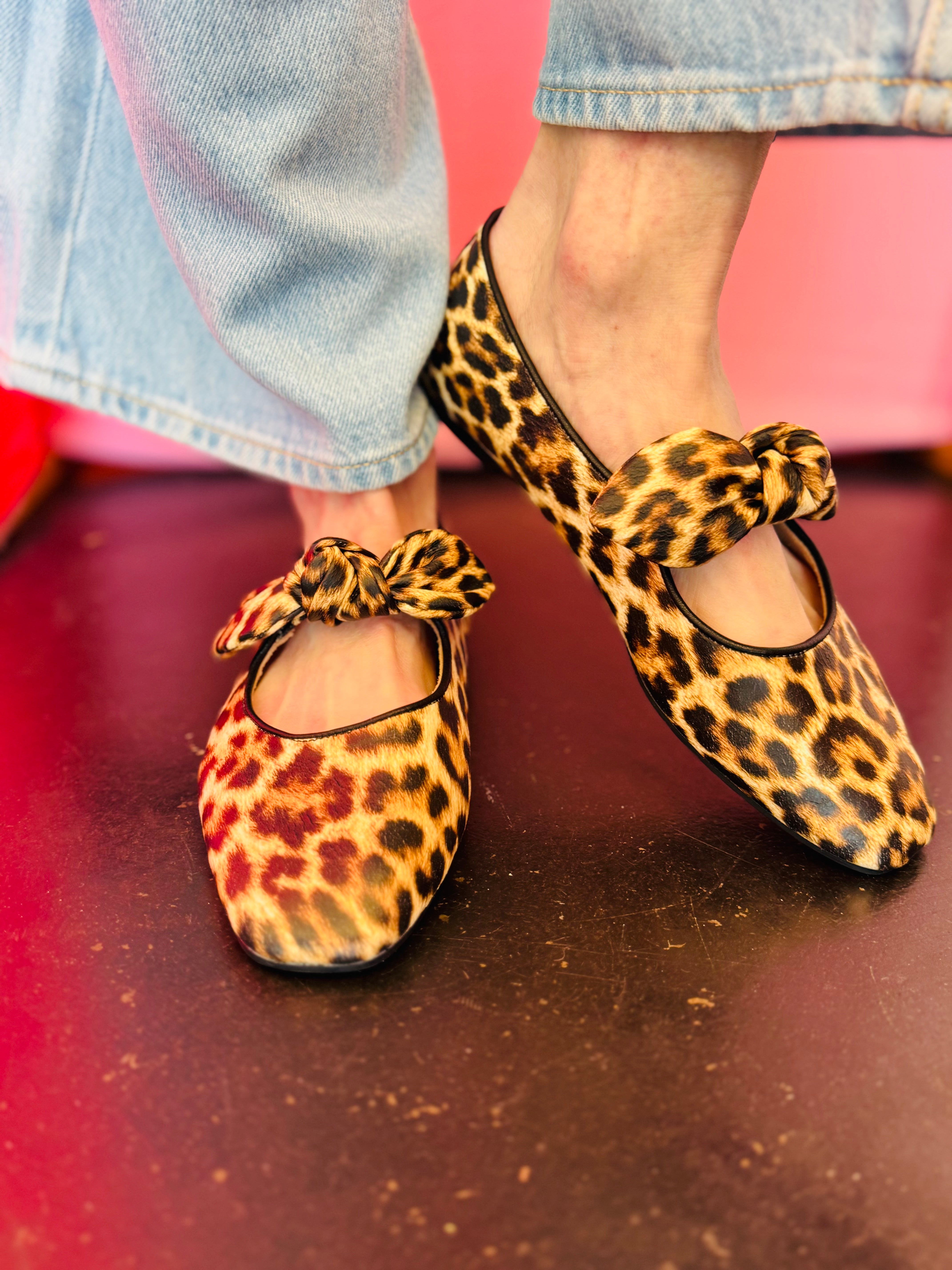 Designed in a classic leopard print, these chic flats feature a modern squared-off toe that adds a fashion-forward edge while maintaining timeless appeal. The soft oversized bow detail creates a playful, elegant finish that instantly elevates any outfit.