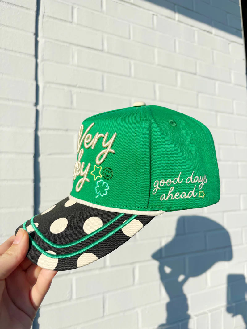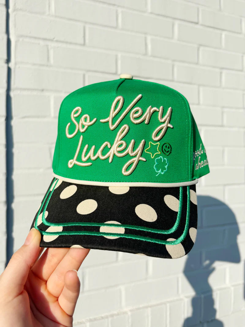 Featuring a vibrant green crown, this cap stands out with raised “So Very Lucky” embroidery across the front for a bold, eye-catching look. The black bill with bold white polka dots adds contrast and personality, while bright green accents and stitched details give the hat a unique boutique feel.