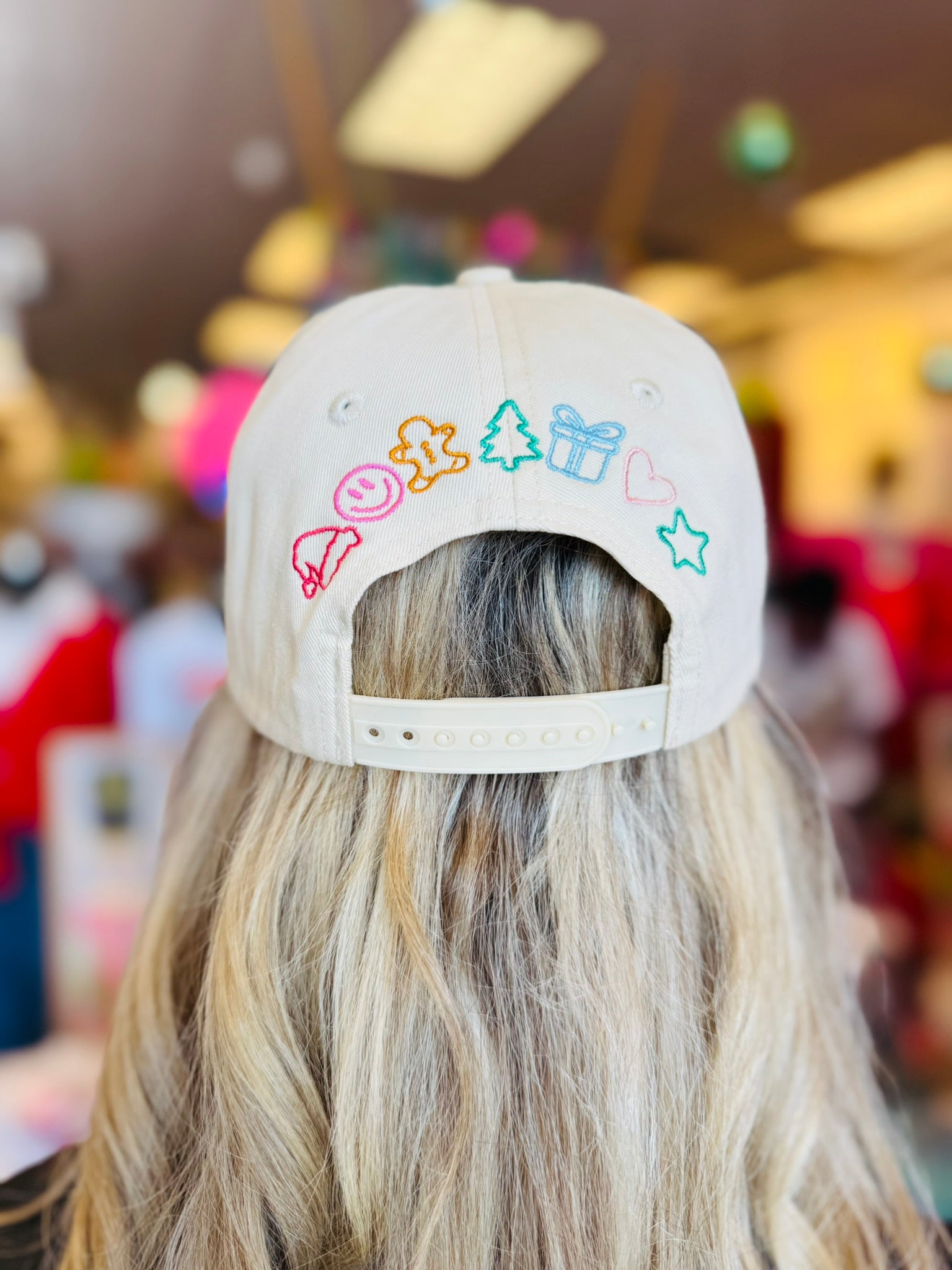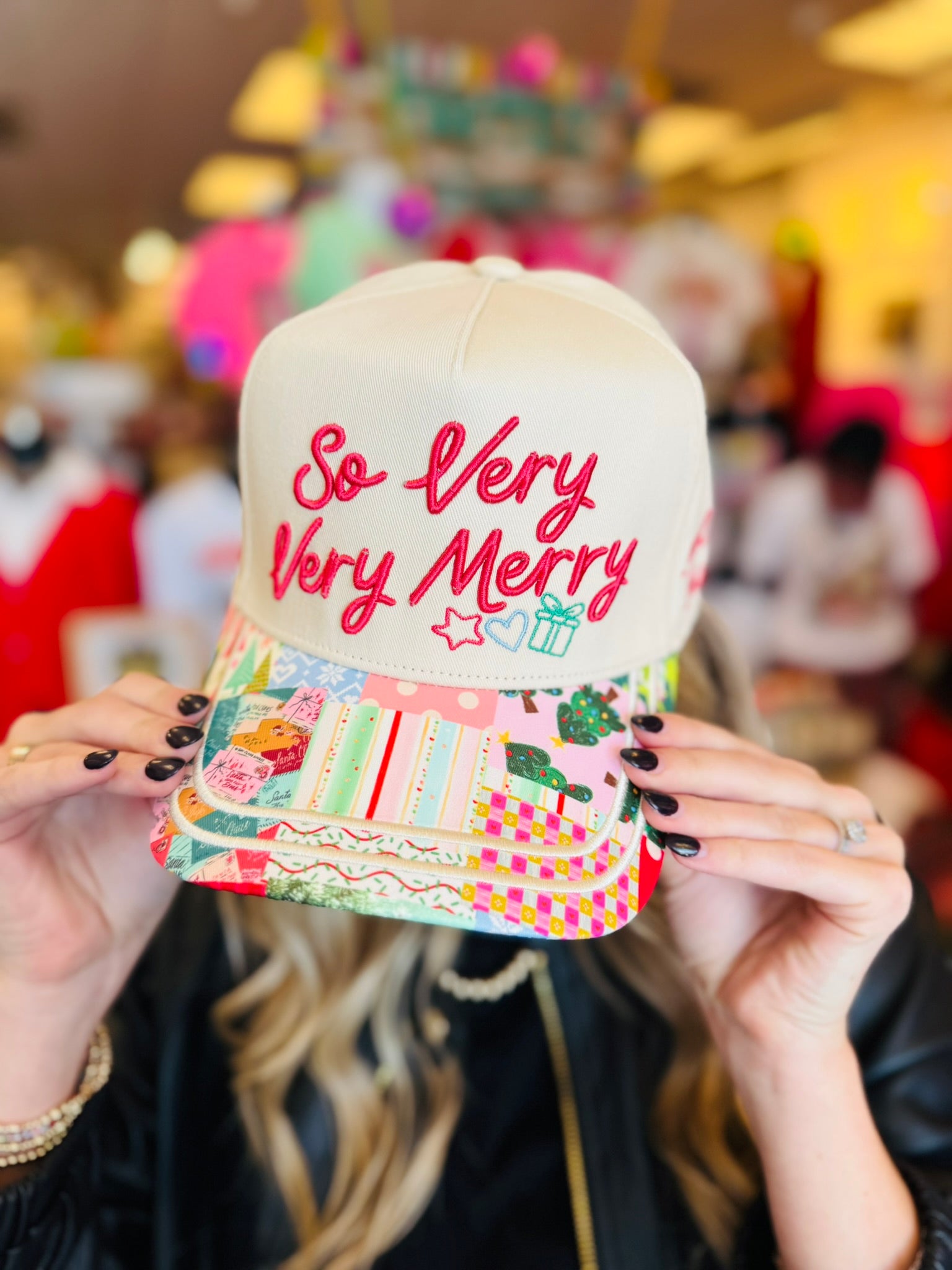 White canvas hat with red “So Very Very Merry” embroidery, festive icons, and Christmas-themed brim.