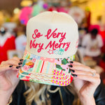 • White canvas holiday trucker hat with red “So Very Very Merry” embroidery