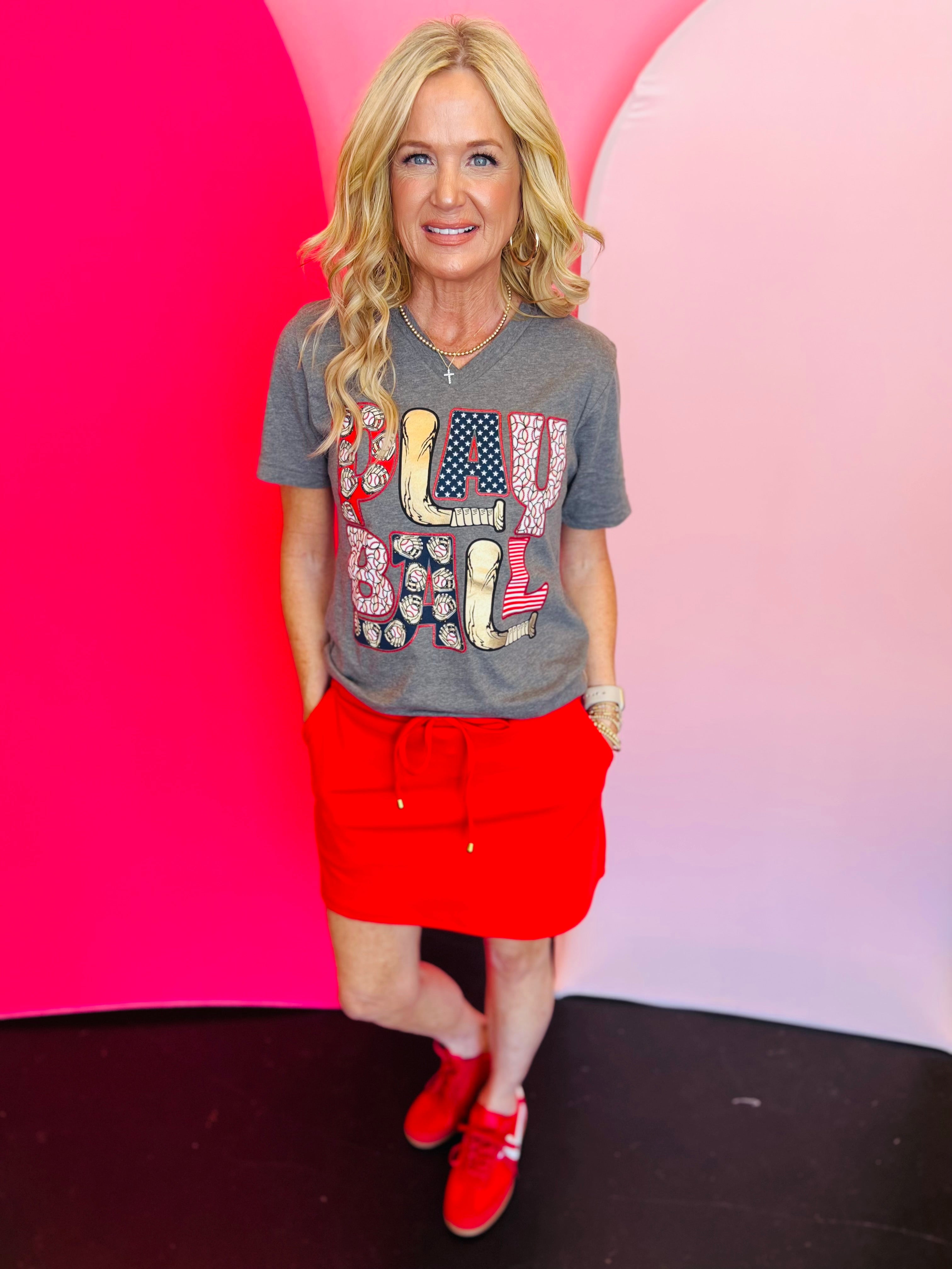The elastic band across the back creates a flattering, flexible fit, while the adjustable drawstring allows you to customize the feel for all-day comfort. Functional side pockets add practical convenience without compromising style. Easy to pair with graphic tees, tanks, sneakers, or sandals, this skort transitions effortlessly from casual daytime outings to sporty-chic moments. Bold, comfortable, and easy to wear, the Solid Red Skort is a statement staple you’ll reach for again and again.