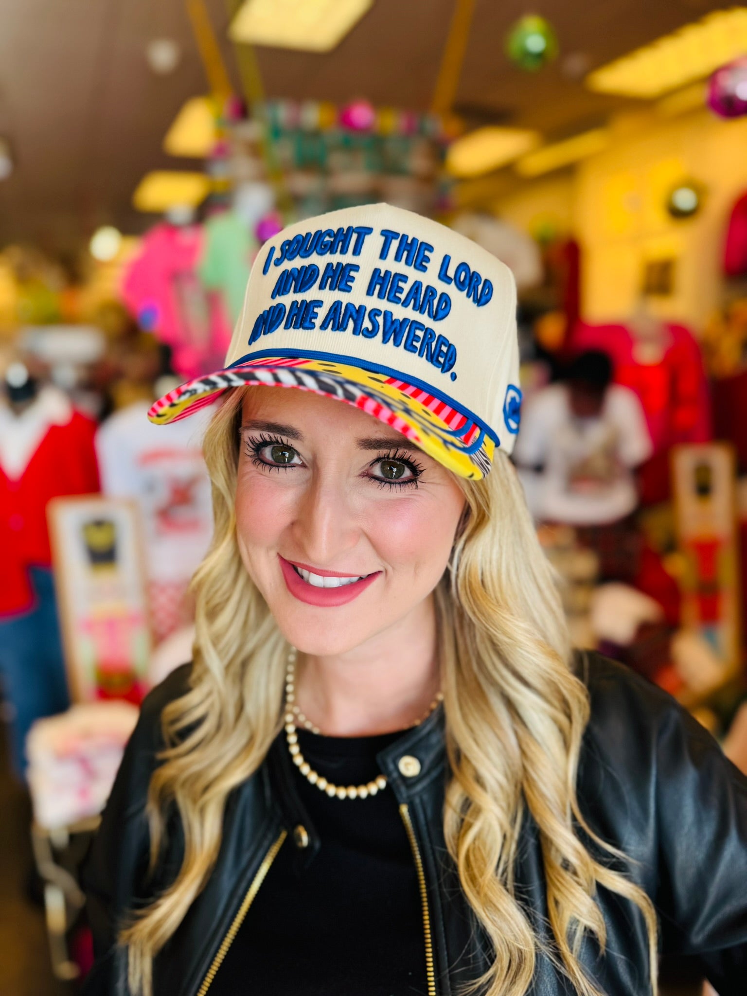 Embroidered “I Sought The Lord” trucker hat with Psalm 34:1–14 and unique fabric bill pattern.