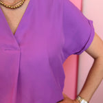 Soft, elegant, and endlessly wearable, the Whitney Lavender Woven Blouse brings a fresh, feminine touch to your wardrobe. Crafted from a lightweight, soft woven fabric, this blouse drapes beautifully for a polished yet effortless look that transitions seamlessly from desk to dinner. The modern V-neckline adds a flattering, refined shape, while the cuffed short sleeves offer subtle structure and year-round versatility. Its dreamy lavender hue delivers a gentle pop of color that pairs effortlessly with denim, white pants, tailored trousers, skirts, or layered pieces like blazers and cardigans. Made from 100% polyester, this blouse is breathable, comfortable, and ideal for creating chic, elevated outfits for work, weekends, or everyday wear.