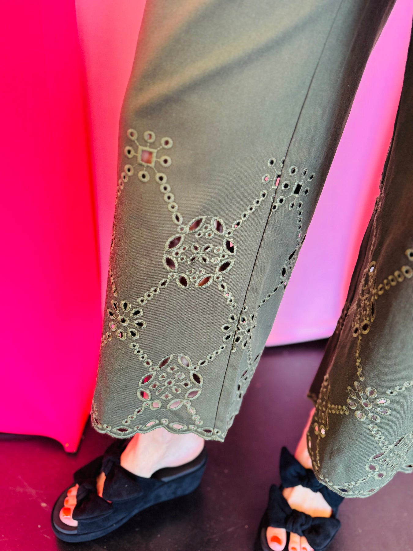 Add a touch of effortless elegance to your wardrobe with our Olive Eyelet Hem Pants. These chic straight-leg pants feature delicate eyelet cutout detailing at the hem, giving a feminine twist to a classic silhouette. Designed with both comfort and style in mind, they include a zip-fly button closure, an elasticized waistband at the back for an adjustable fit, and side pockets for everyday practicality. Crafted from 100% cotton, the lightweight woven fabric feels soft and breathable—perfect for warm-weather days or easy layering in cooler months. Whether dressed up with heels or styled casually with sandals, these versatile pants bring timeless sophistication to any outfit.
