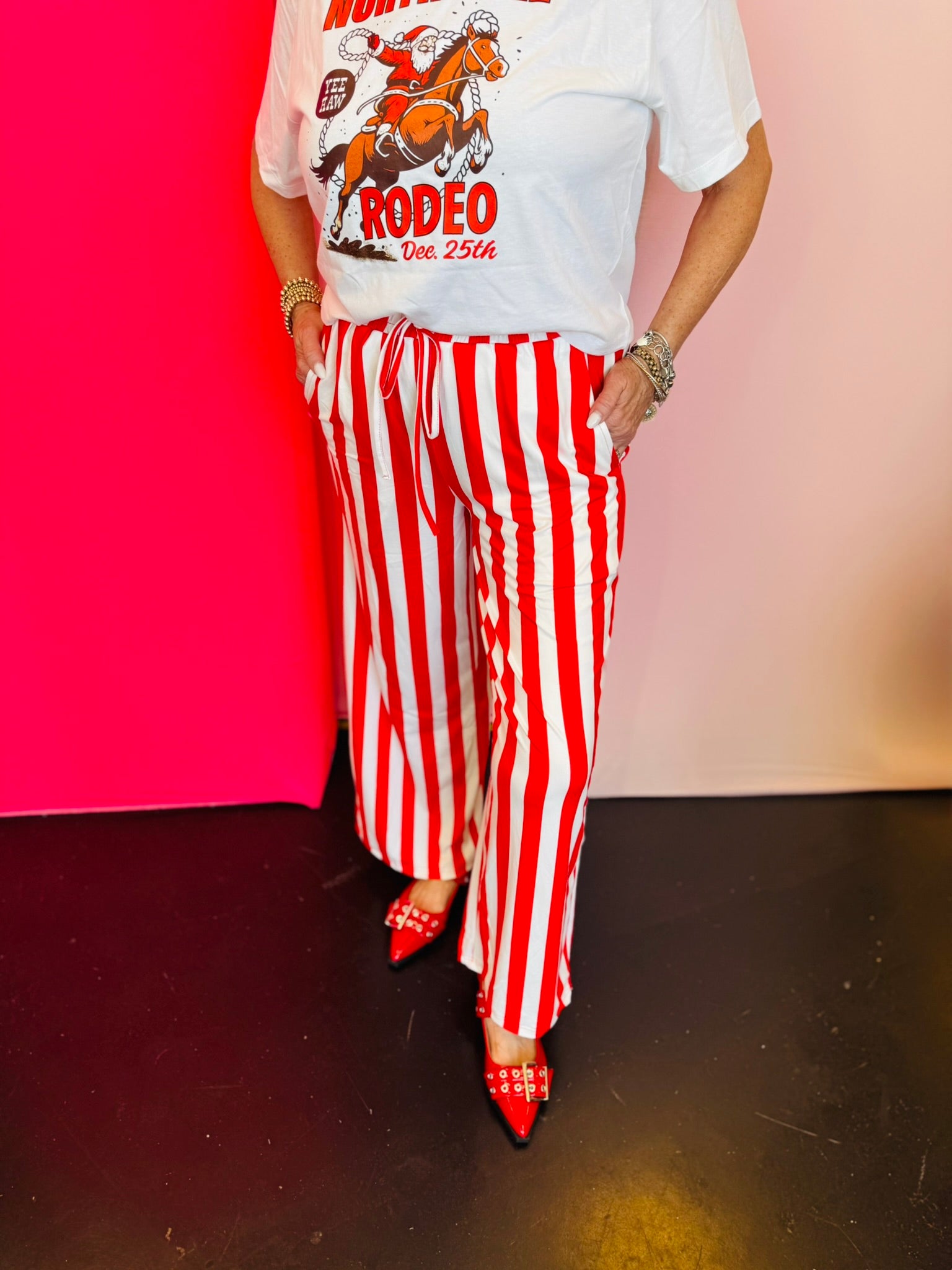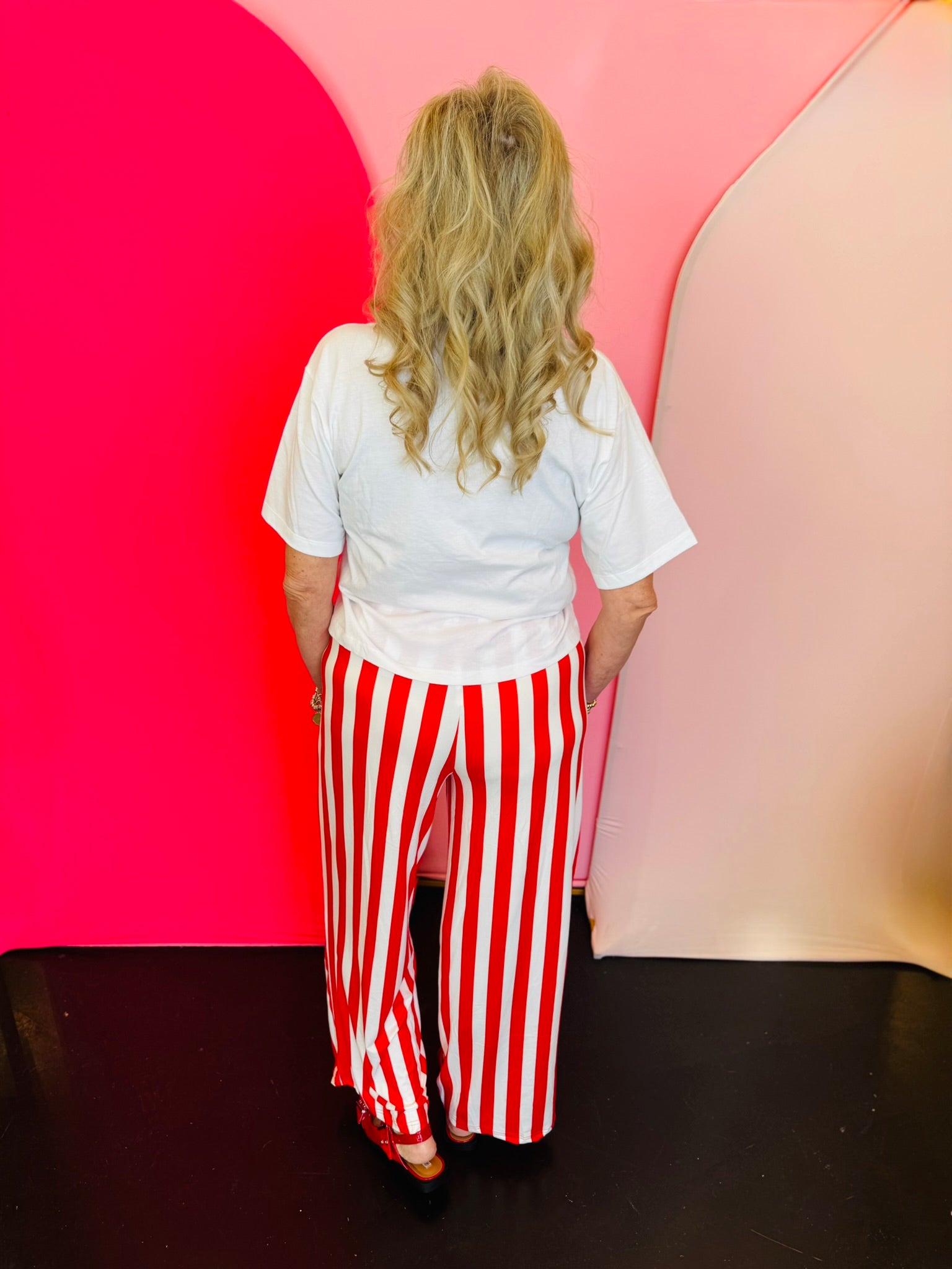 Add a bold pop of style to your holiday wardrobe with the Red Vertical Stripe Pants, designed for ultimate comfort and effortless flair. Made from a cloud-soft, ultra-stretchy fabric blend, these pants deliver the perfect balance of cozy and chic. The vertical red and white stripe pattern elongates your silhouette, while the elastic waistband with a faux drawstring ensures an easy, flattering fit. Side pockets add practical charm, and the wide-leg cut creates a relaxed yet polished look. Ideal for festive lounging, pajama parties, or pairing with your favorite holiday graphic tee, these pants bring both comfort and character to any outfit. Dress them up or down for a fun, festive vibe all season long.