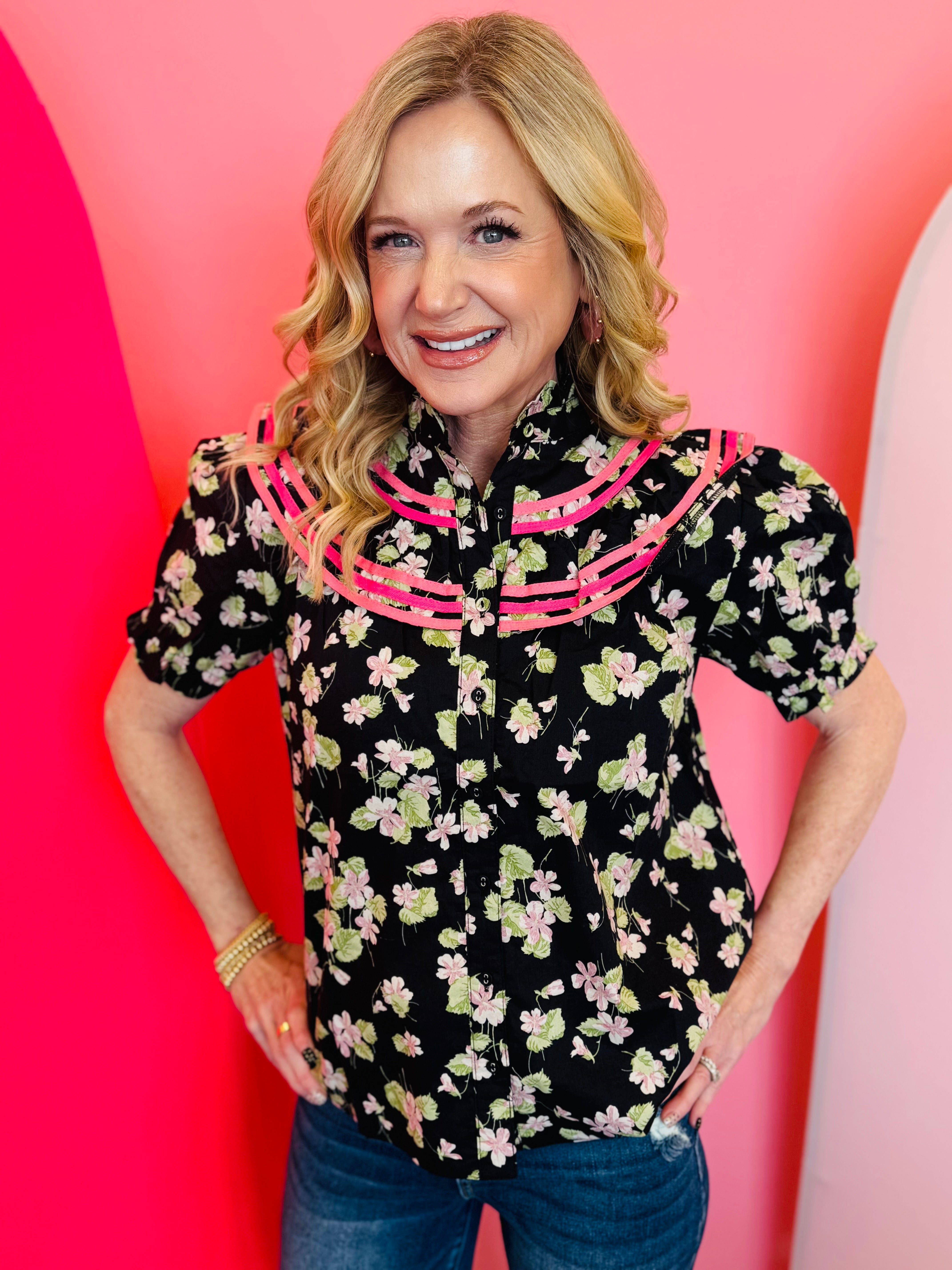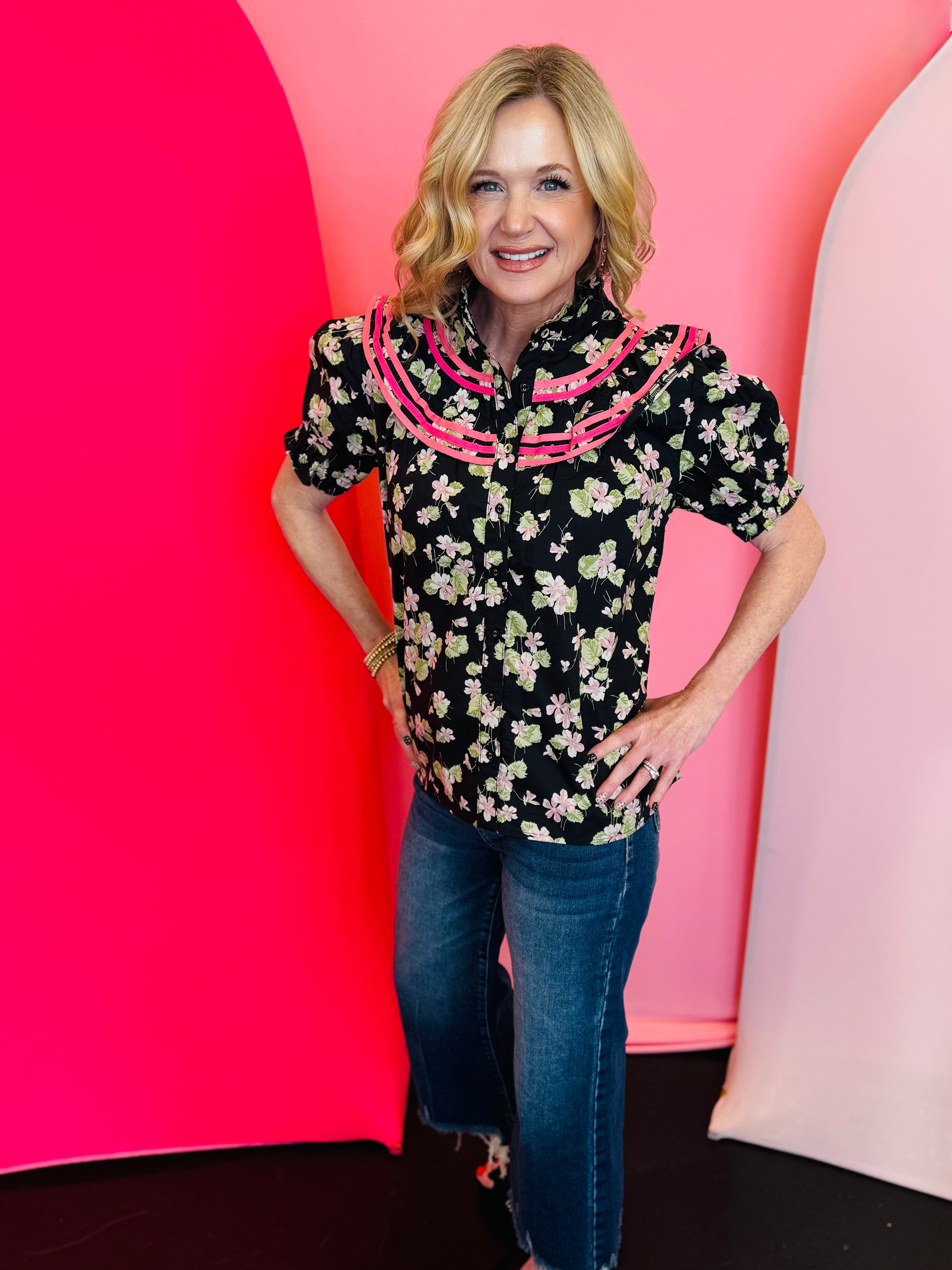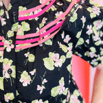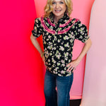 Bring timeless femininity to your wardrobe with our Vintage Bloom Ruffle Top, a romantic and refined piece designed to elevate everyday dressing. Crafted from breathable 100% cotton, this blouse features a delicate allover floral print set against a classic black background, creating a beautiful contrast that feels both vintage-inspired and modern. The ruffle bib neckline adds soft elegance, while binding trim details enhance the collar with boutique-worthy craftsmanship. Short puff sleeves offer gentle volume for a flattering silhouette that pairs effortlessly with denim, skirts, or tailored pants. Lightweight and easy to style, this top is perfect for work, brunch, or any occasion where you want to feel polished and effortlessly chic.