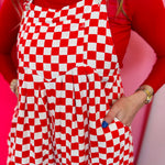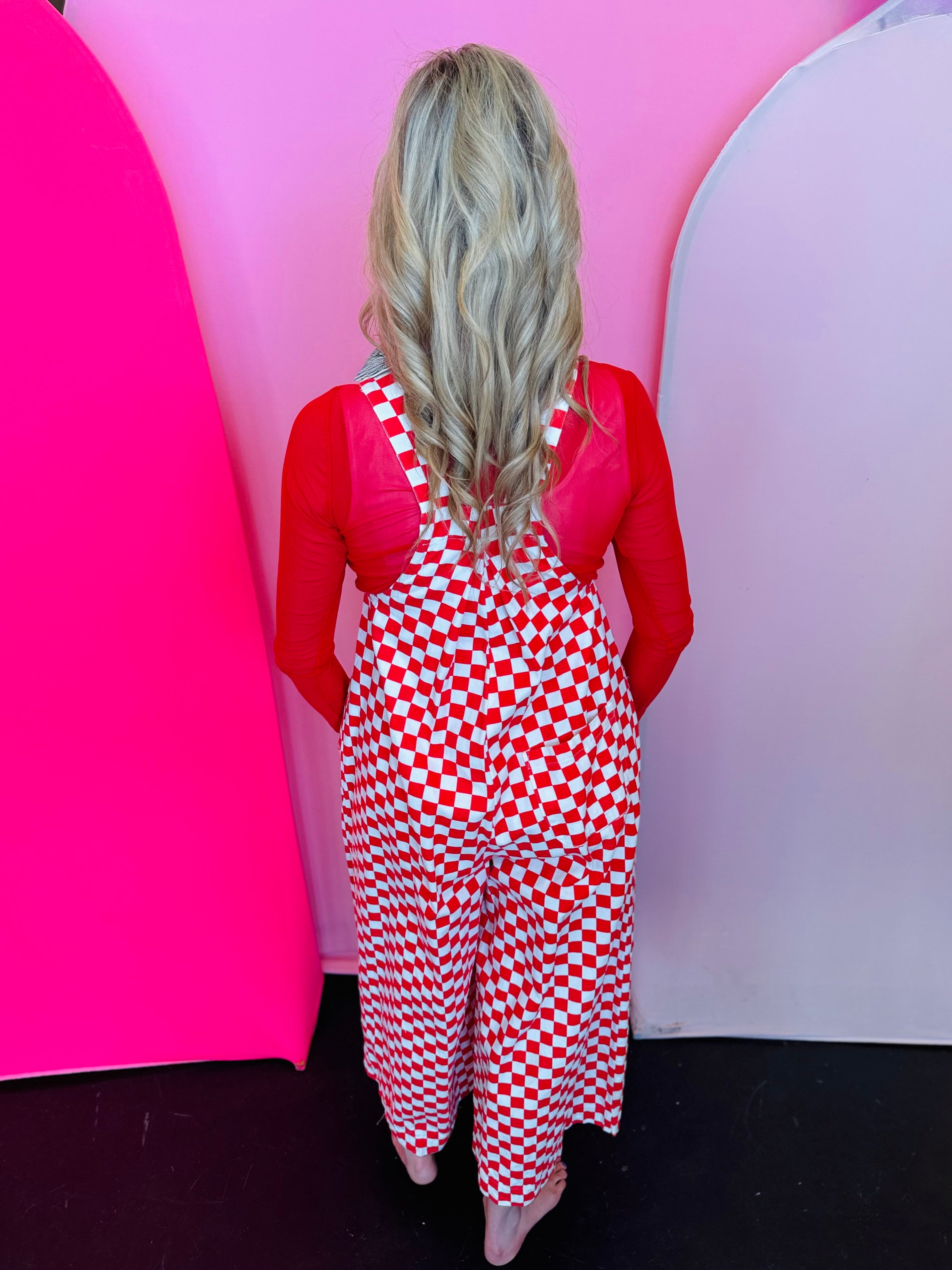 Get ready to stand out in the crowd with our Red Plaid Overalls, the ultimate statement piece for any game day! These fun and festive overalls feature a bold, red and white checkerboard plaid print that is perfect for showing your team spirit. Crafted from 100% cotton, they are breathable and comfortable for all-day wear. The design includes stylish pleats, adjustable straps for a customized fit, and a trendy wide-leg silhouette. They are the perfect blend of comfort and eye-catching style.