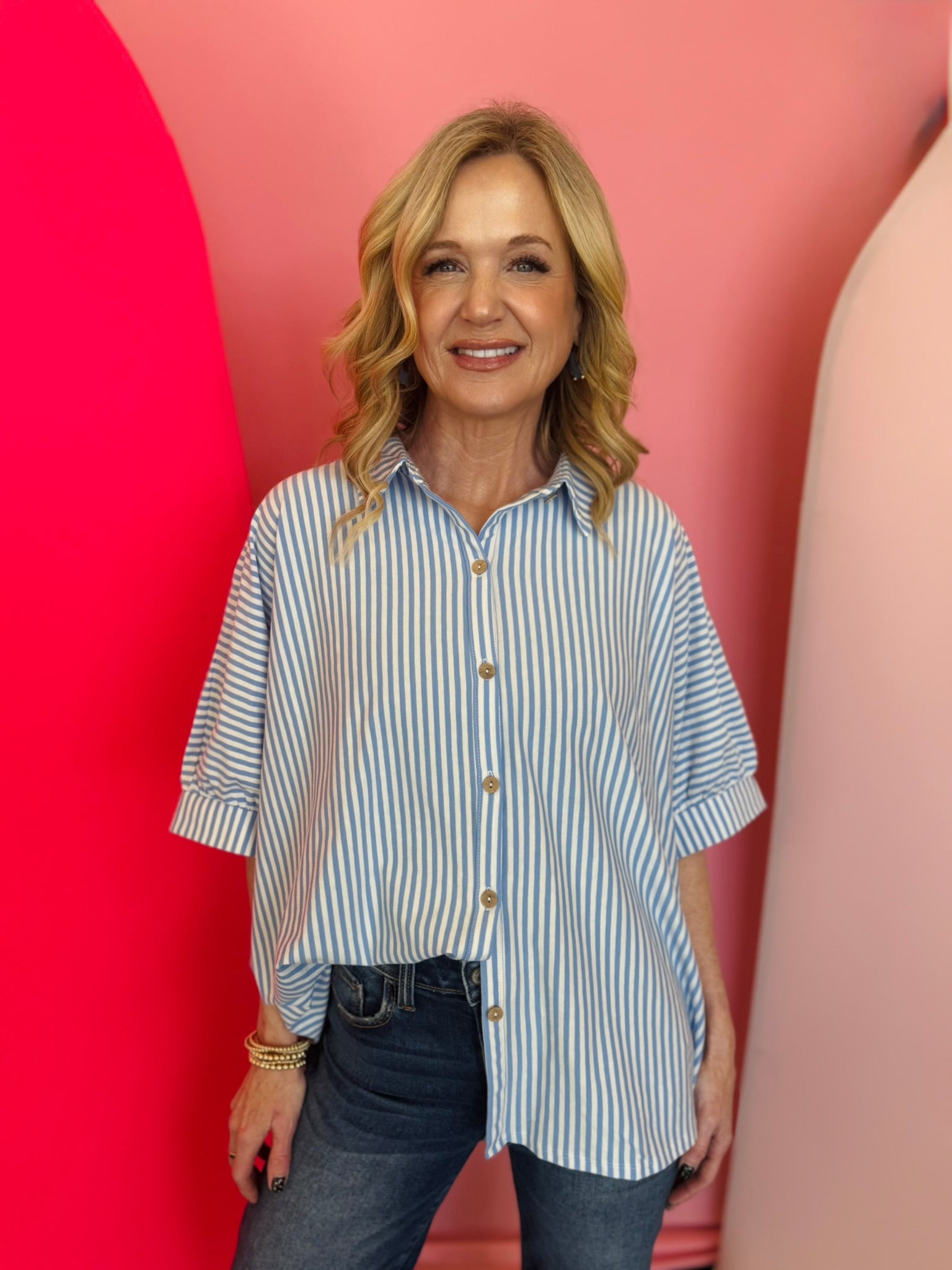 The soft cornflower blue and white vertical stripe pattern brings a calm, coastal-inspired feel to your outfit, while wide short sleeves add a modern, laid-back touch. Finished with a classic collared neckline and full button-front closure, this shirt is endlessly versatile—wear it tucked, half-tucked, open over a tank, or layered as a lightweight topper. From casual days to travel and weekend outings, this striped button down delivers effortless boutique style.