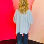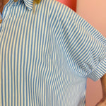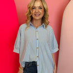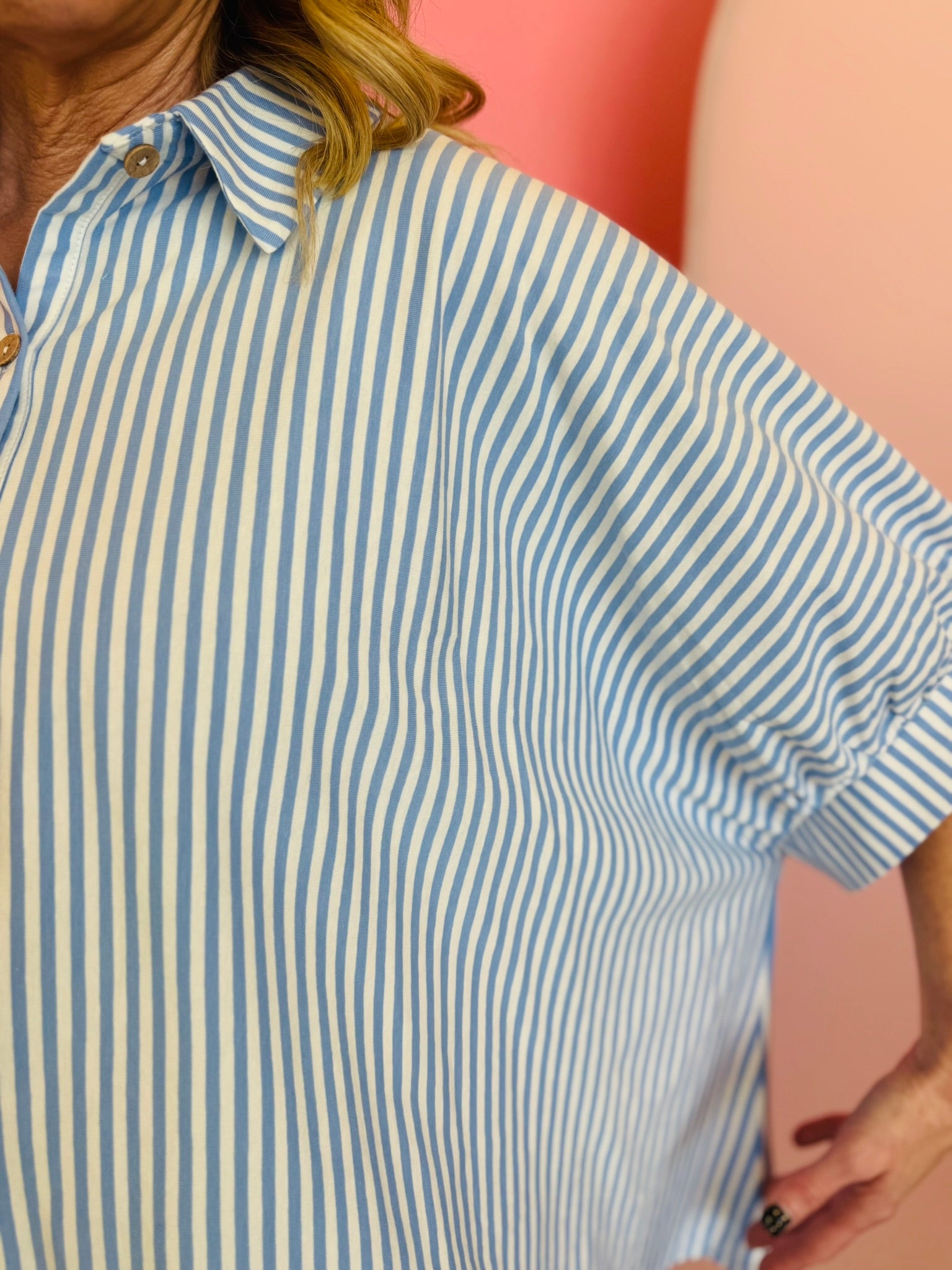 Cornflower blue striped oversized button down shirt with wide short sleeves and flowy fit.