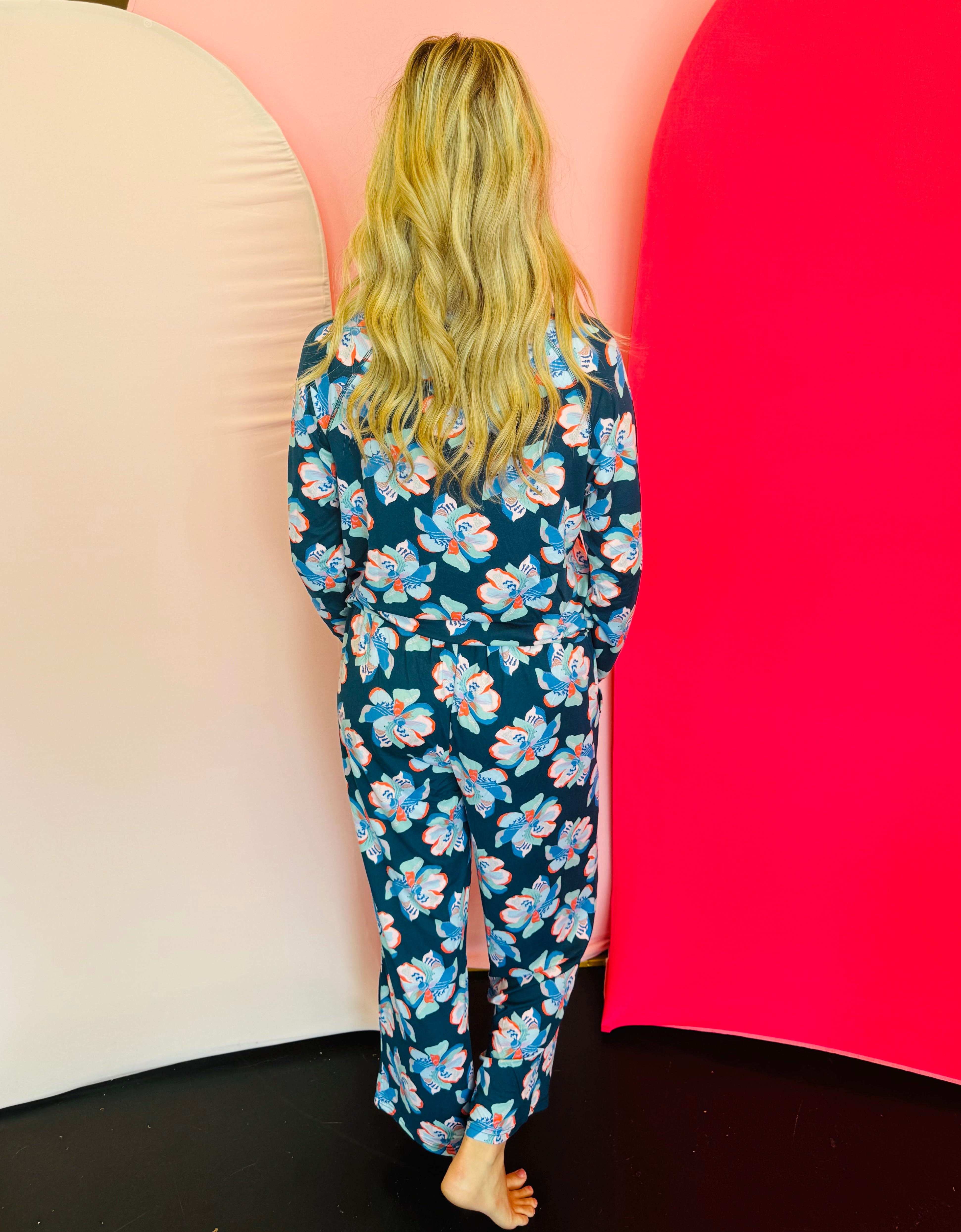 Drift off in style with our Annie Center Stage Pajamas, designed to bring bold beauty and cozy comfort to your nighttime routine. This elegant two-piece pajama set features a navy background adorned with large blue and pink floral patterns, creating a vibrant yet calming look that’s perfect for lounging or sleeping. The long sleeve top offers a rounded neckline for a soft, feminine touch, while the pull-on elastic drawstring waistband pants ensure an easy, flexible fit.
