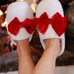 White closed-toe slippers with red bow accent, soft plush material, perfect for cozy lounging