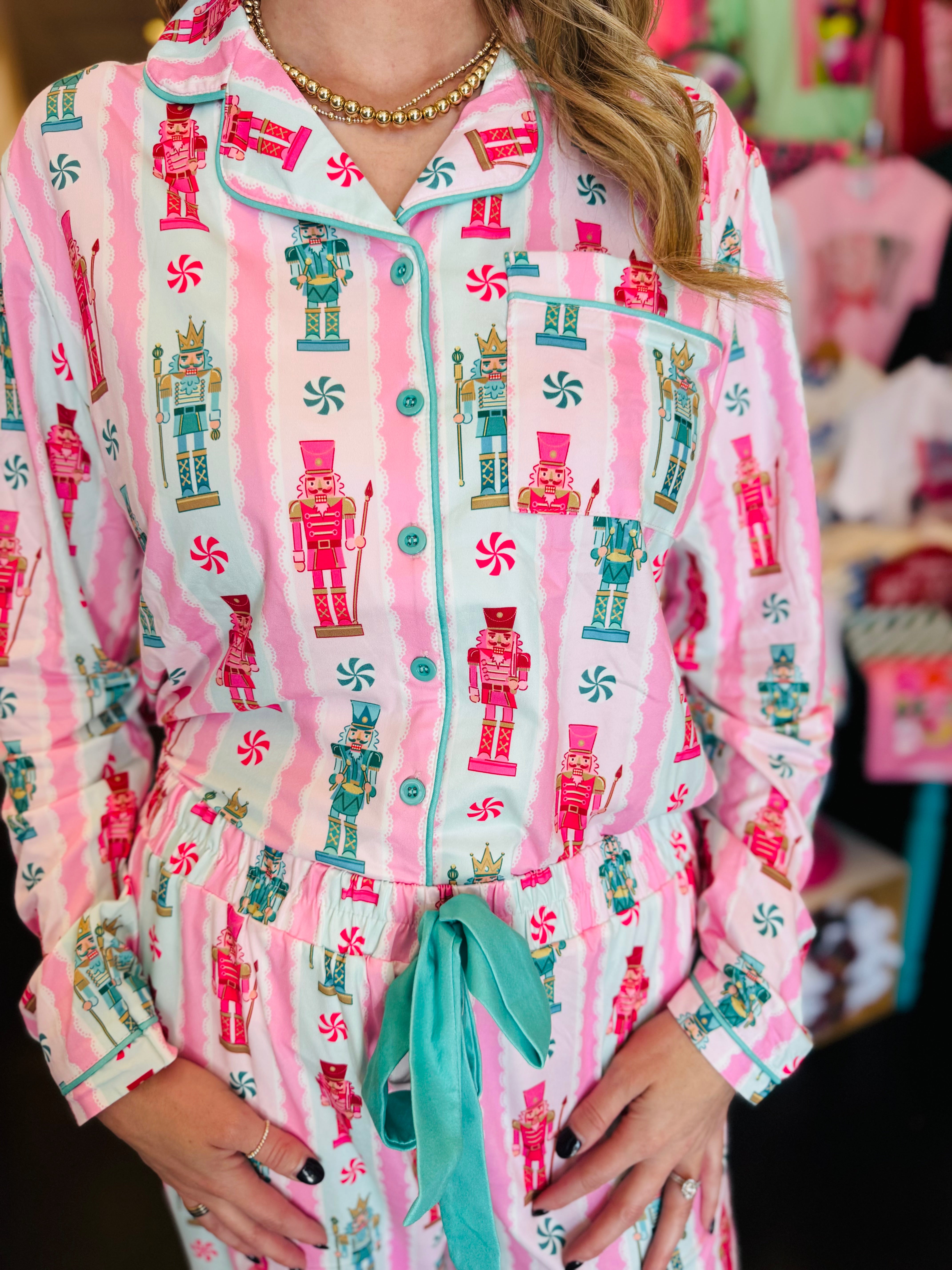 Pink and aqua nutcracker pajama set with ruffle trim and festive peppermint details.