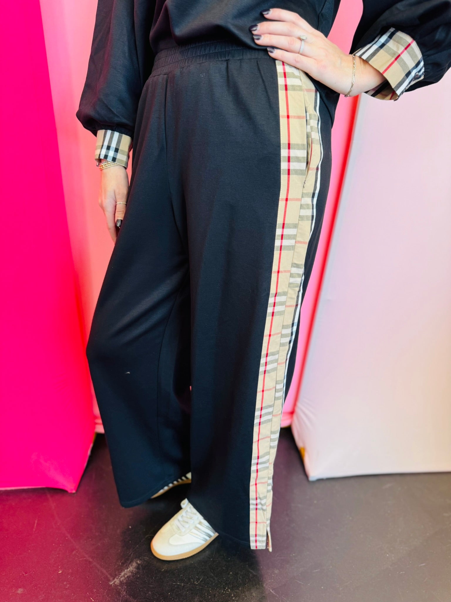 Plaid Side Stripe Wide Leg Pants