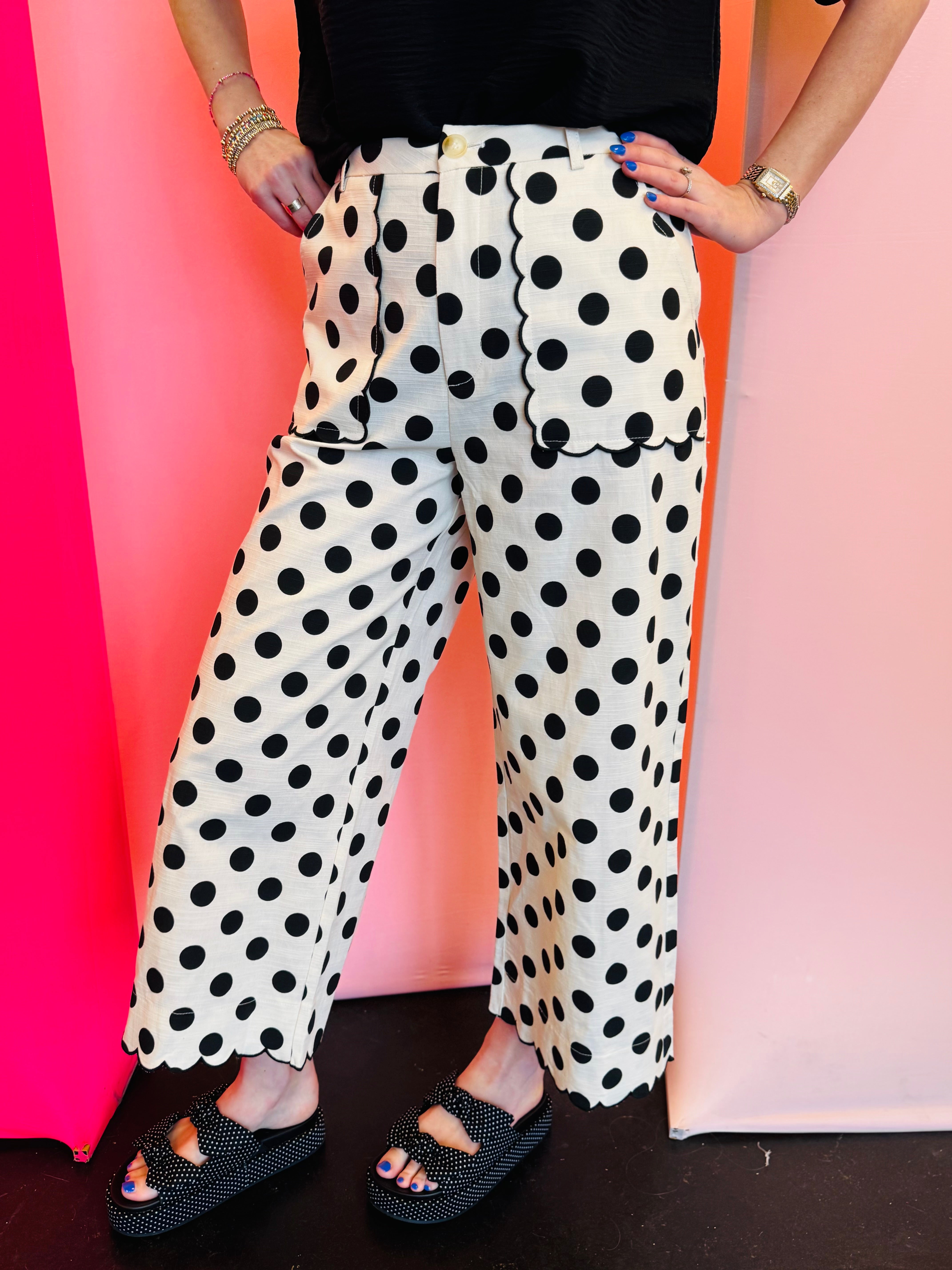 High Waist Polka Dot Wide Leg Pants with Scallop Edge Detail