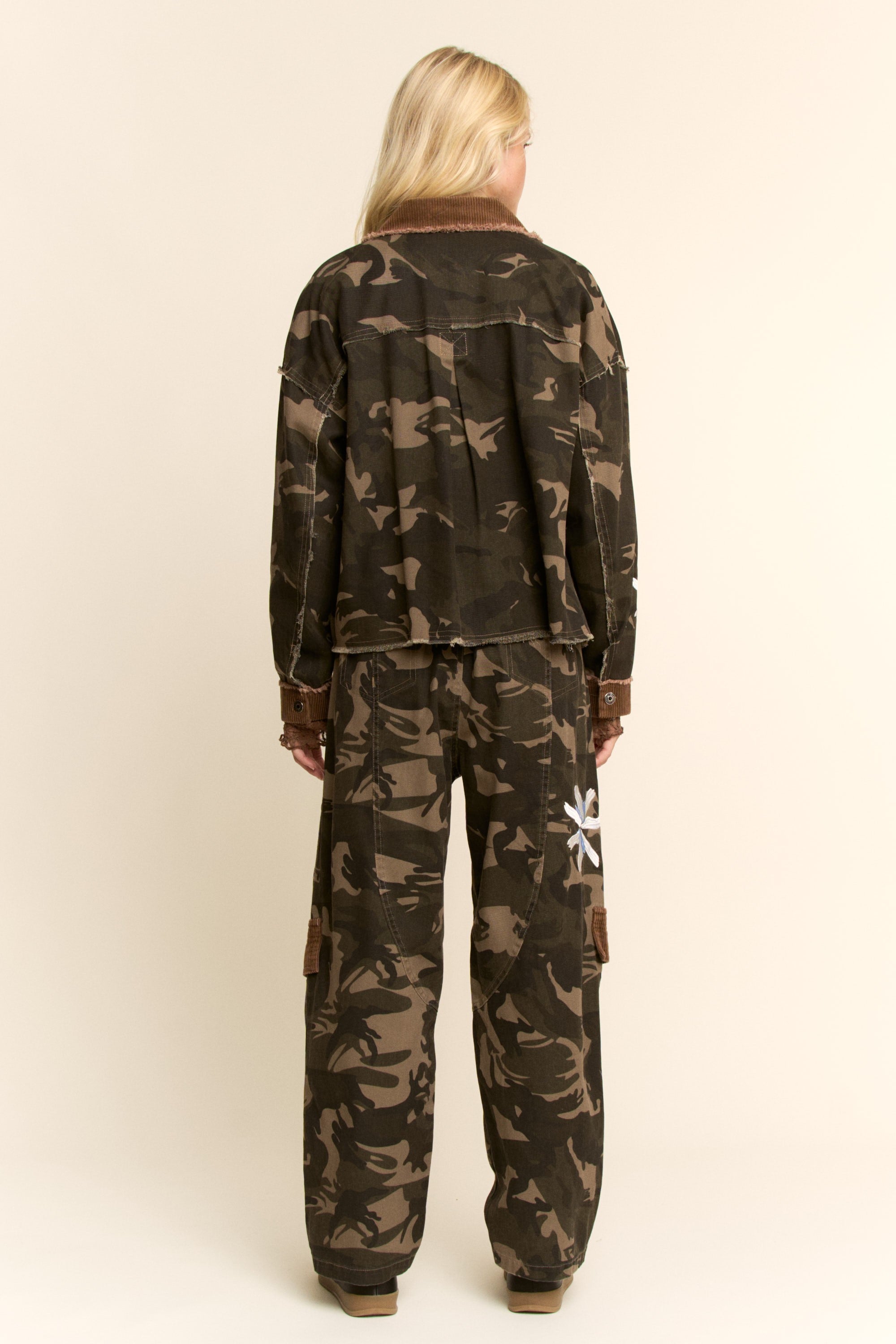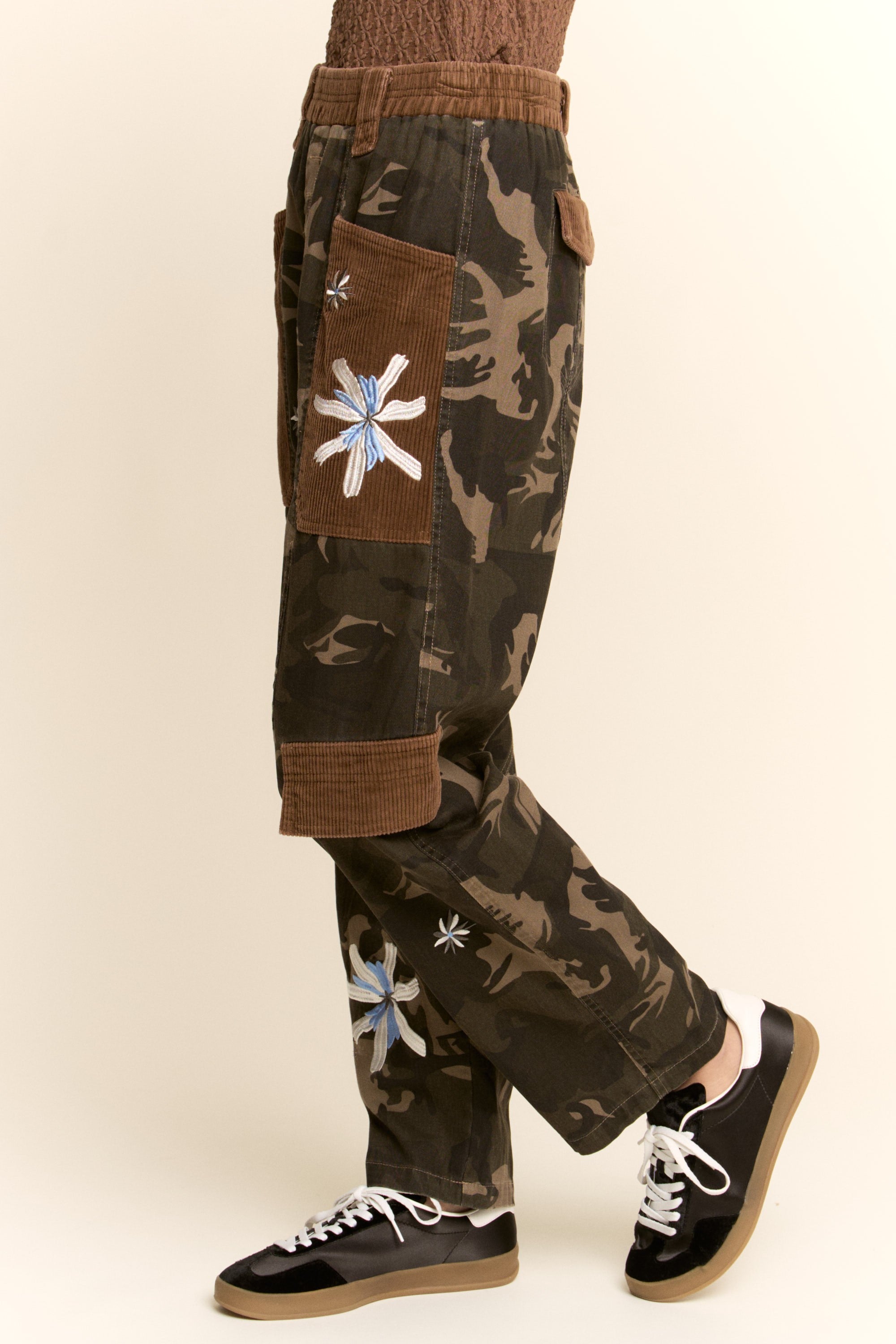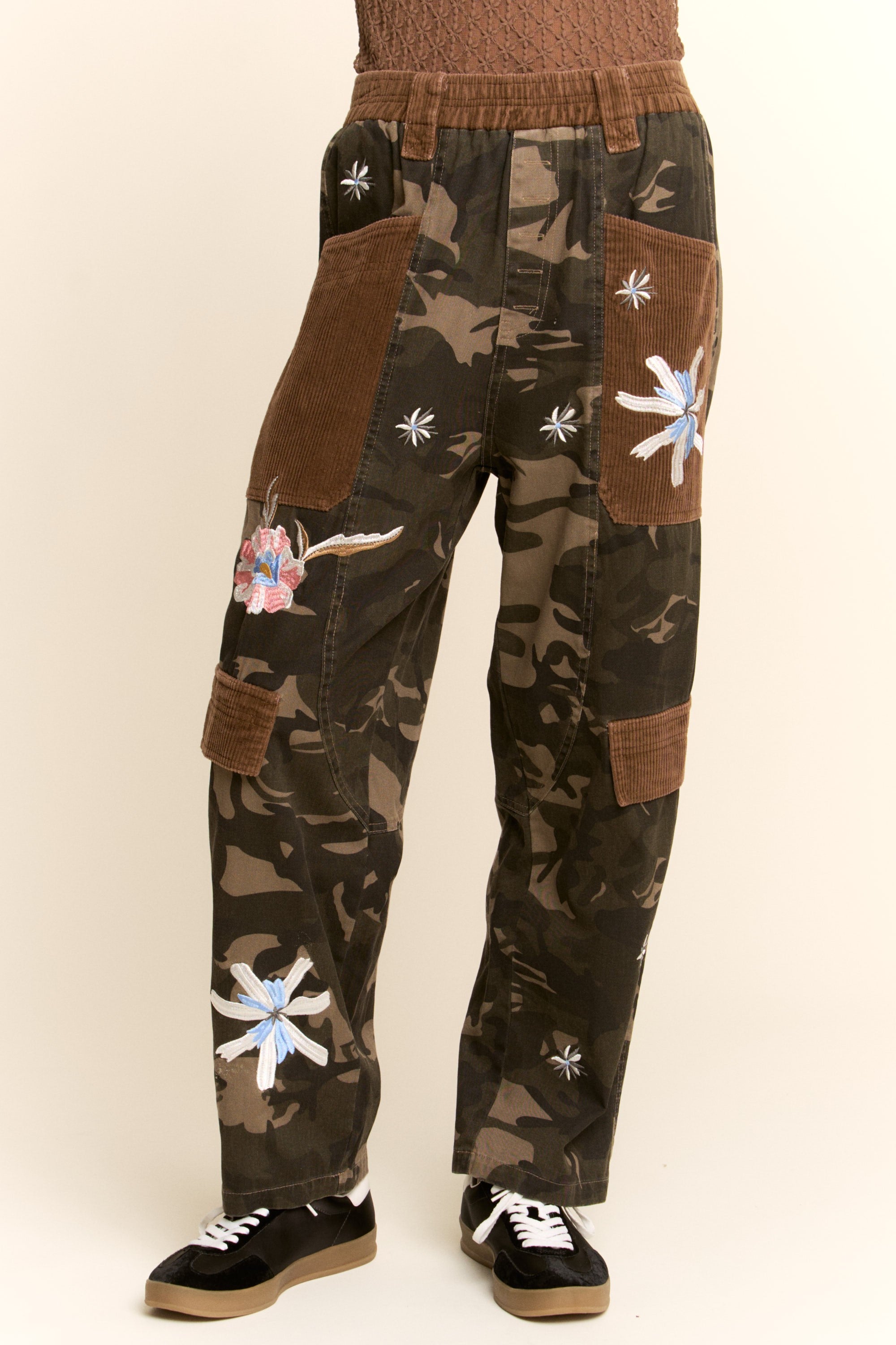 Bring standout style to everyday dressing with our Camo Floral Patch Pants, a chic blend of rugged utility and feminine detail. Crafted from 100% cotton, these pants offer breathable comfort with a soft, lived-in feel perfect for all-day wear. The classic camo print sets the foundation, while embroidered floral appliqués add an unexpected pop of color and charm, giving the design a boutique-worthy twist. Contrast corduroy patch pockets elevate the utilitarian look with rich texture and practical function. An easy pull-on elastic waistband ensures comfort and flexibility, making these pants ideal for casual outings, errands, or creative styling moments. Pair them with relaxed tees, fitted tops, or cozy sweaters for a look that’s effortlessly cool and uniquely expressive.