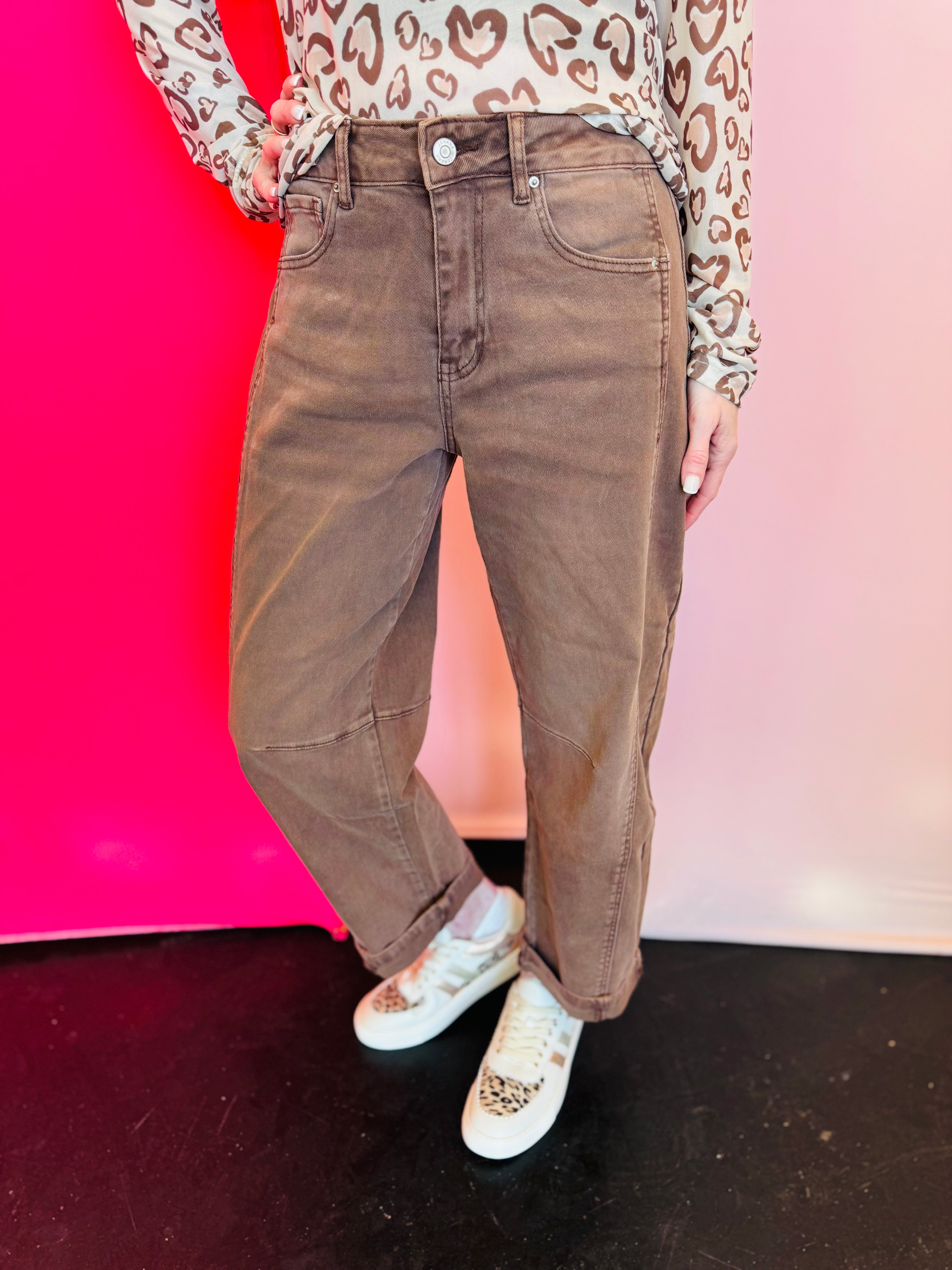 With a 10.5” front rise and 25.5” inseam, these pants sit comfortably at the waist and hit at the perfect cropped length for pairing with sneakers, sandals, or ankle boots. The 16” leg opening keeps the look breathable and easy, making them ideal for all-day wear. The rich brown tone adds a neutral yet elevated touch, perfect for styling with cozy knits, graphic tees, or tailored blouses.