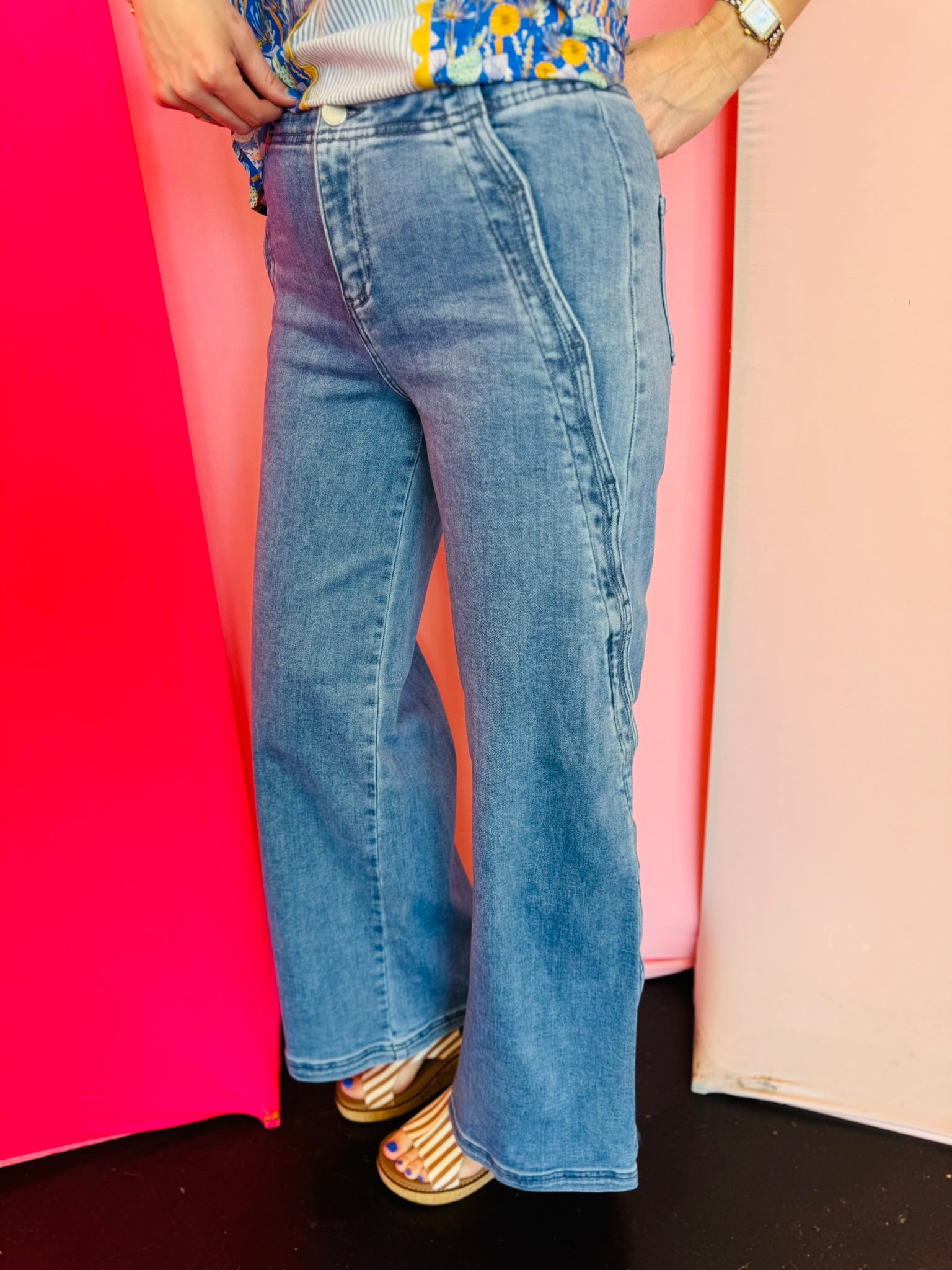 Looking for jeans that are classic, flattering, and just a little different? The Risen Scallop Edge Jeans combine a timeless wide-leg silhouette with a feminine detail that sets them apart from everyday denim.