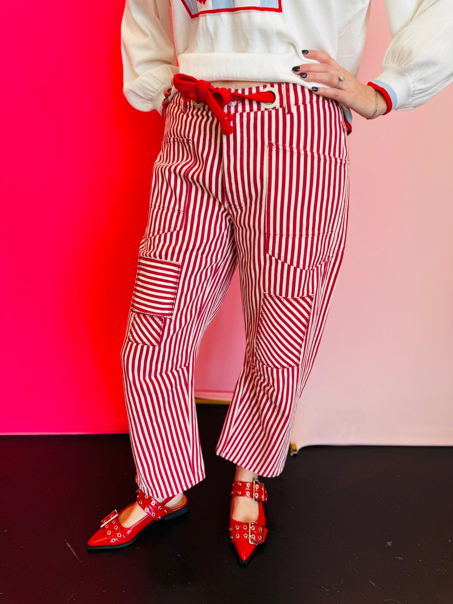 Red Striped Twill Barrel Pants