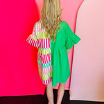 Say hello to your new warm-weather obsession — the Green New To Town Dress, a breezy, feel-good essential made for sunny days and effortless charm. Crafted from 100% lightweight cotton, this dress keeps you cool, comfortable, and stylish whether you’re headed to brunch, shopping at Tootsie Lou’s, or enjoying a weekend getaway. The eye-catching half-solid, half-striped pattern brings playful texture and a standout touch that makes this dress truly unique.