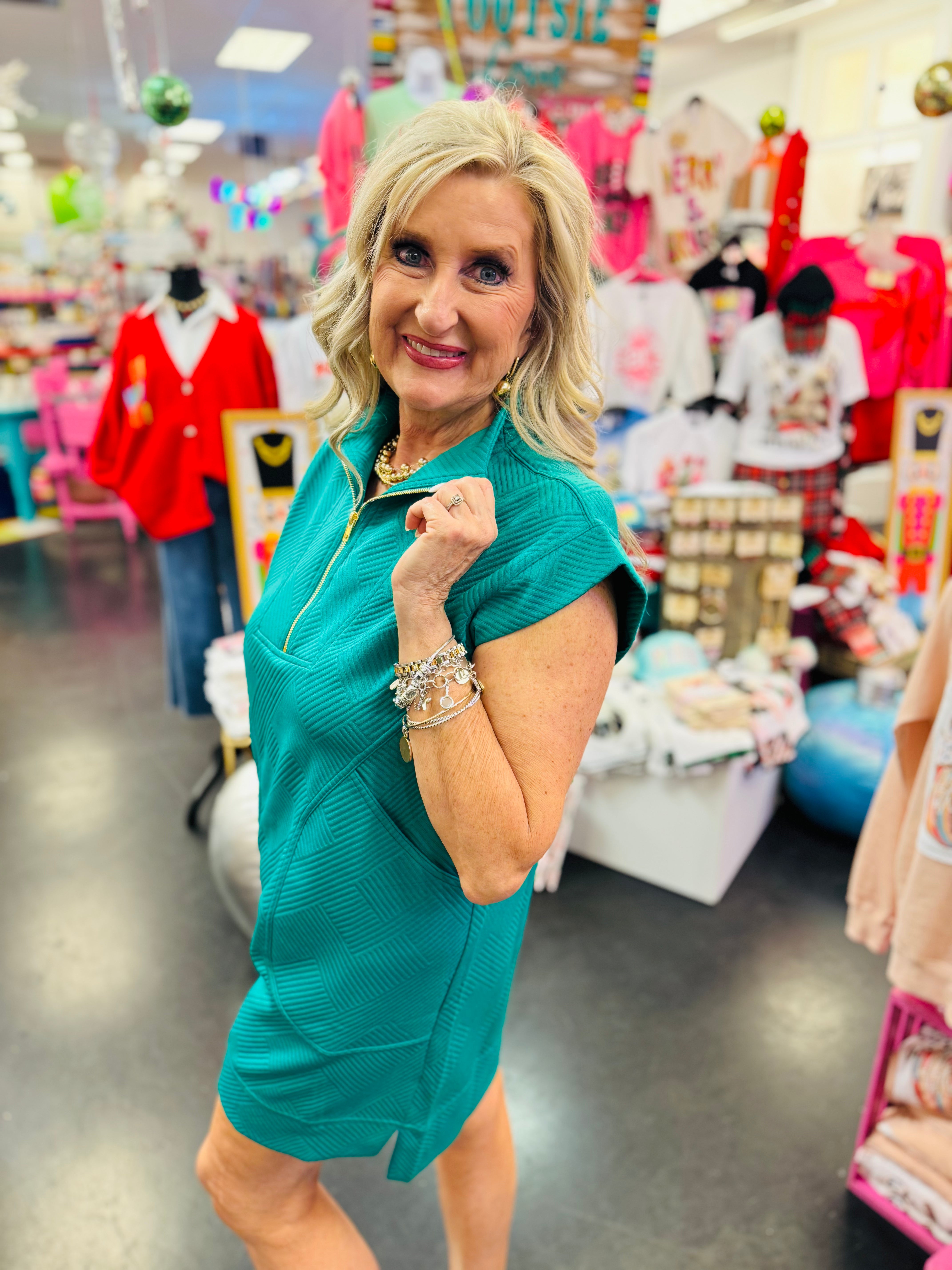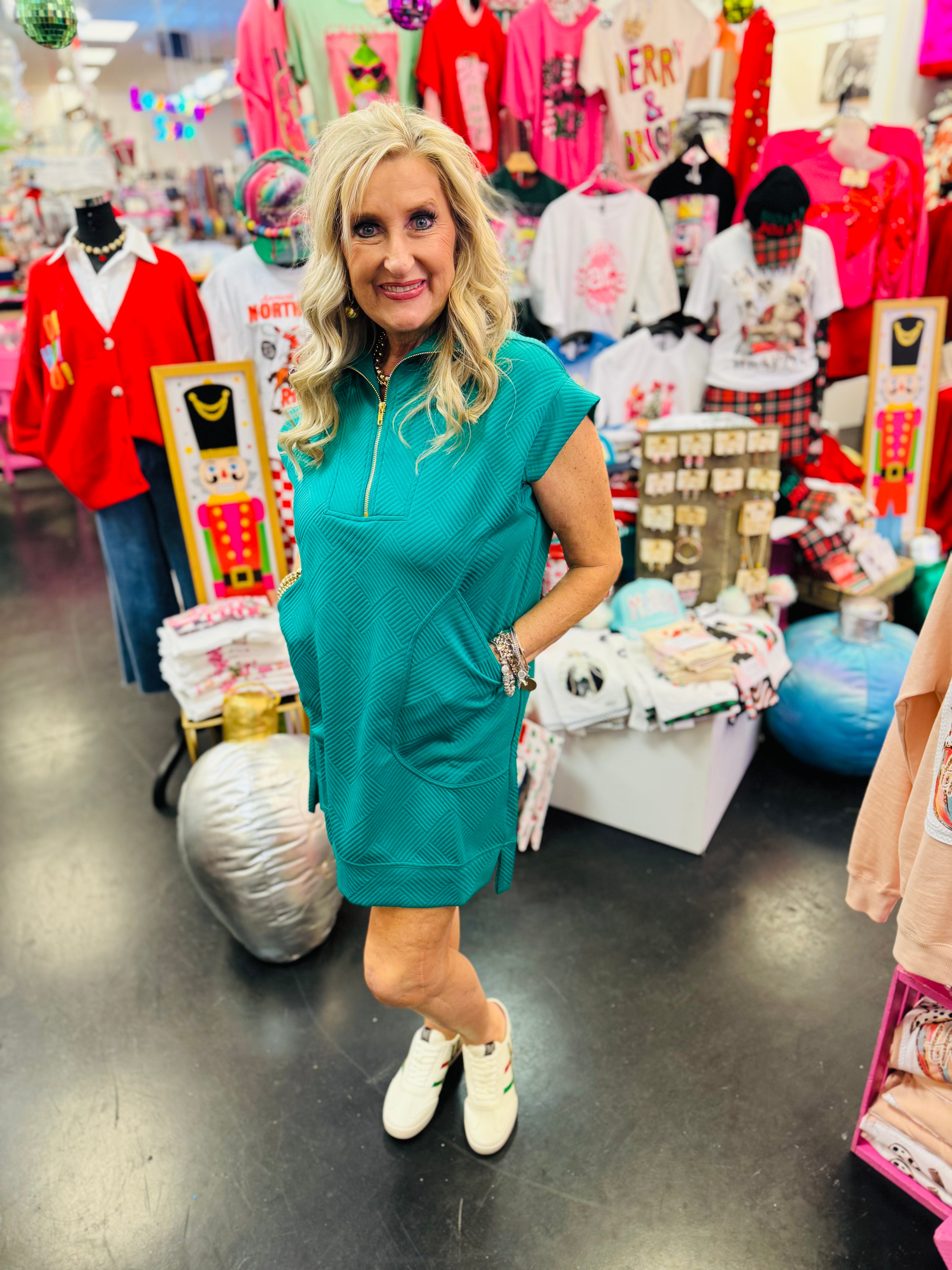 Step out in chic comfort with our Kelly Green Quarter Zipper Mini Dress, a textured knit jacquard piece designed for modern style. This versatile mini dress features a sophisticated quarter-zipper neckline, allowing for adjustable styling. Practical side pockets add a touch of functionality, while the trendy high-low hem and side slits ensure easy movement and a flattering silhouette. With a chest measurement of 44" (approx. from Small), this dress offers a comfortable yet refined fit. It provides both comfort and subtle stretch, perfect for any occasion, transitioning seamlessly from a casual day out to an evening gathering. This stylish and practical dress is a must-have for your contemporary wardrobe.